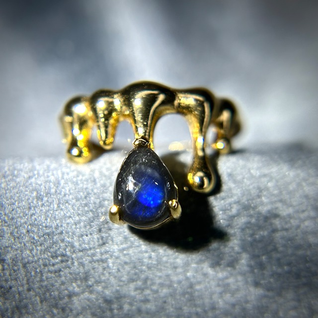 シルバー製ゴールドカラー ブラックラブラドライトのドロップリング。 サイズ調整できるデザインですが、9号~17号での使用推奨です。 ブルーのラブラドレッセンスが楽しめるブラックラブラドライトを使用。 ブラックカラーに浮かび上がるブルーの光りが幻想的なブラックラブラドライトで、 液体が滴るようなボリュームのあるデザインに怪しげにマッチしてます。 素材 シルバー925(ゴールドメッキ) 中石 ブラックラブラドライト(約6mm×8mm) 縦 約15.5mm(デザイン部分込み) 横 約19mm(デザイン部分込み) リング幅 約1.5~2.5mm サイズ 9号~17号での使用推奨 925刻印有ります。 ニッケルは使用していませんので、ニッケルアレルギーの方も使っていただけますが、万が一アレルギー症状が出た場合は使用をお控えください。 サイズ調整は変形や石外れの原因になる場合がありますので、少しづつ調整して下さい。 メッキ加工されてる商品は、使用状況で変色等ある場合があります。 天然石使用及びハンドメイド商品は、内包物、細かい傷、多少の歪みなどある場合あります。 写真はなるべく実物に近くなるように心掛けてますが、主観などにより違って見える場合があります。