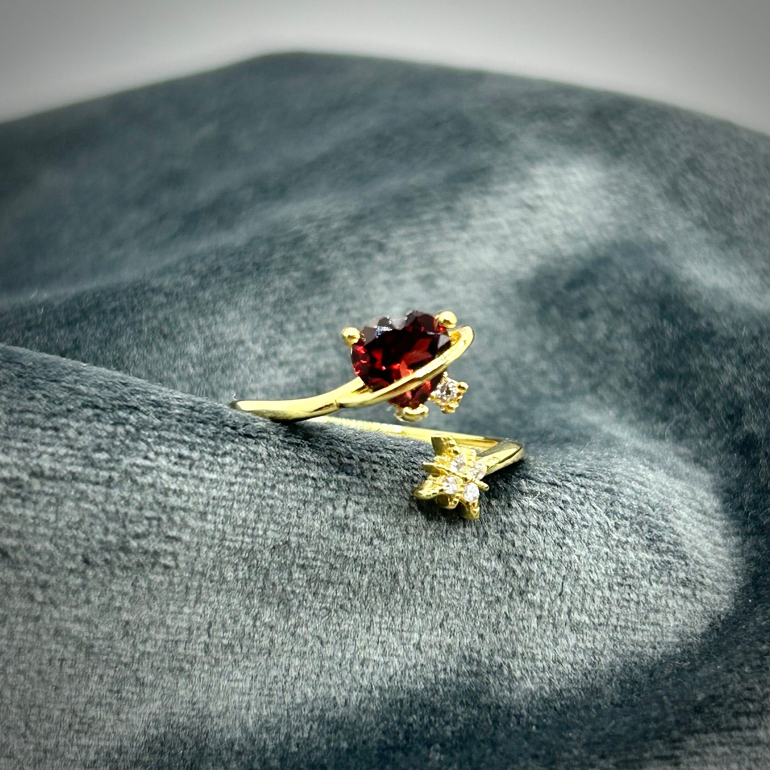シルバー製ゴールドカラー ガーネット ハートフォークリング 1月誕生石 9~16号での使用推奨
