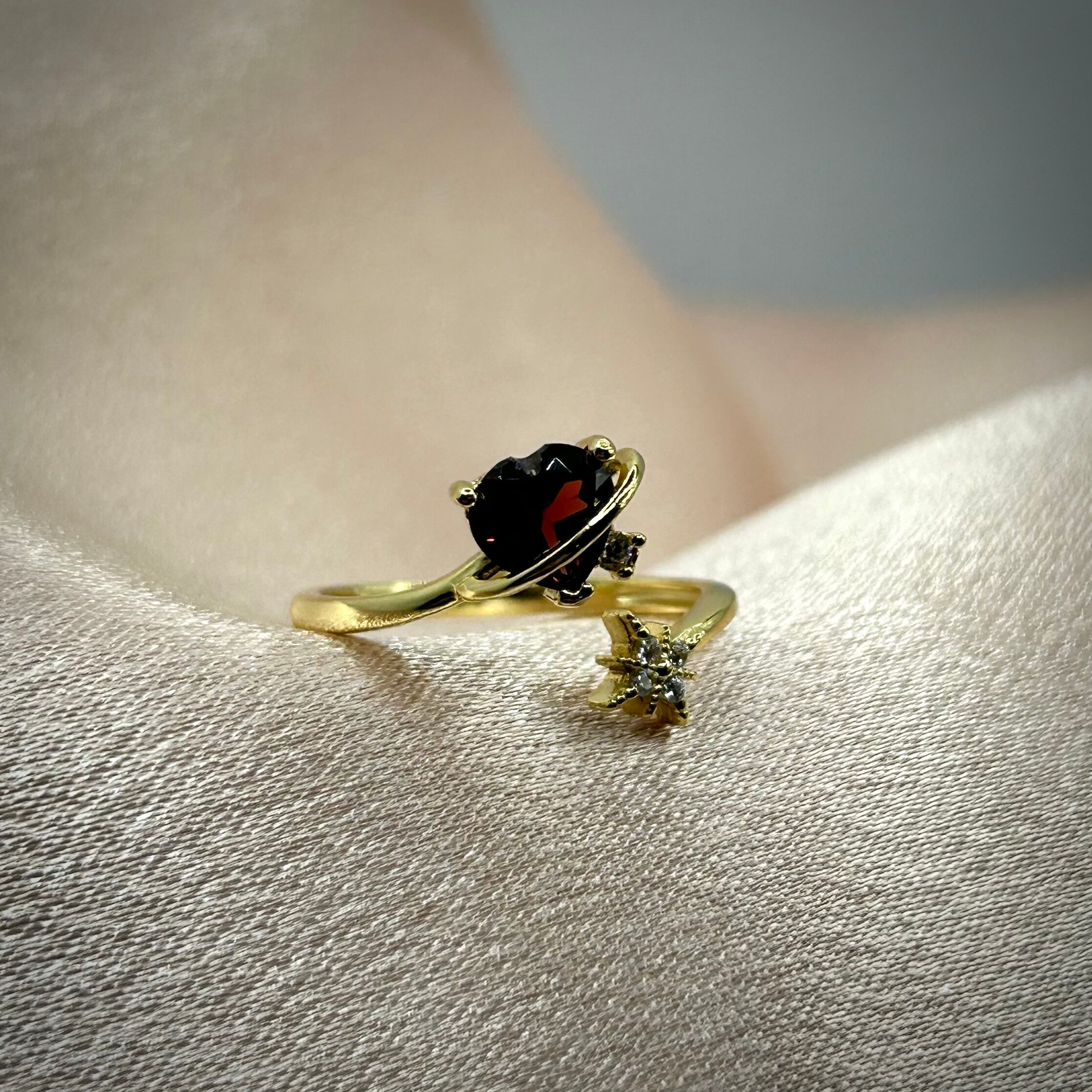 ハートシェイプが可愛い印象ですが、レッドカラーのガーネットとゴールドカラーを合わせることでクールな美しさを感じるリングです。