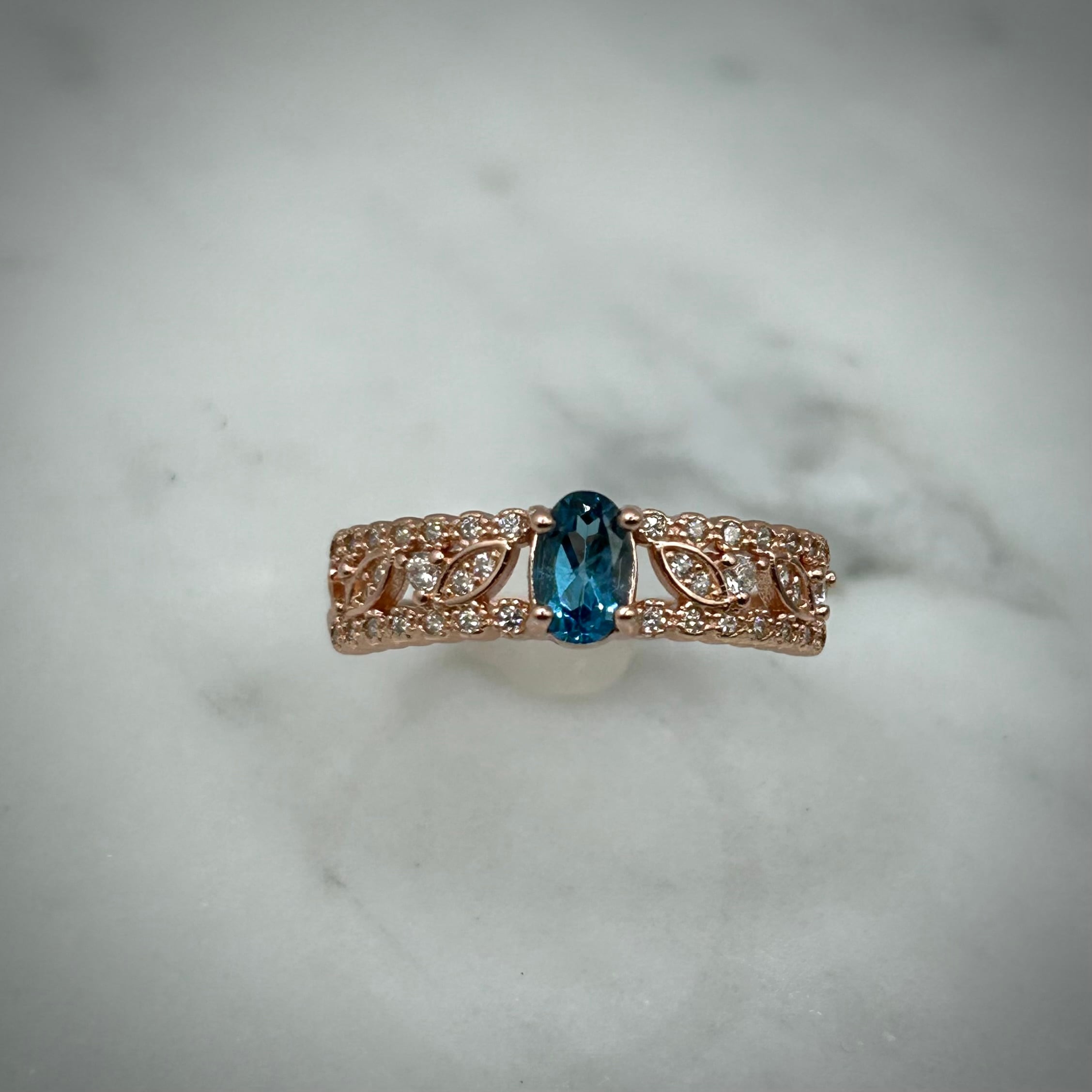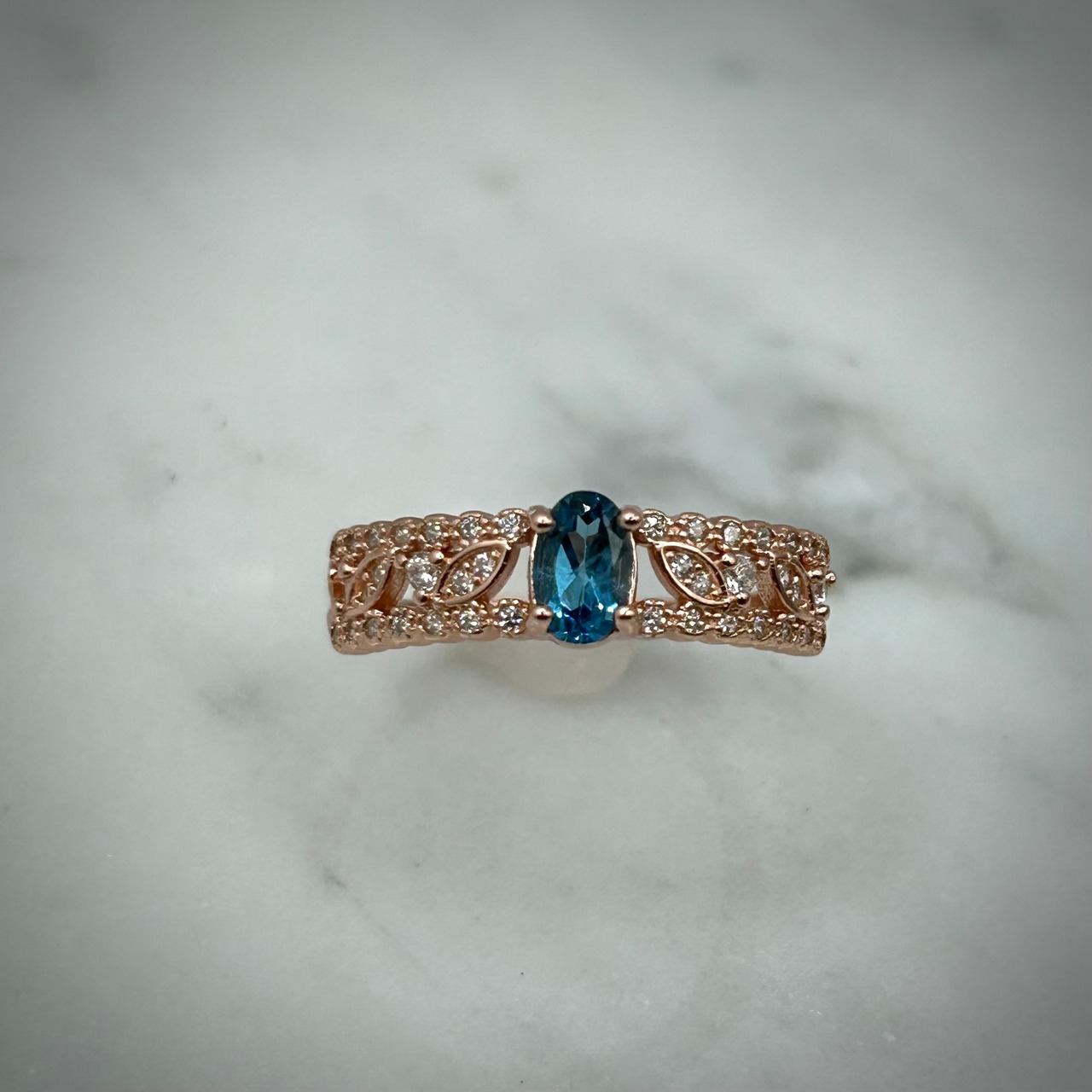 シルバー製ピンクゴールドカラー、ロンドンブルートパーズのスカルプチャーリング。