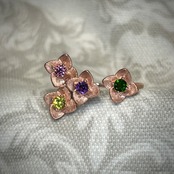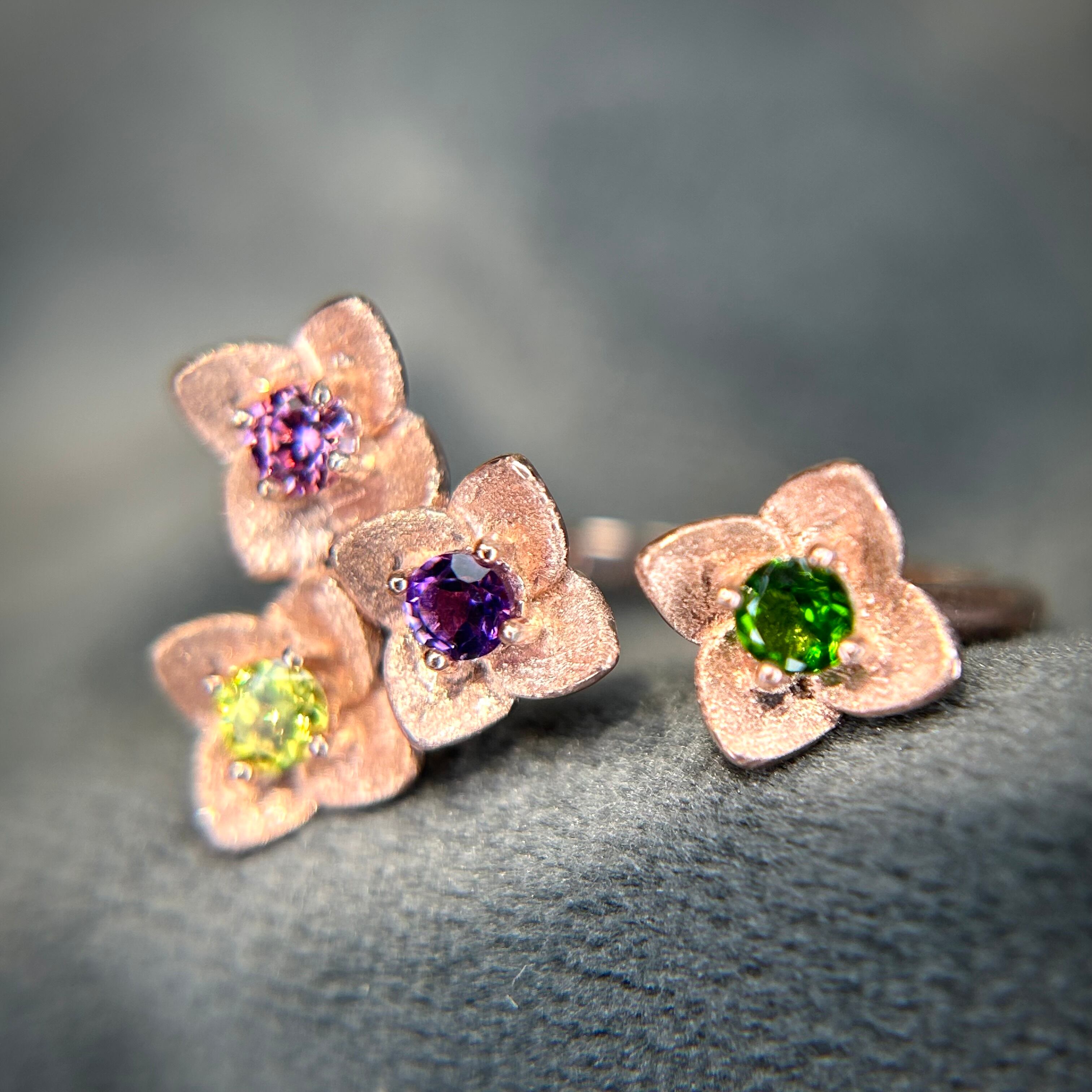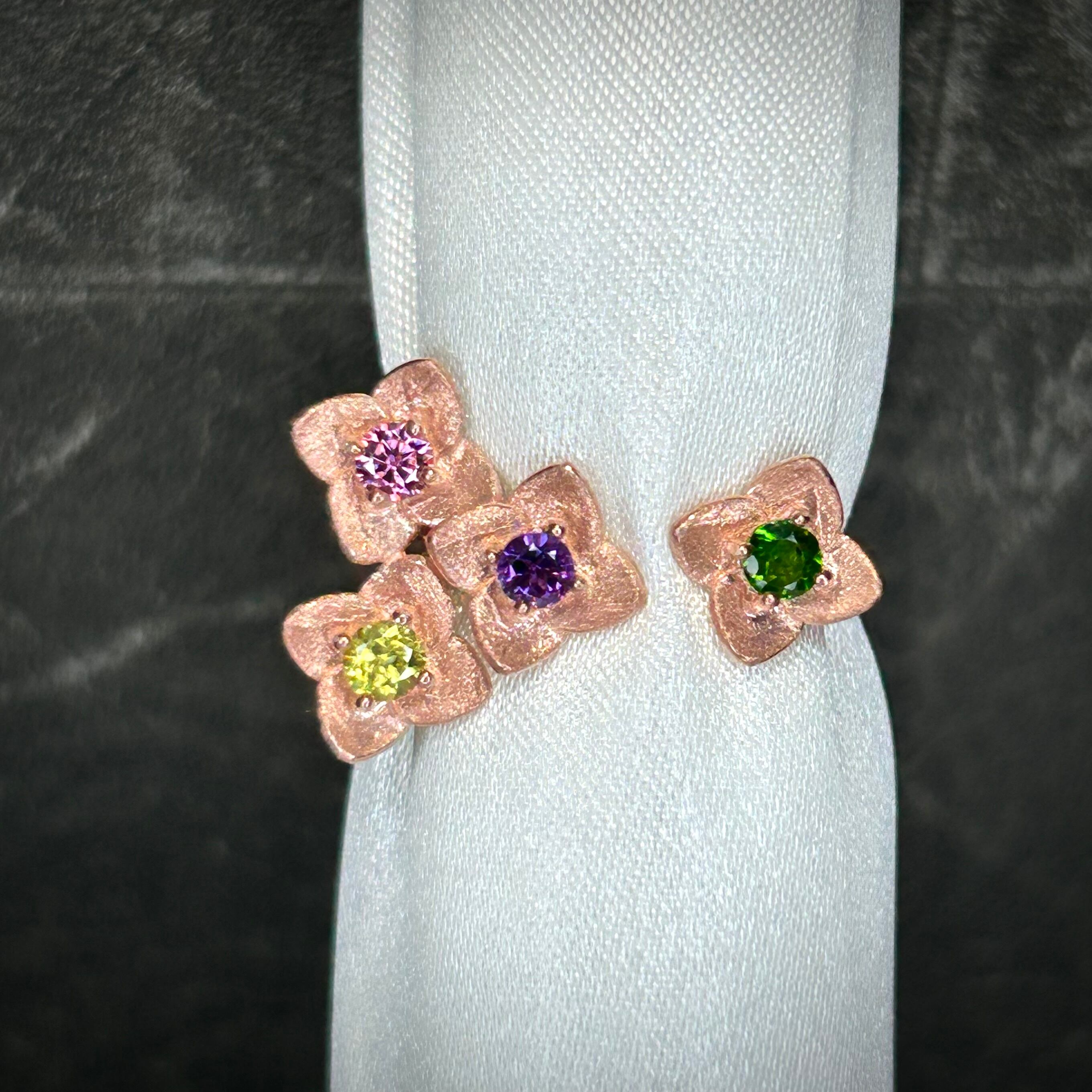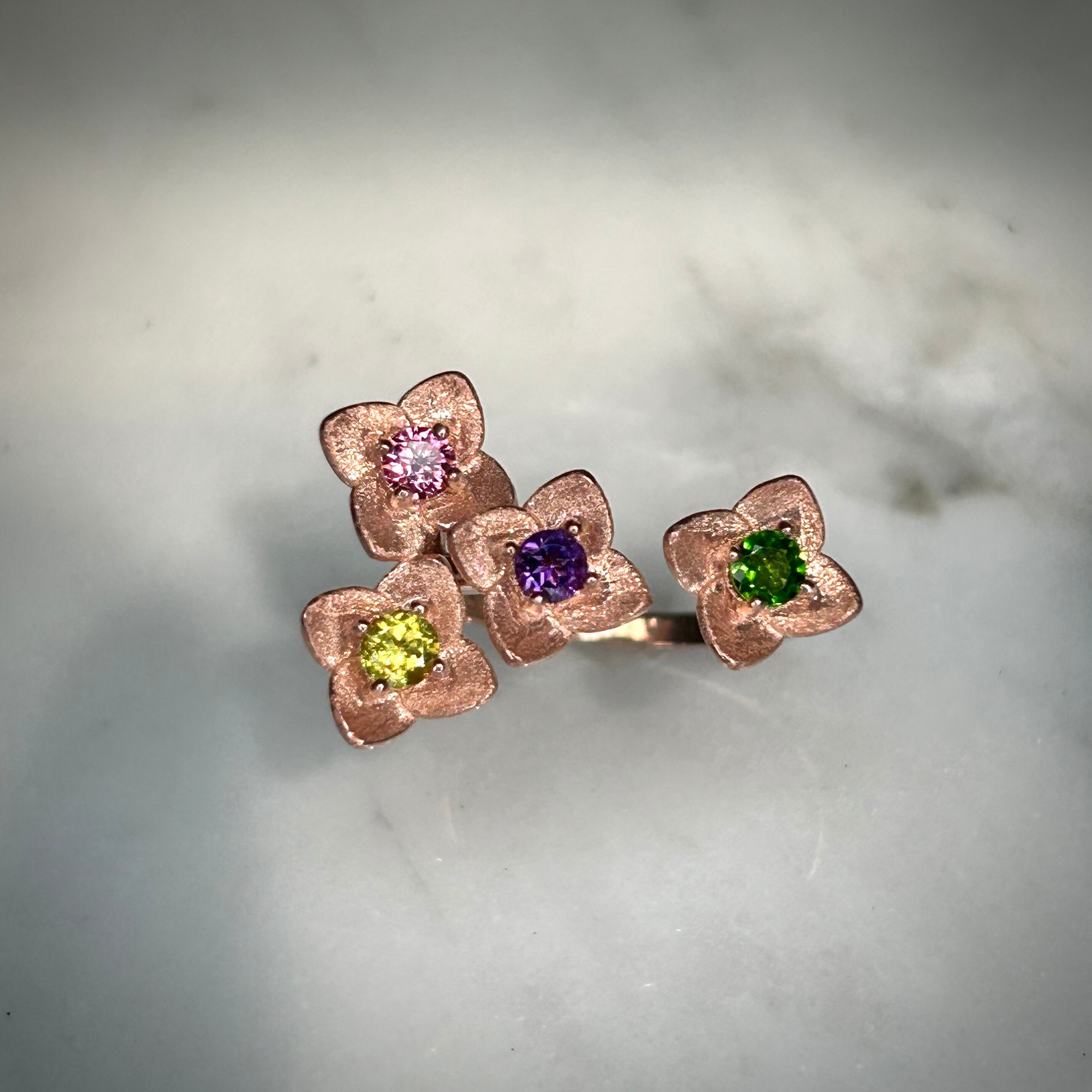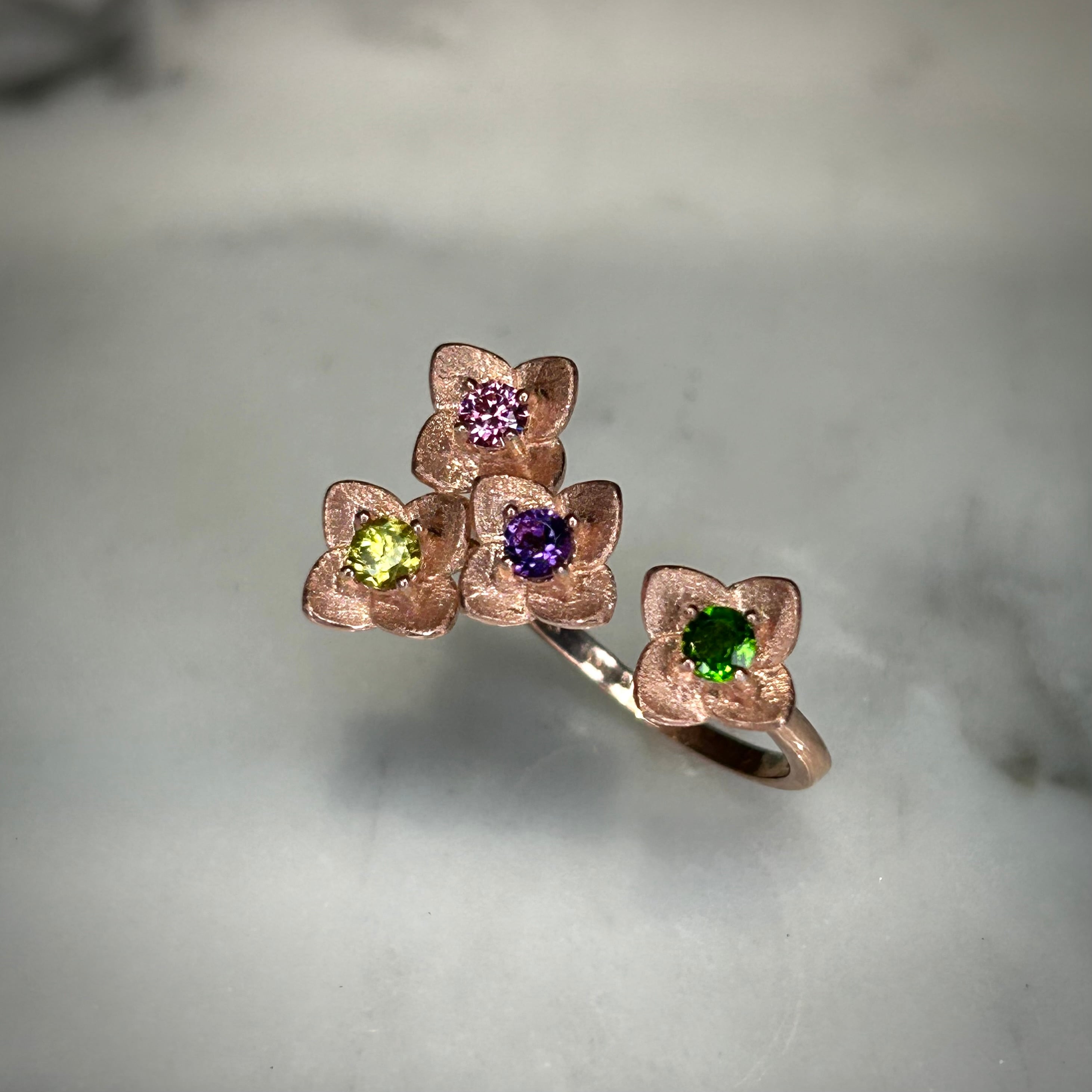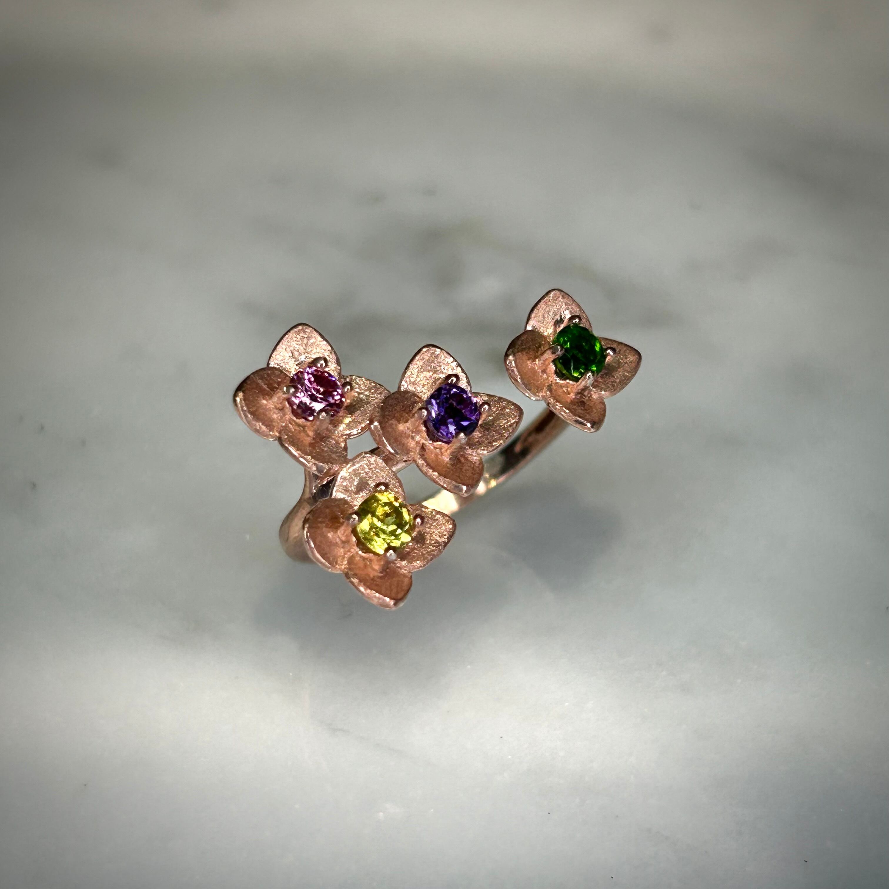 シルバー製ピンクゴールドカラー マルチストーンのフラワーリング。