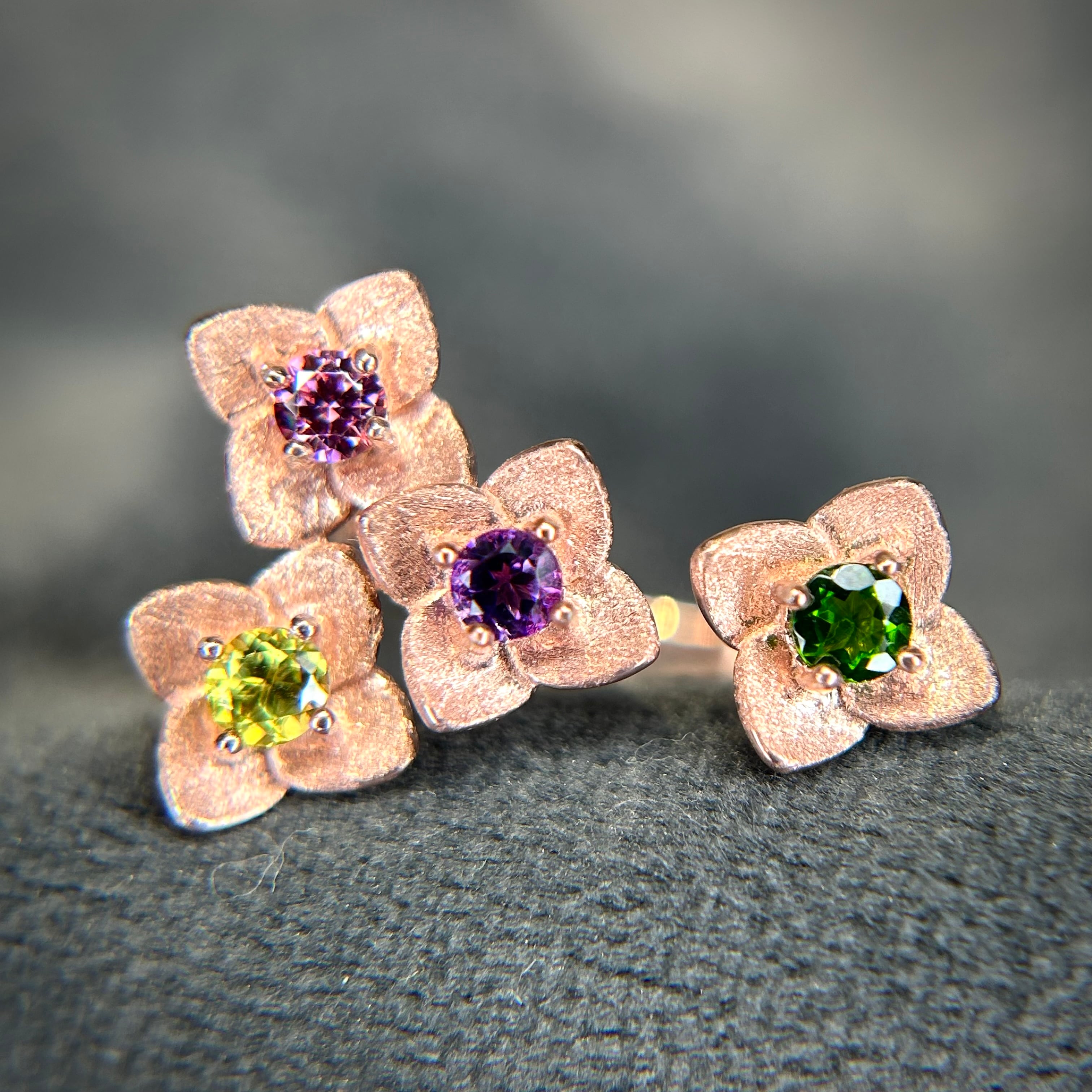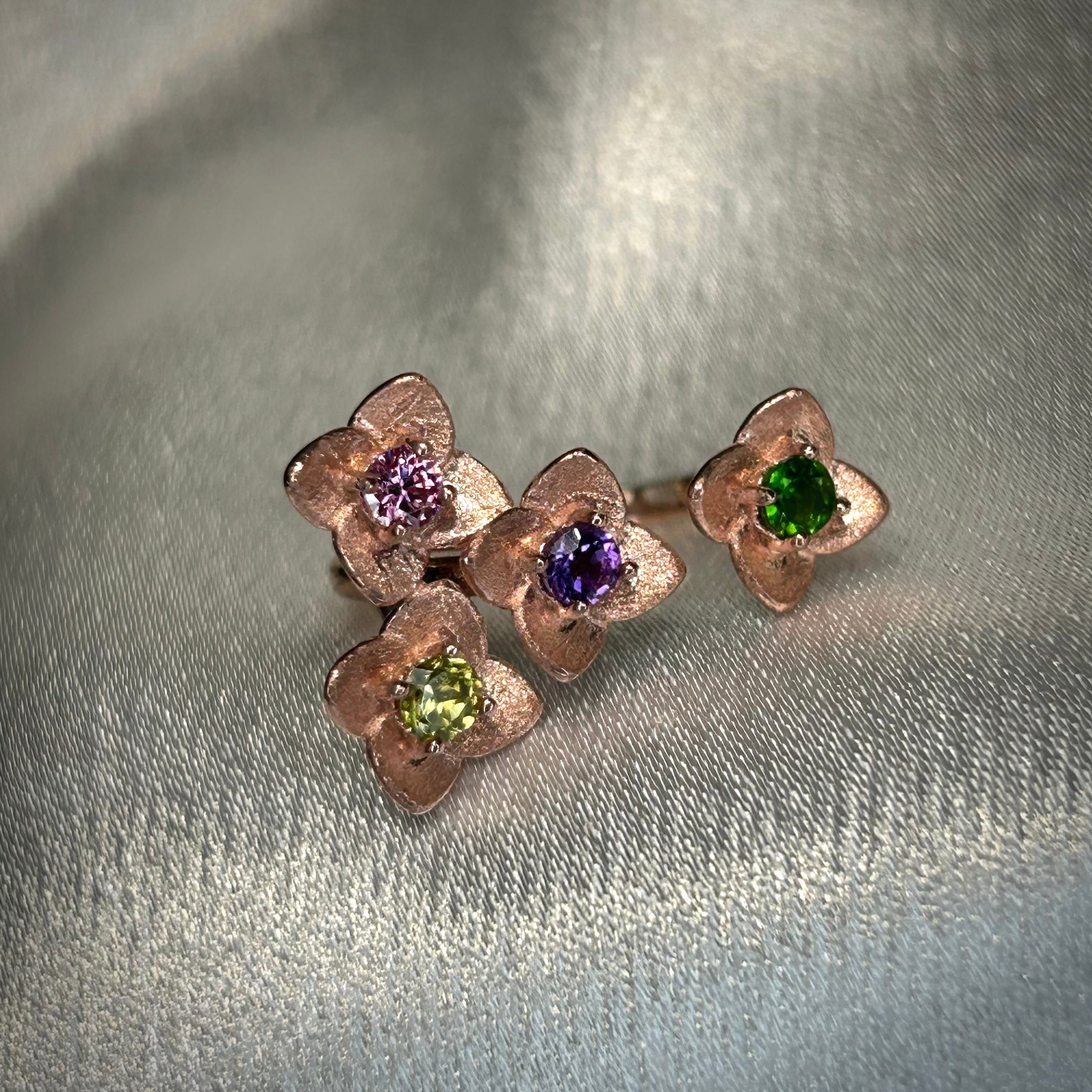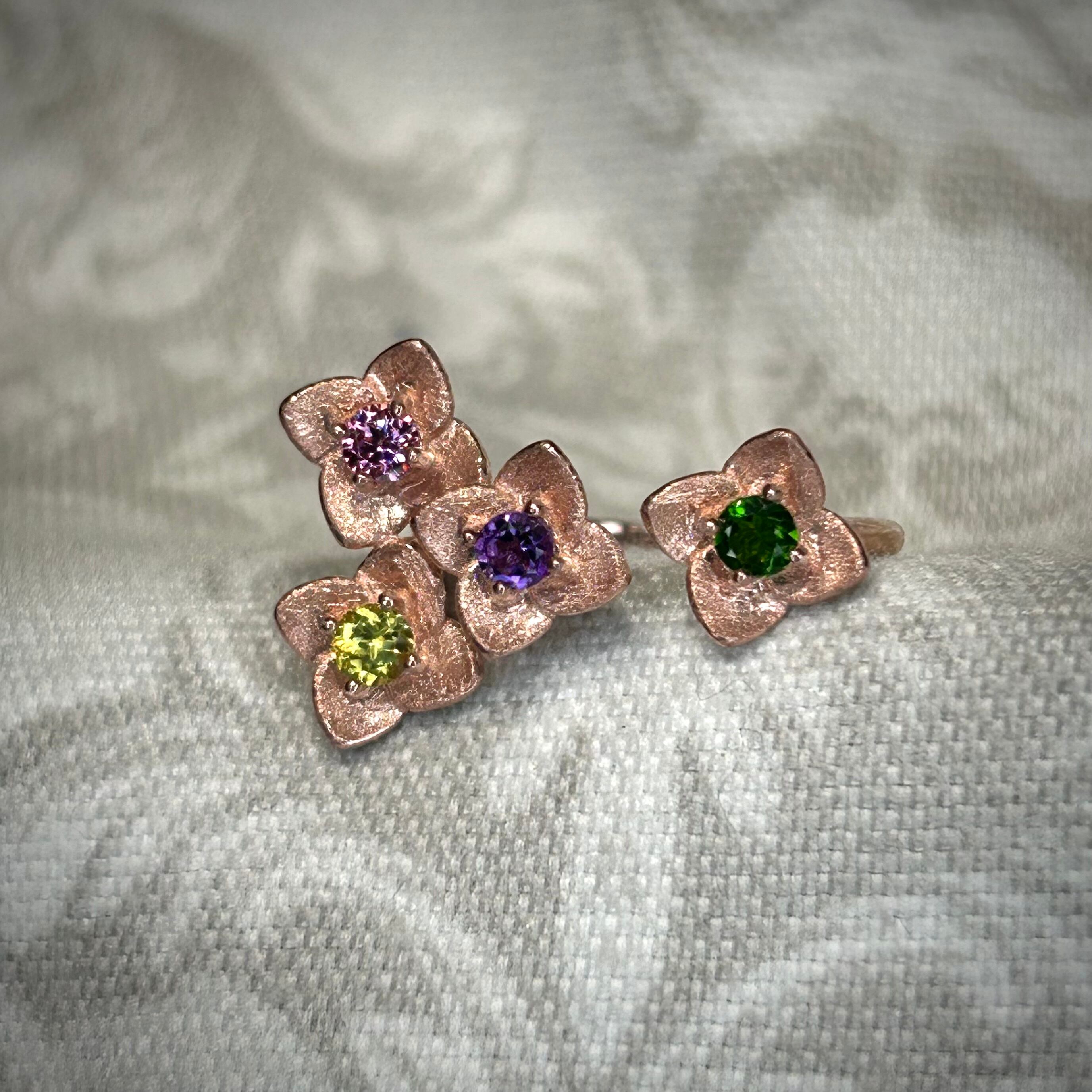 4石共に異なる石を使用し、可愛く咲く花が集まる個性的な雰囲気のリングとなりました。