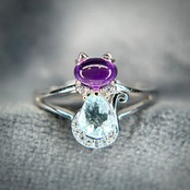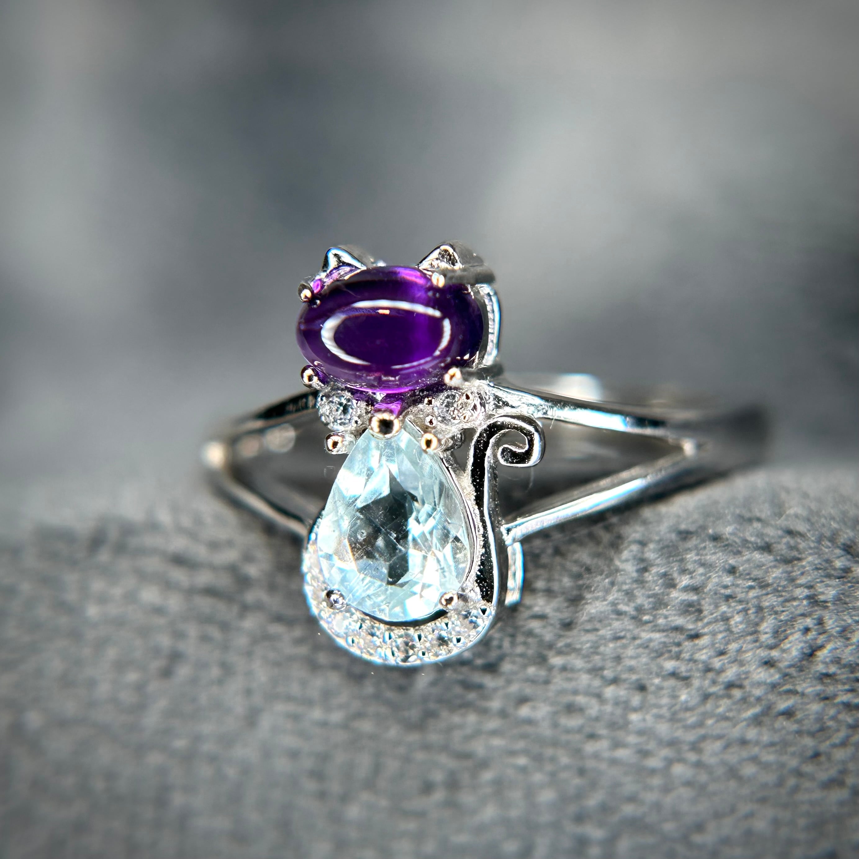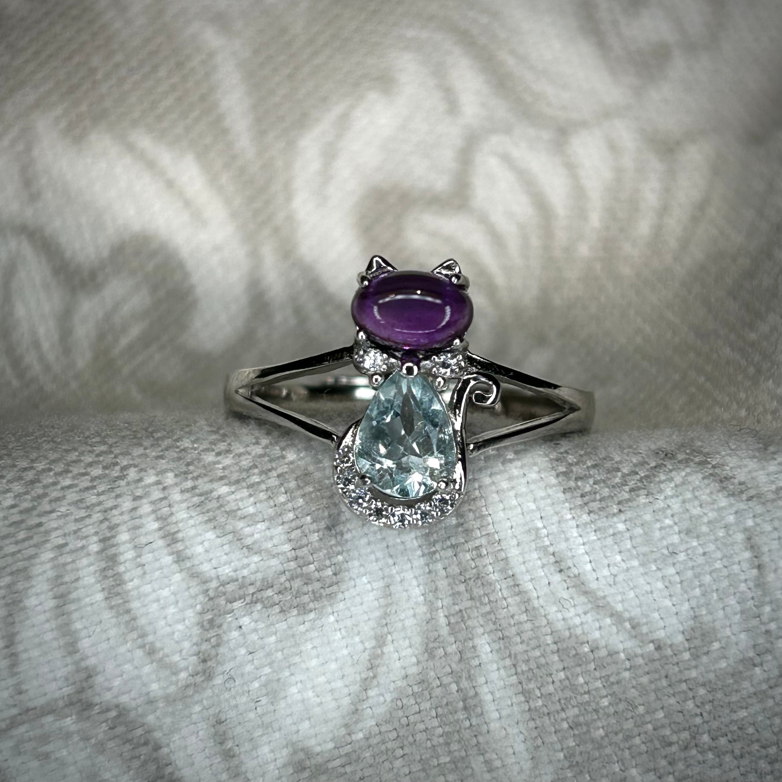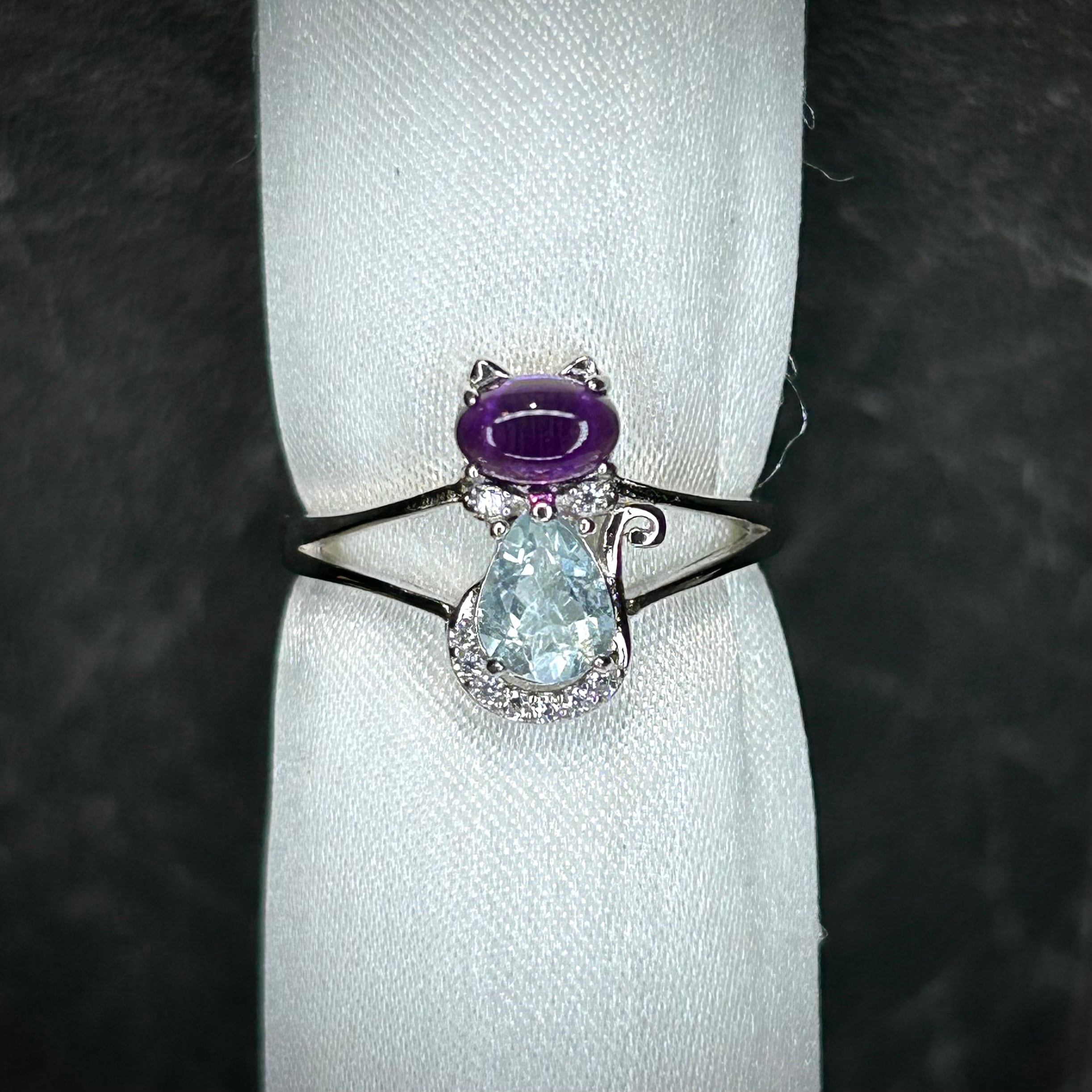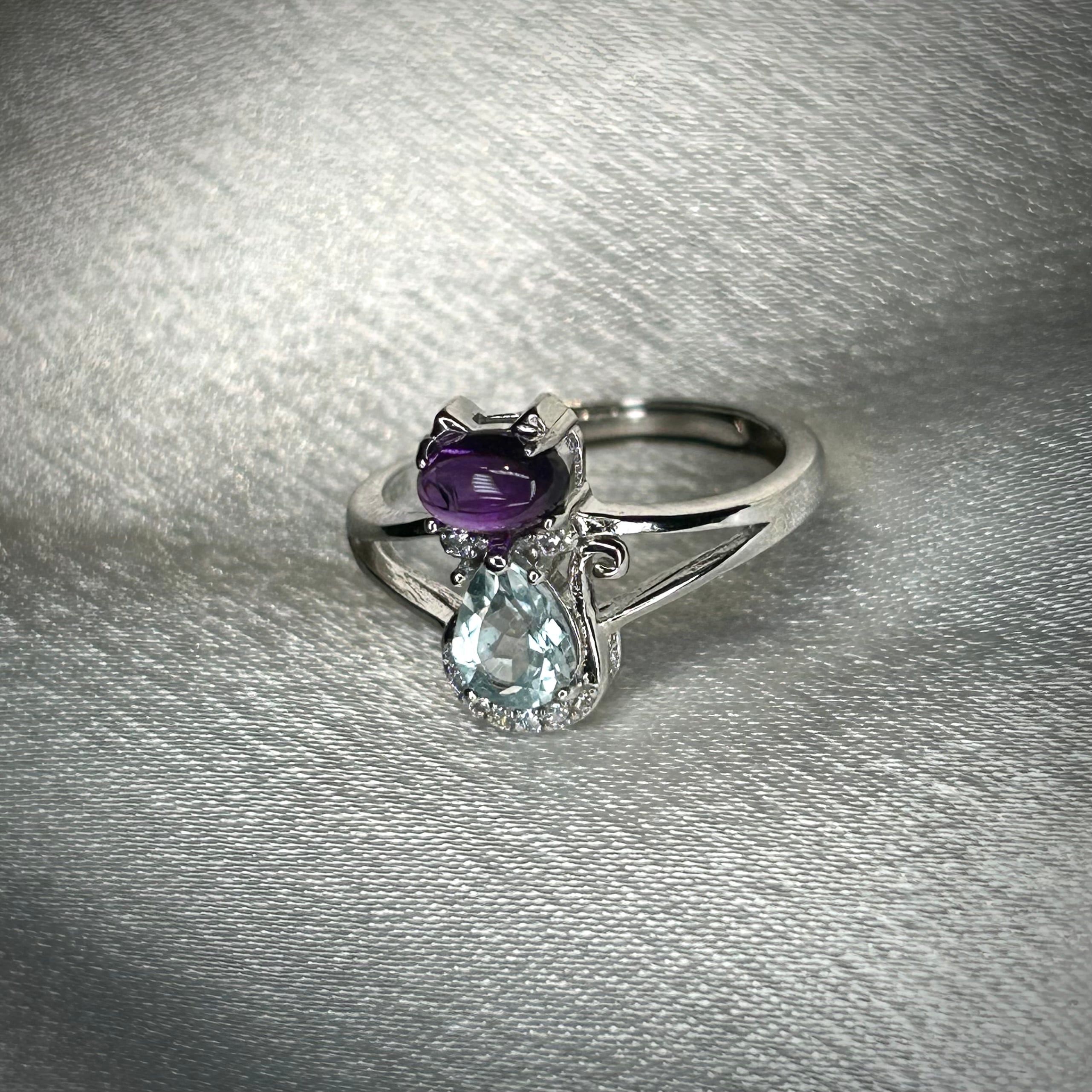 シルバー製、アメシスト&アクアマリンのお洒落ミニネコリング。
