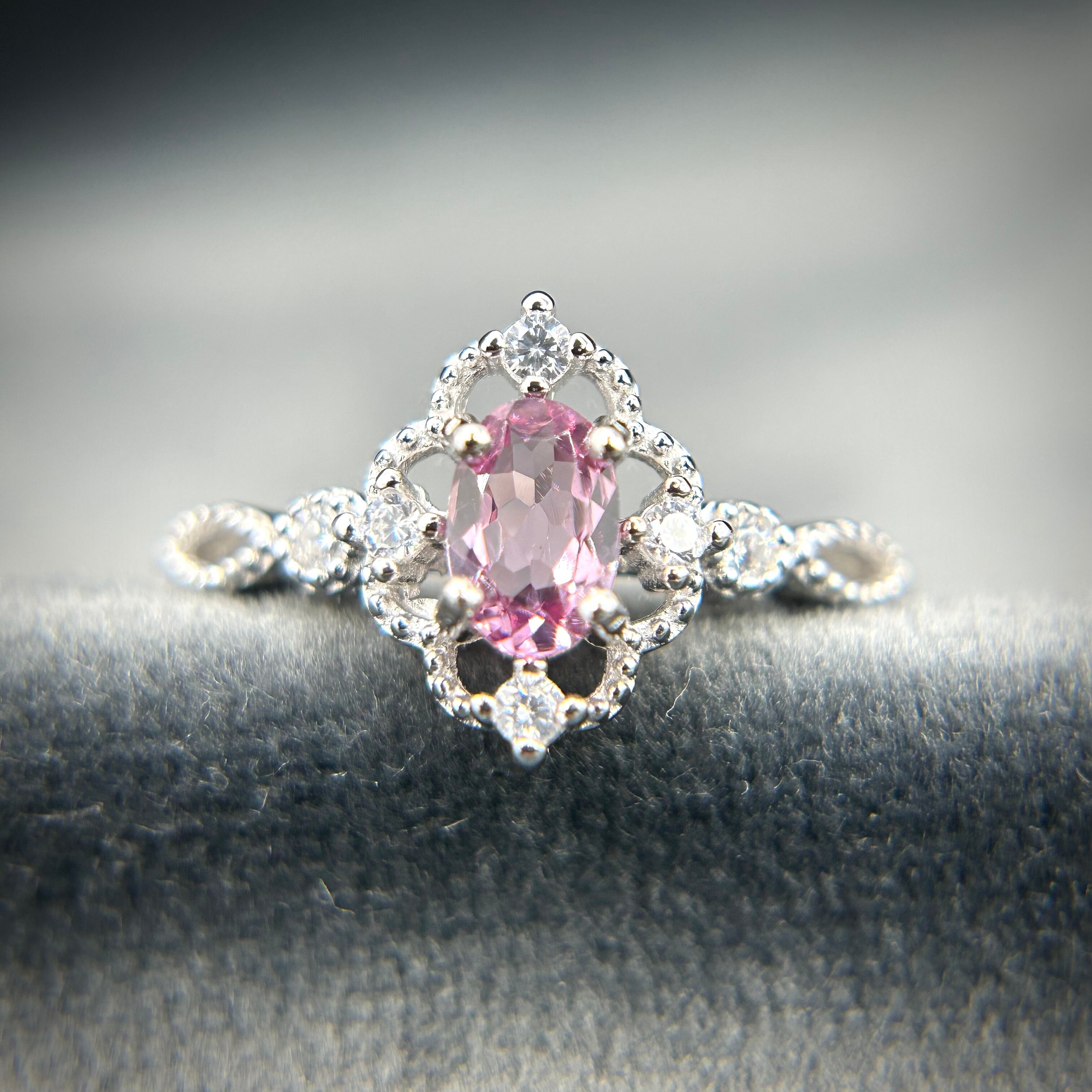 淡いピンクカラーで当たる光りによりカラーシフトするガーネットを使用。