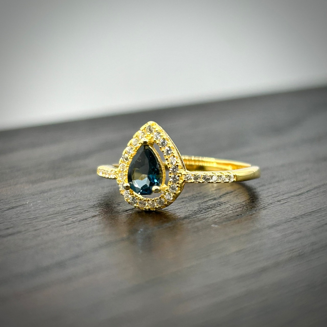 シルバー製ゴールドカラー、ロンドンブルートパーズのドロップ型リング。