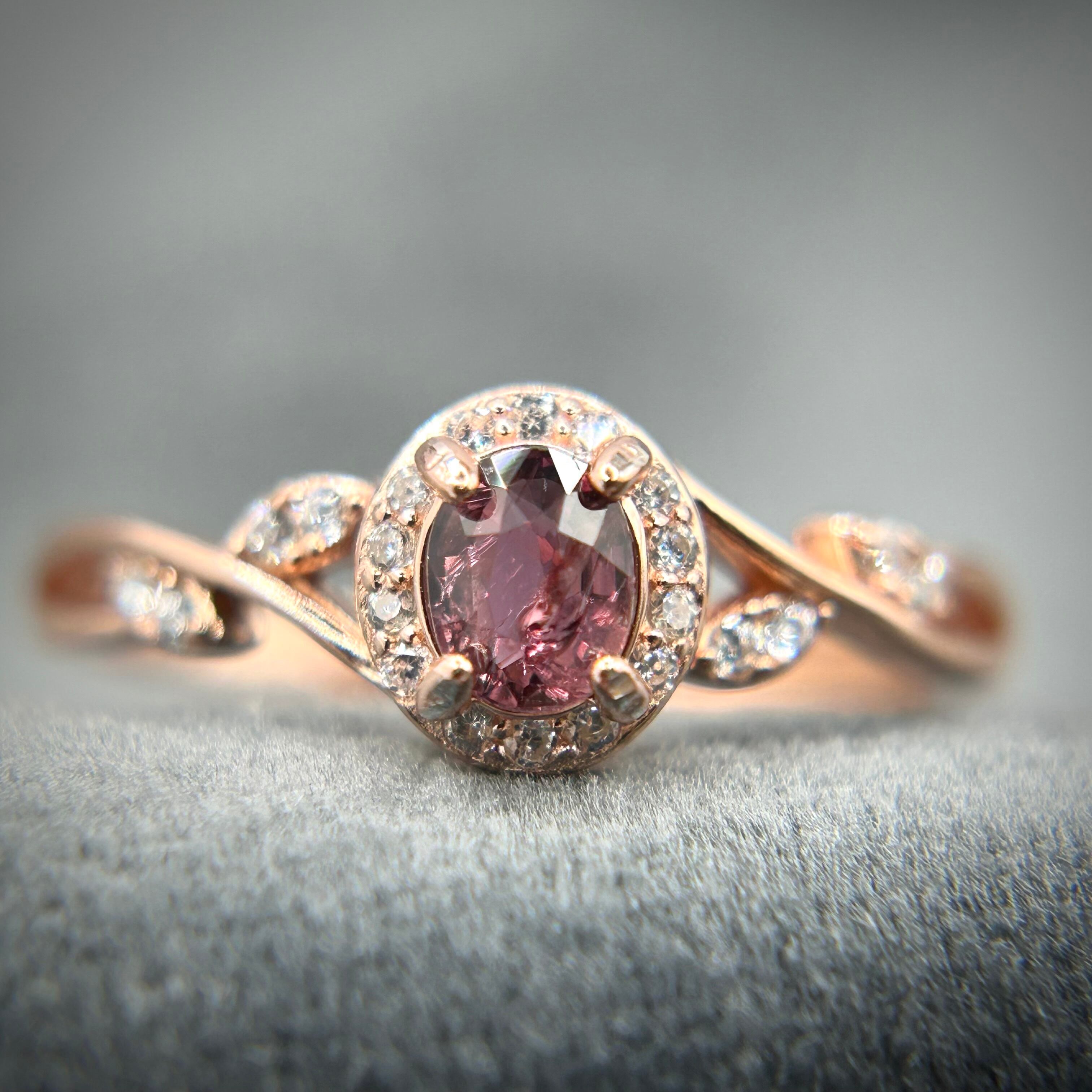 内包物などもみられ、一見シックなカラーに見えますが、暖色系の光りを当てると明るいピンクカラーが楽しめるサファイアです。