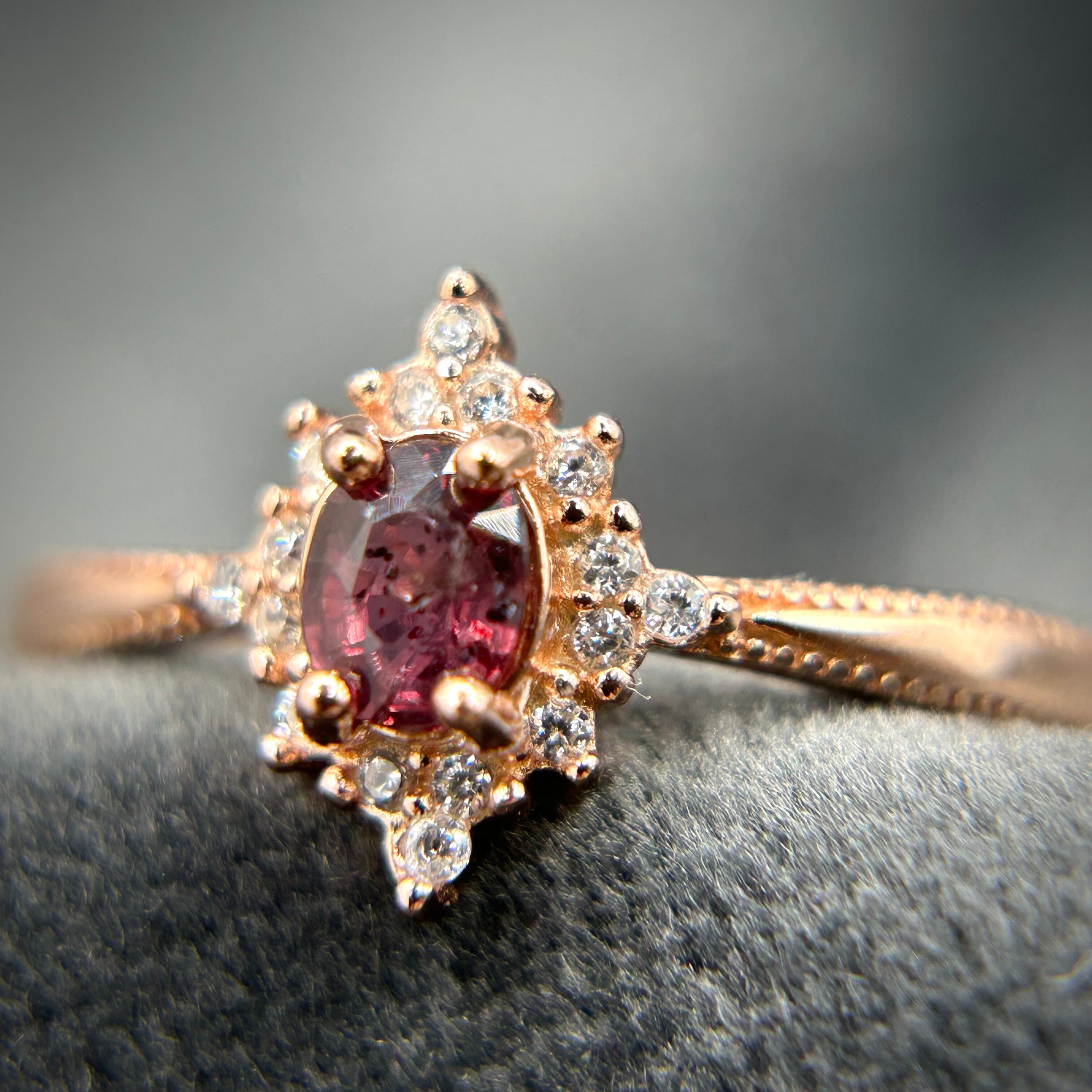 レッドカラーに見えるサファイアが落ち着きのある雰囲気に仕上がったリングです。
