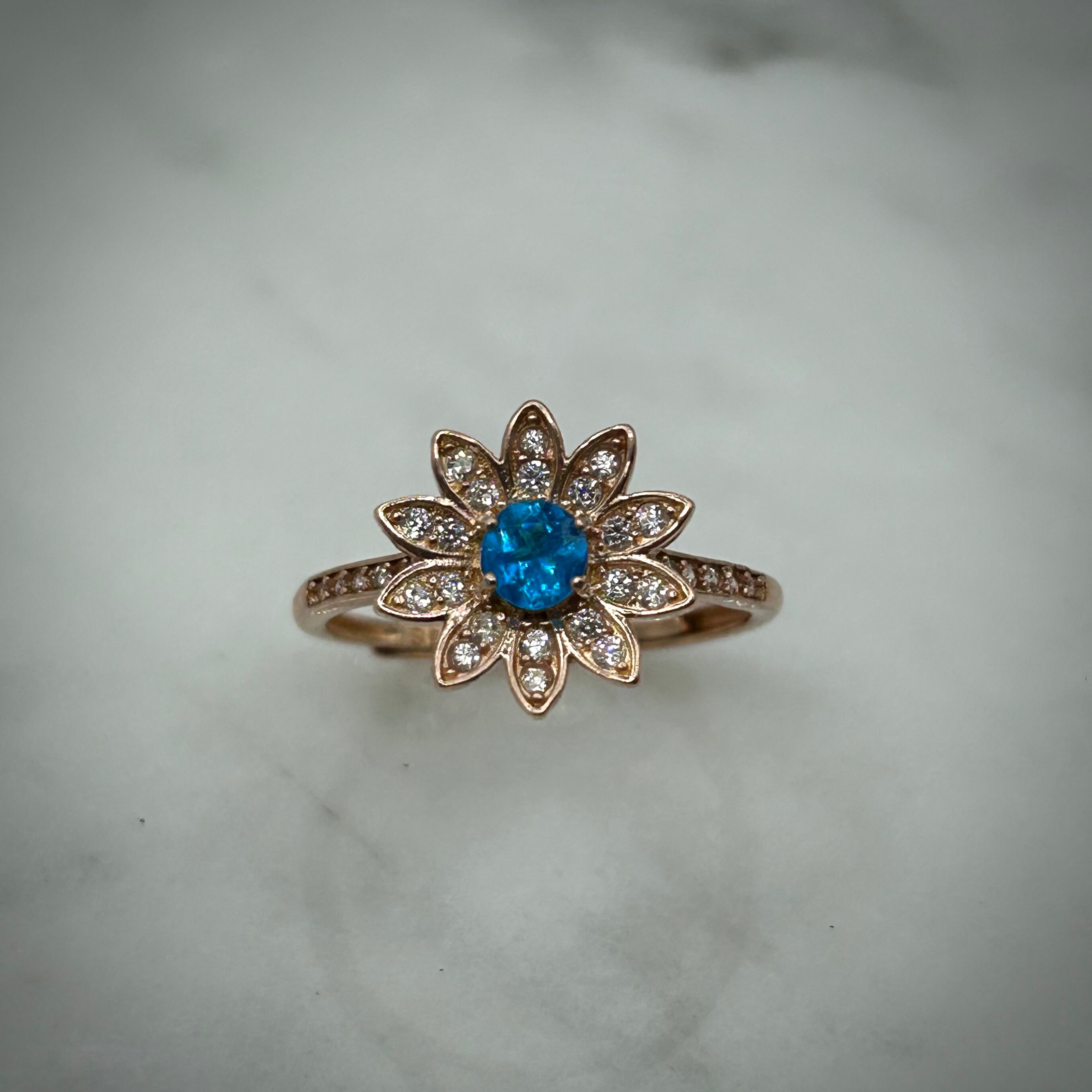 花びらと両サイドにある脇石が華やかで、可愛いピンクゴールドカラーに目を引くネオンカラーのアパタイトが素敵なリングです。