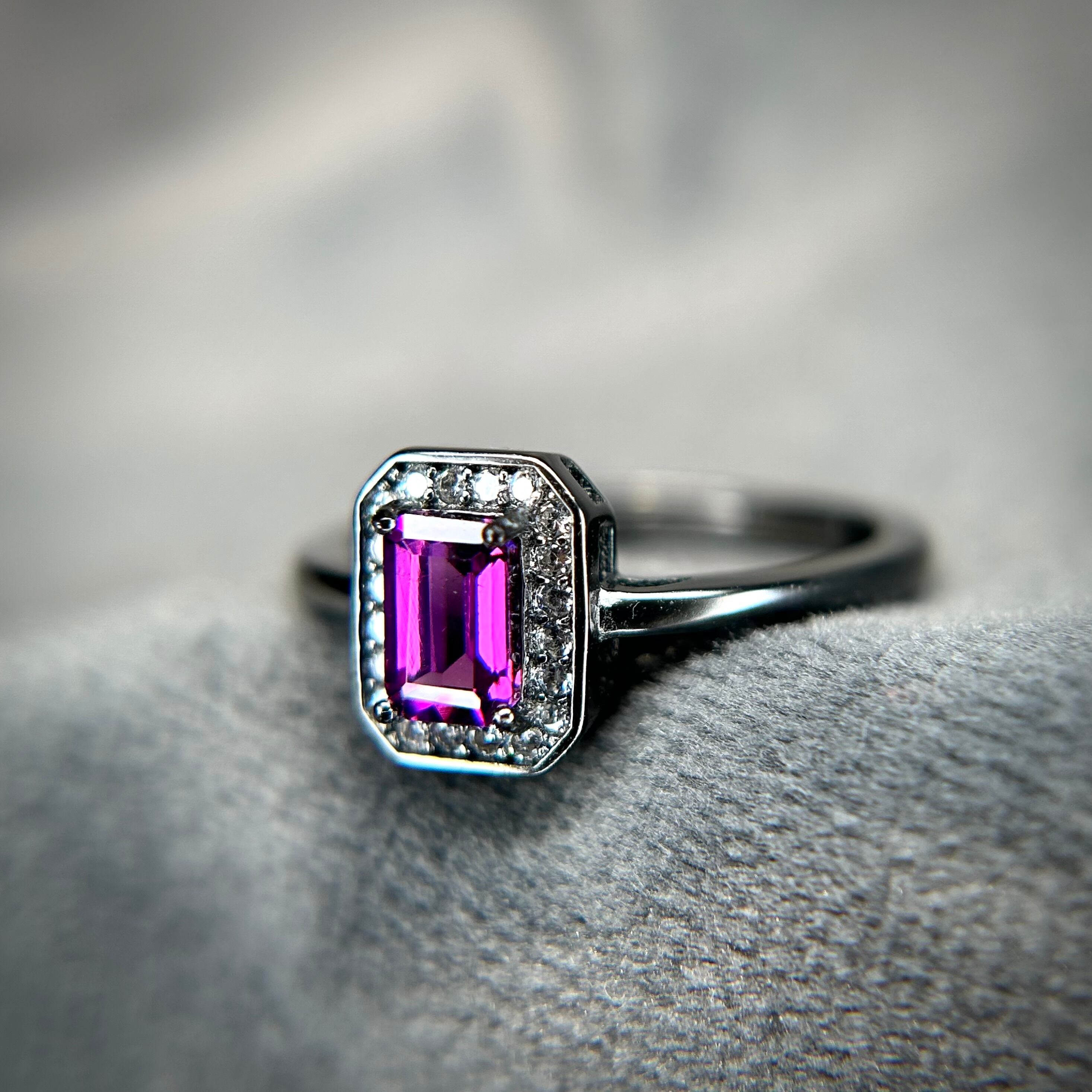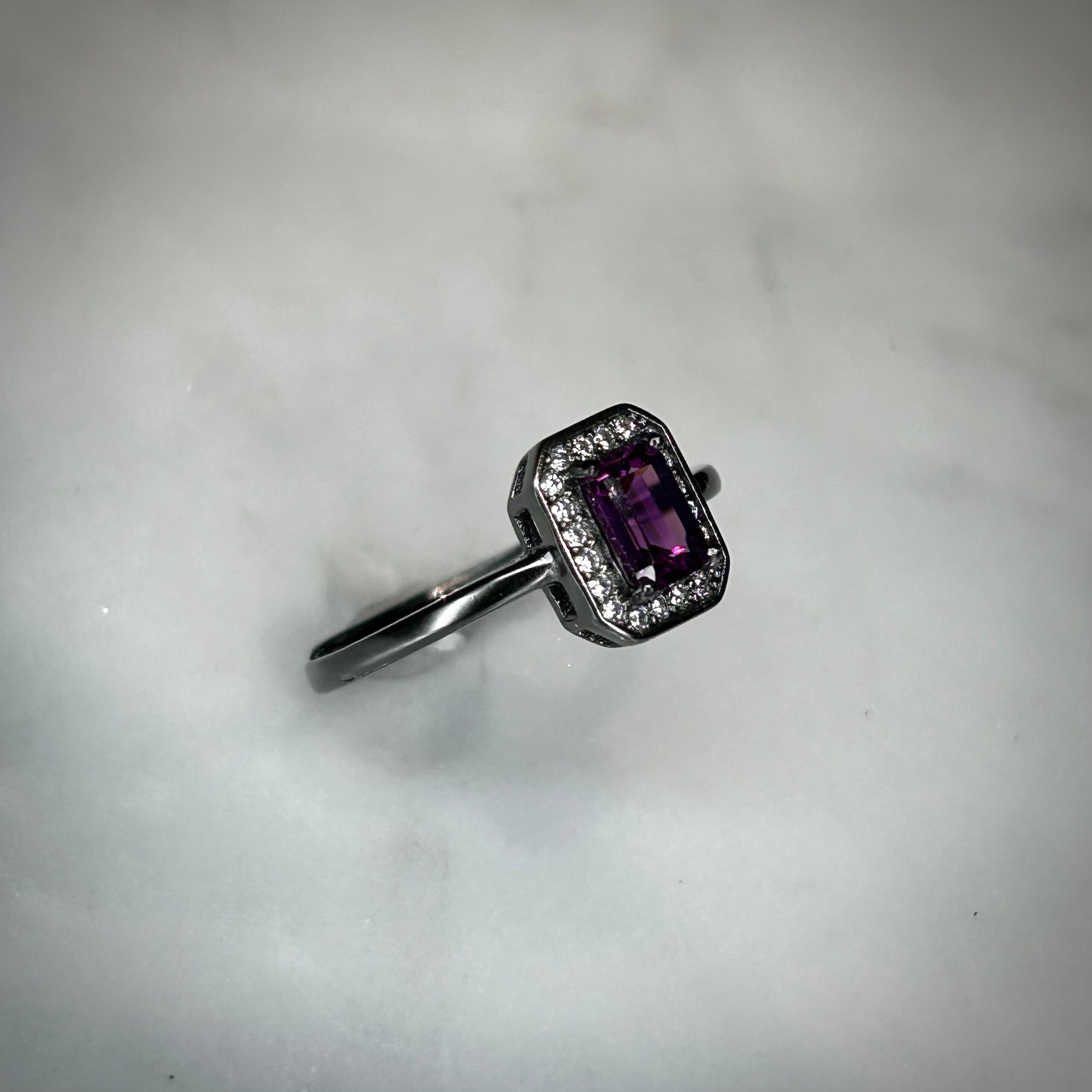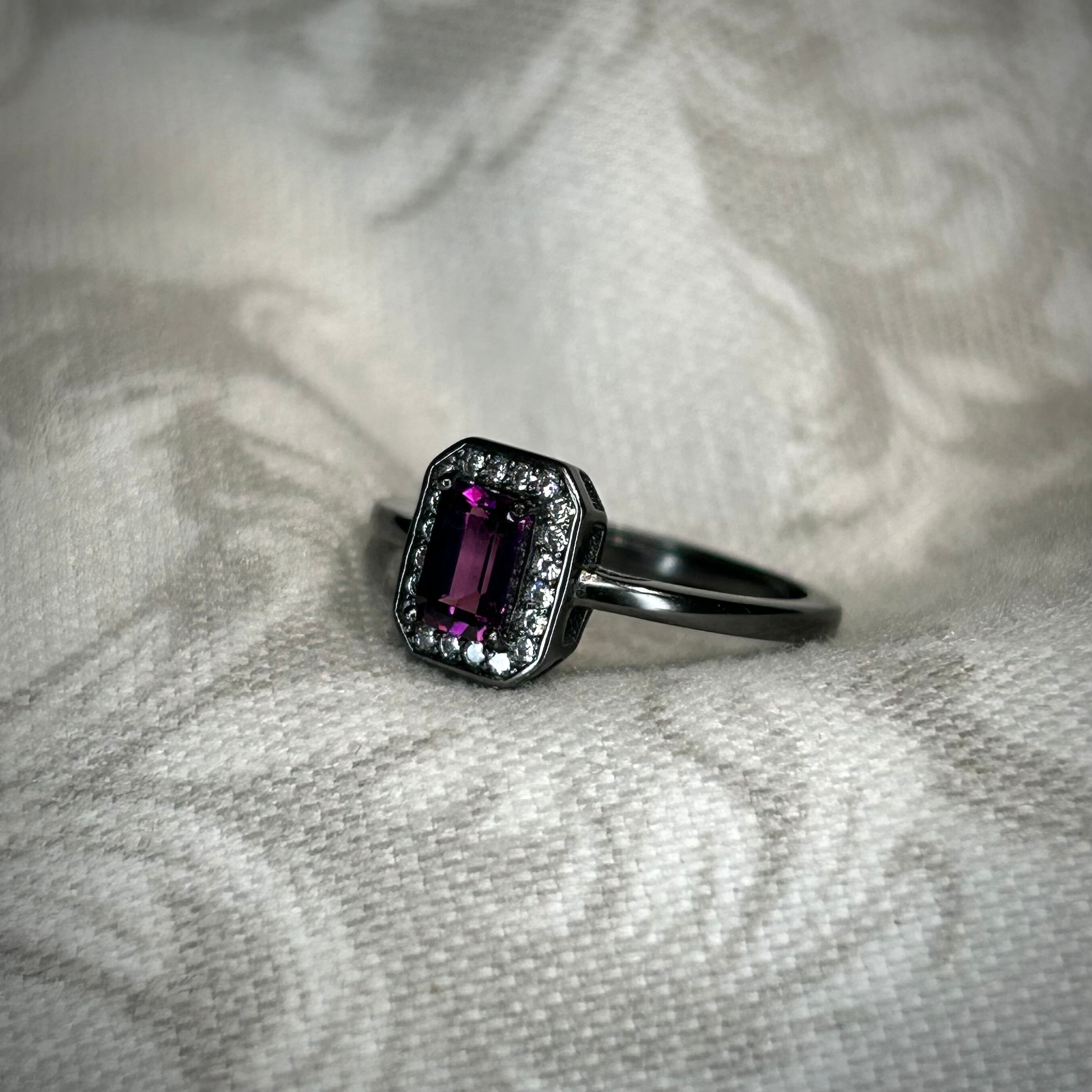 シルバー製ブラックカラー、ロードライトガーネットのレクタングルリング。