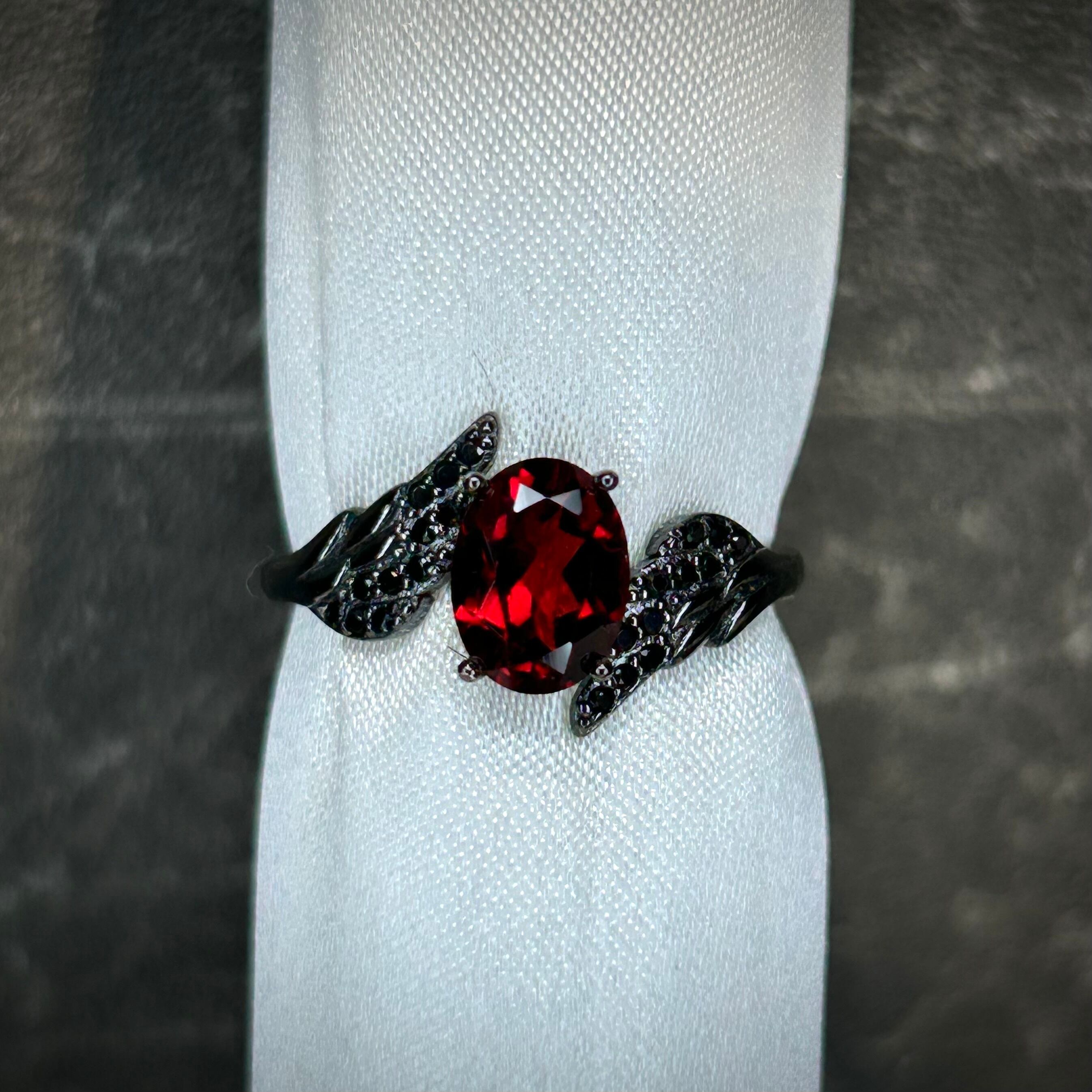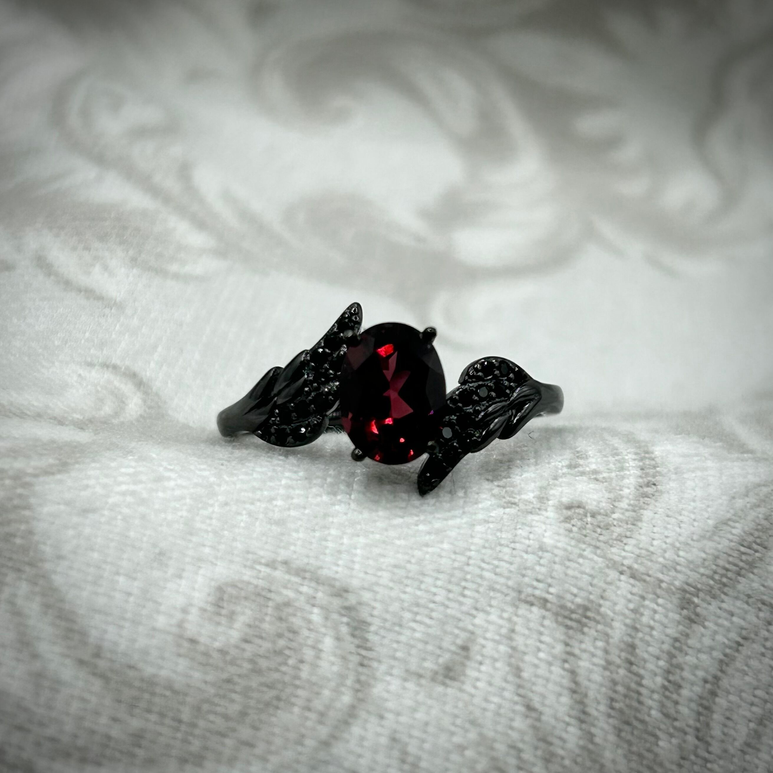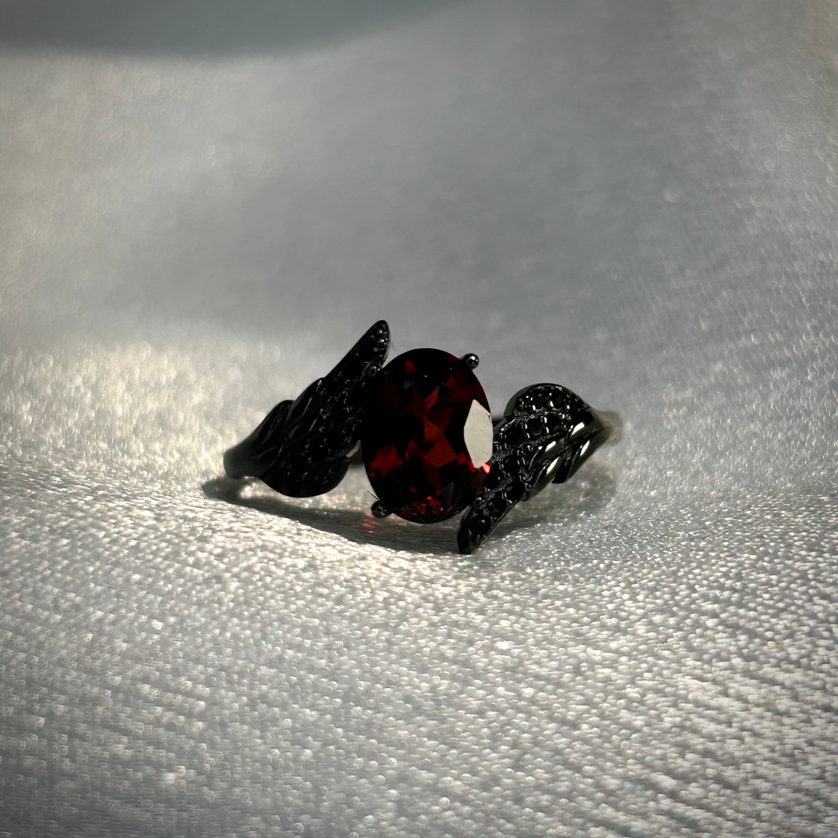 両脇のアームが羽の様なデザインで中央のガーネットがブラックカラーに煌めくリングです。