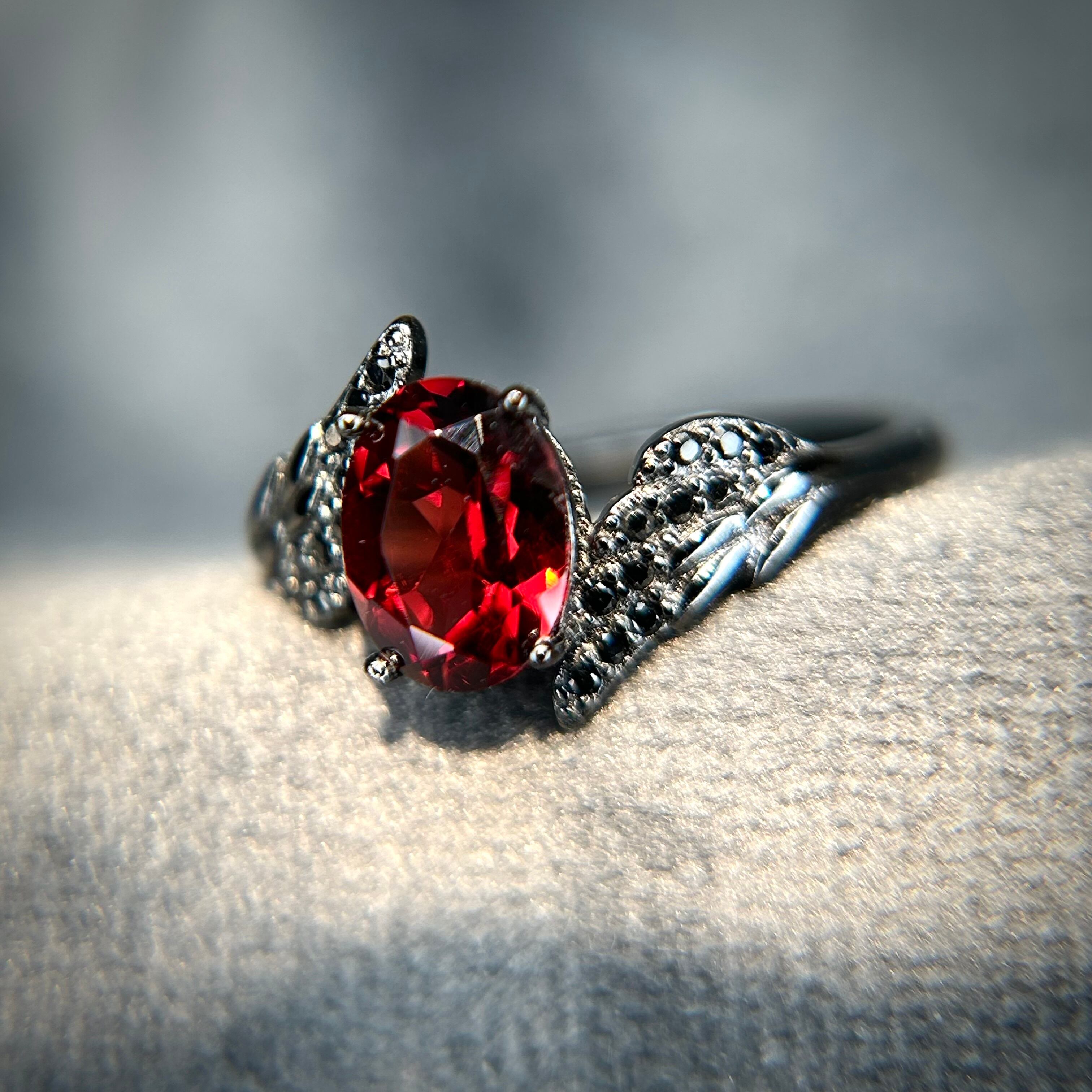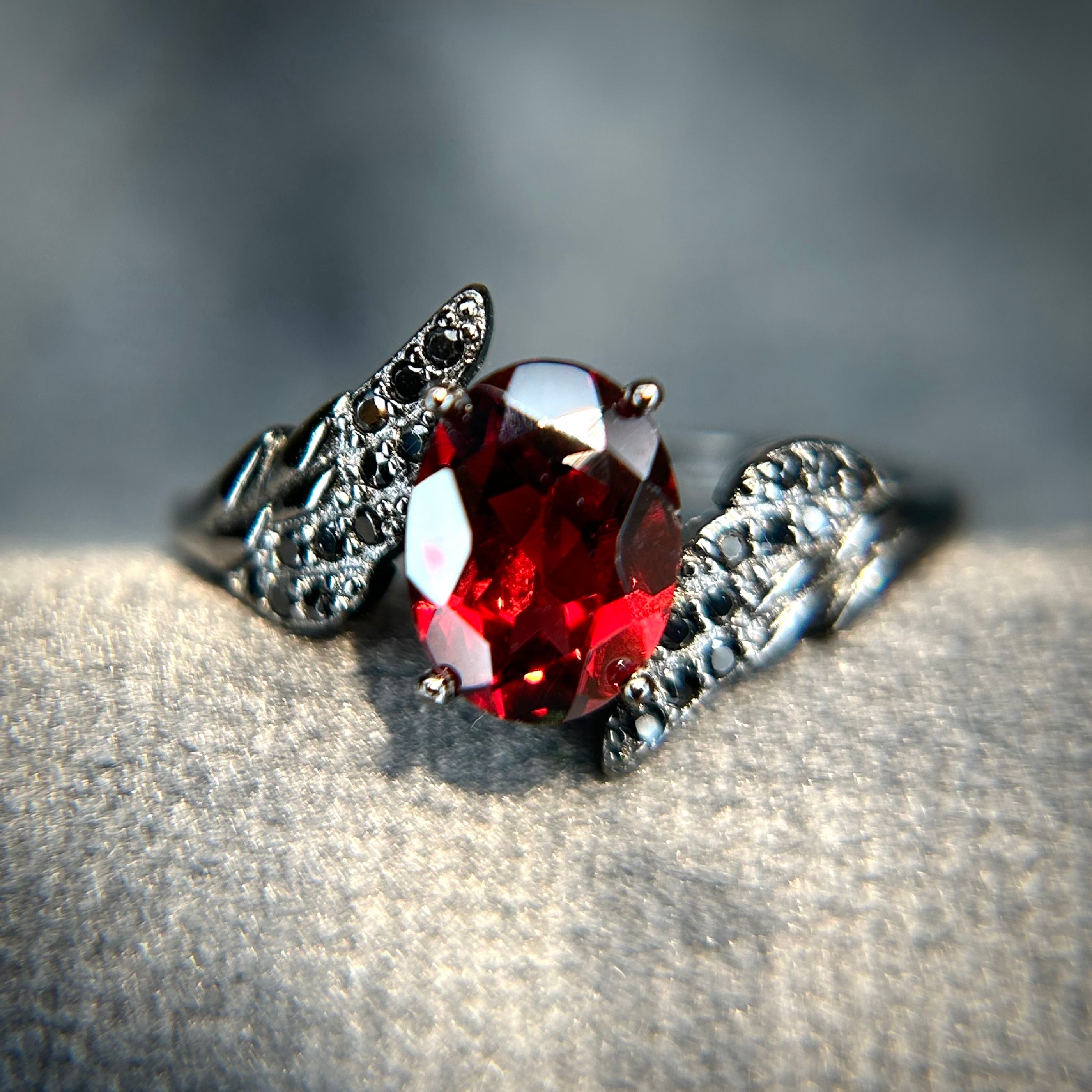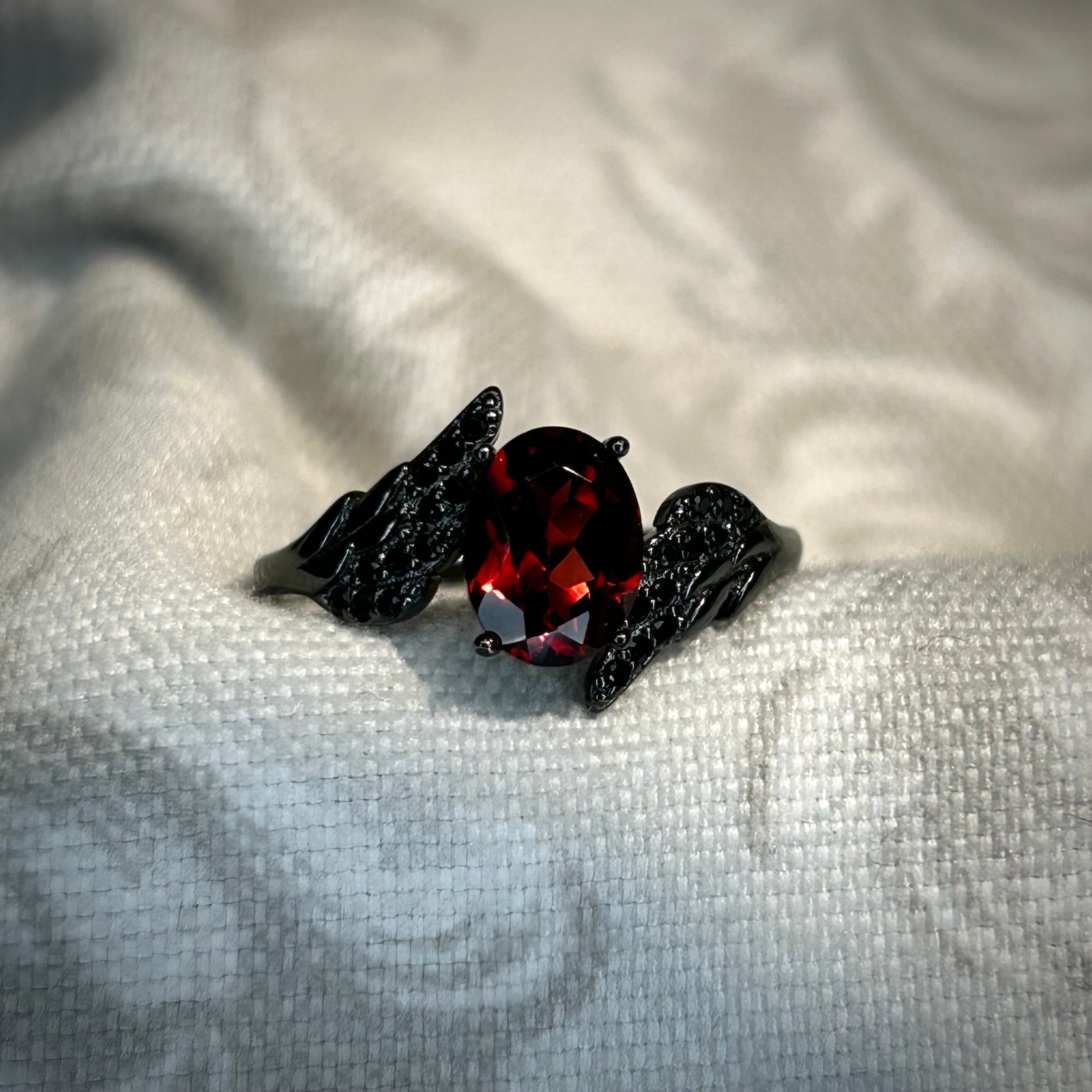両脇のアームが羽の様なデザインで中央のガーネットがブラックカラーに煌めくリングです。
