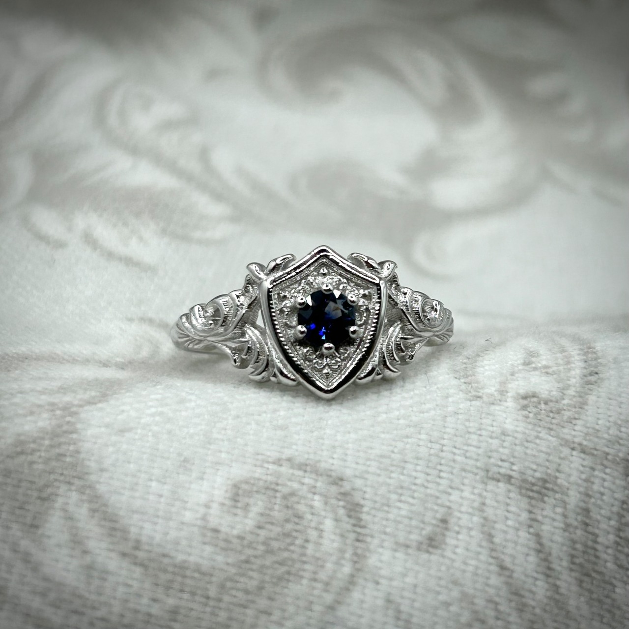 濃いブルーカラーのサファイアを使用し、かっこよくも気品漂う雰囲気になりました。