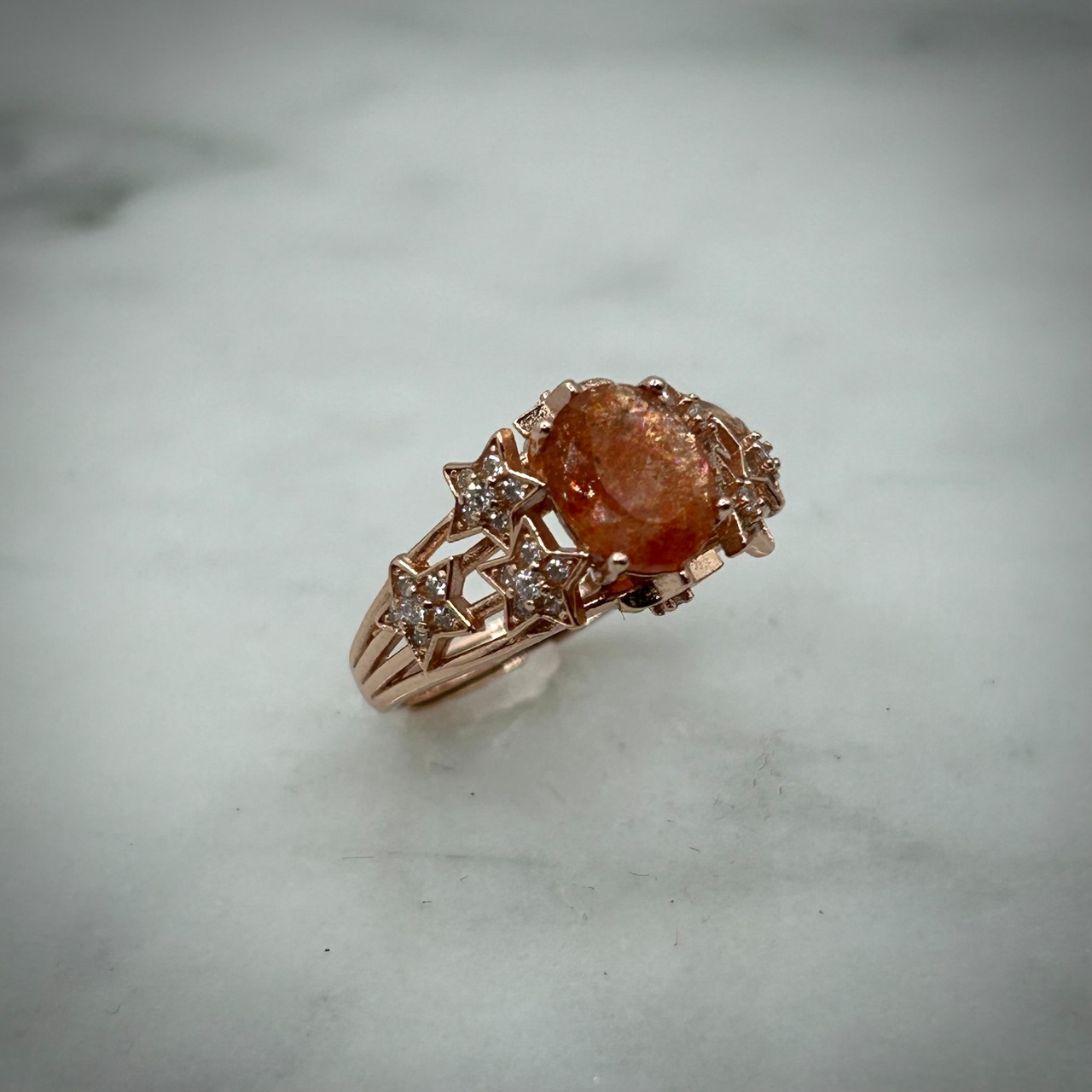 サンストーンのアベンチュレッセンスが楽しめるサイズ感で、8個のスターからなるデザインのリングです。