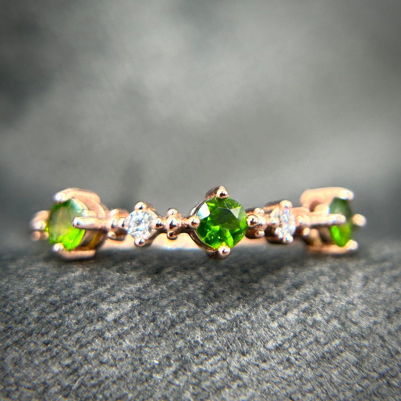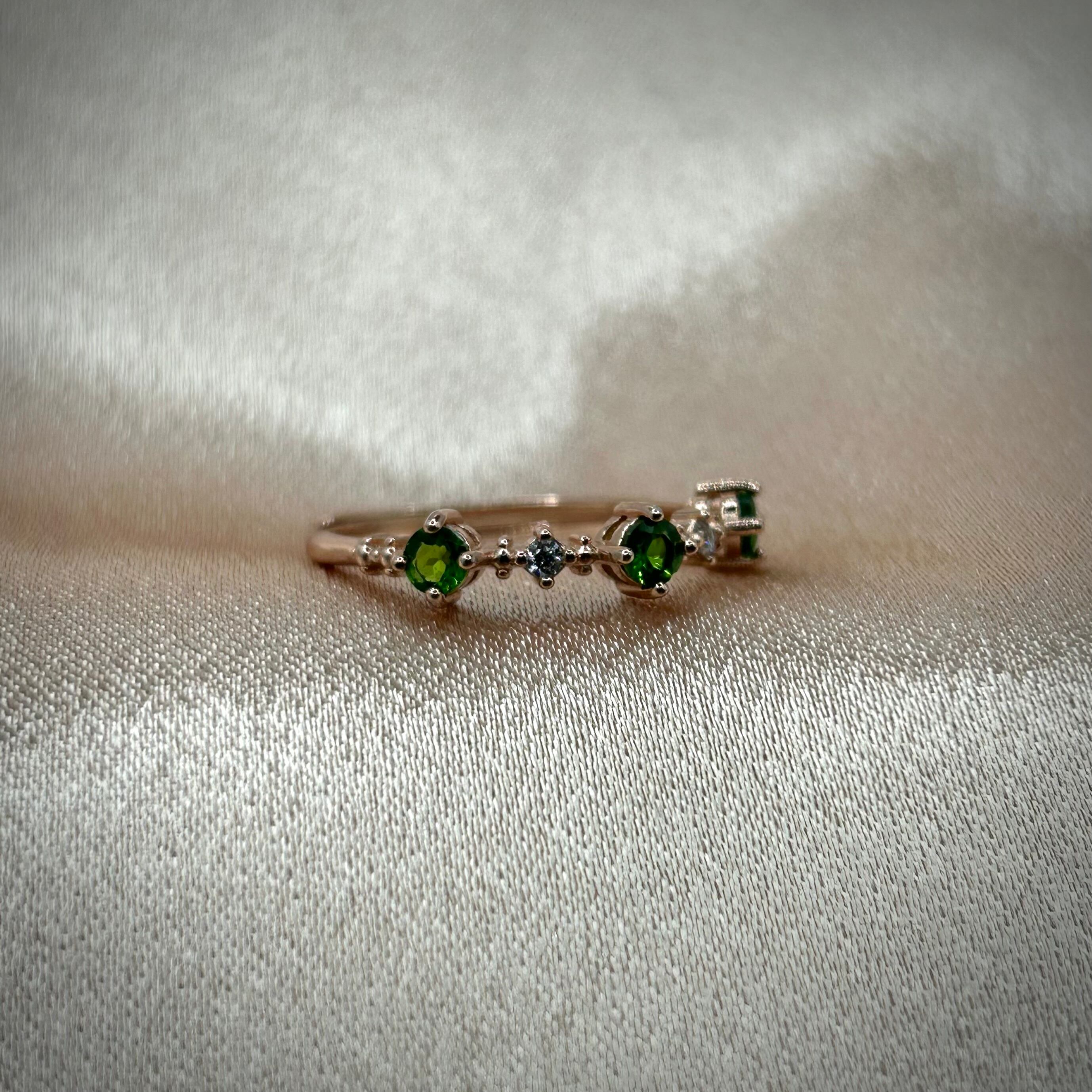 シルバー製ピンクゴールドカラー、クロムダイオプサイトの3石リング。