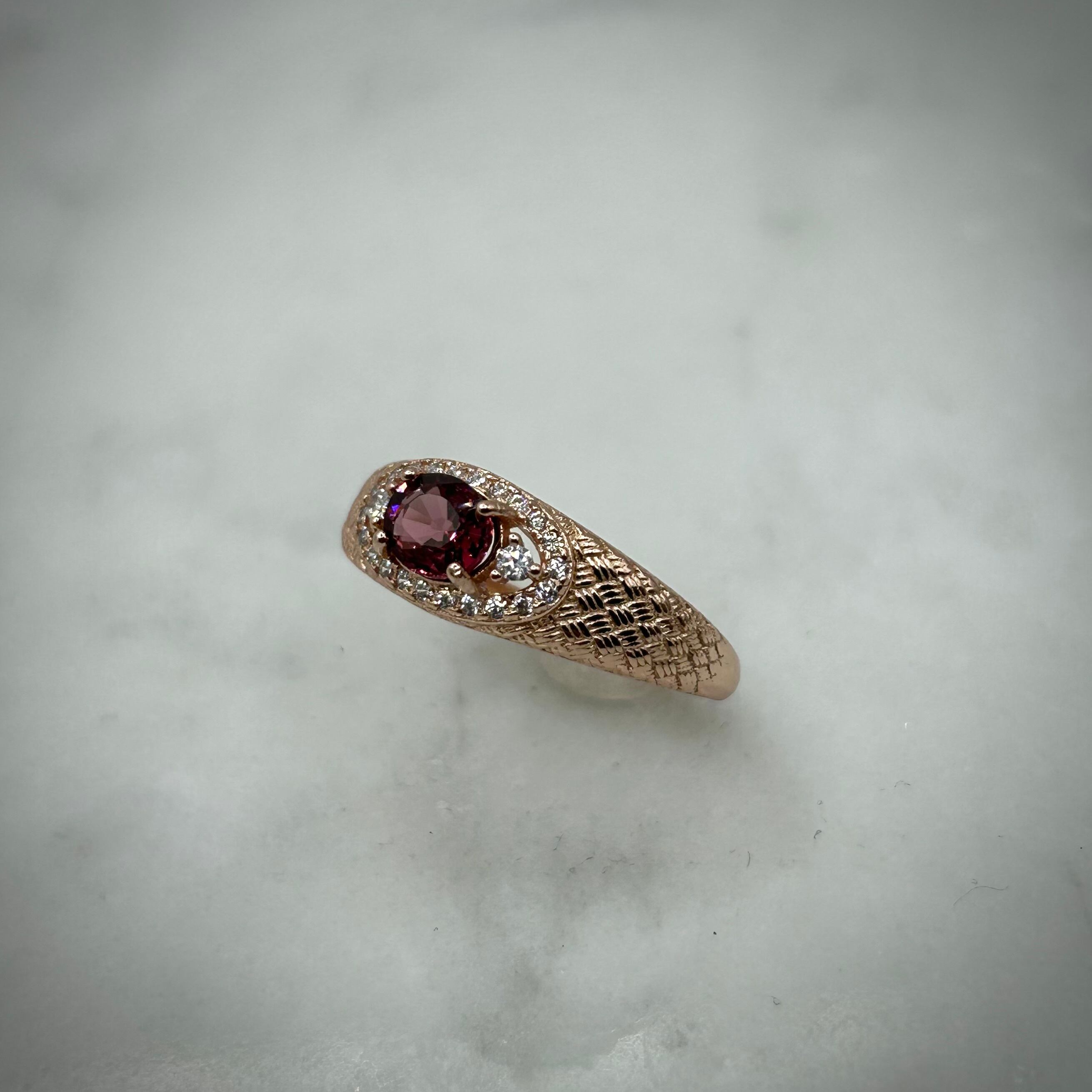 シルバー製ピンクゴールドカラー、ロードライトガーネットのメッシュデザインリング。