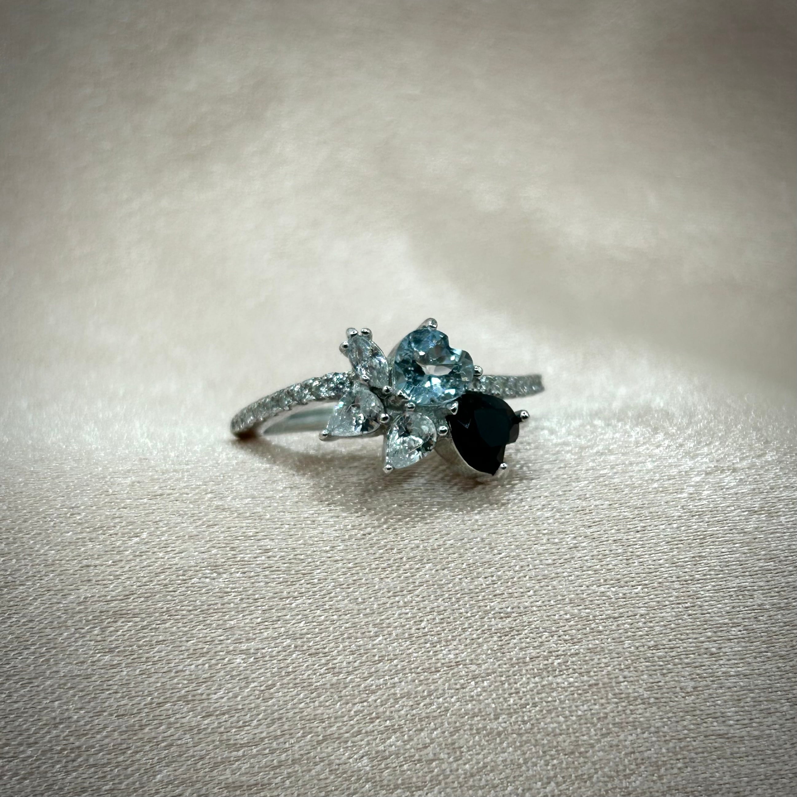 ハートシェイプのアクアマリンとブラックスピネルを使用。