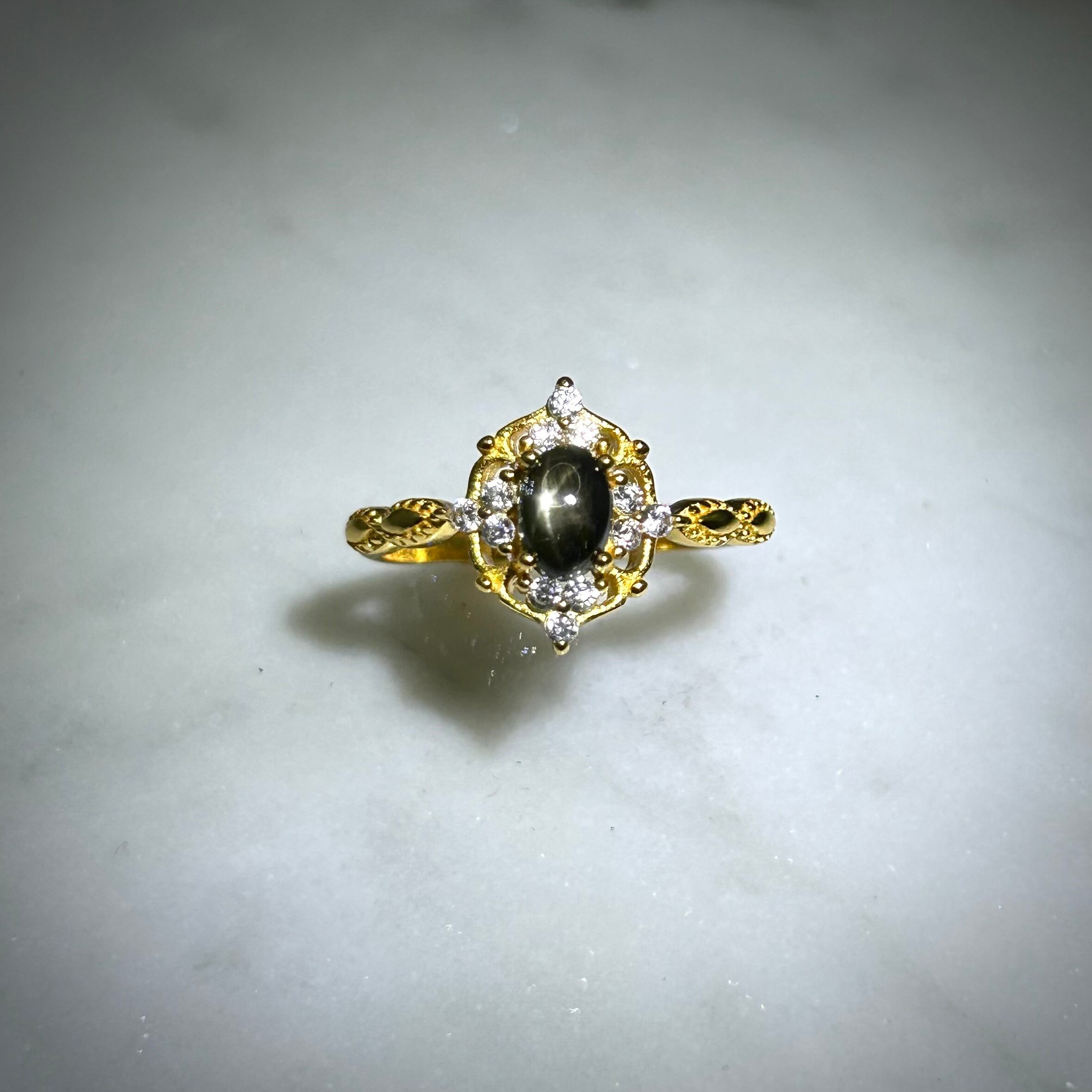 シルバー製ゴールドカラー、ブラックスターサファイアのクラシカルリング。