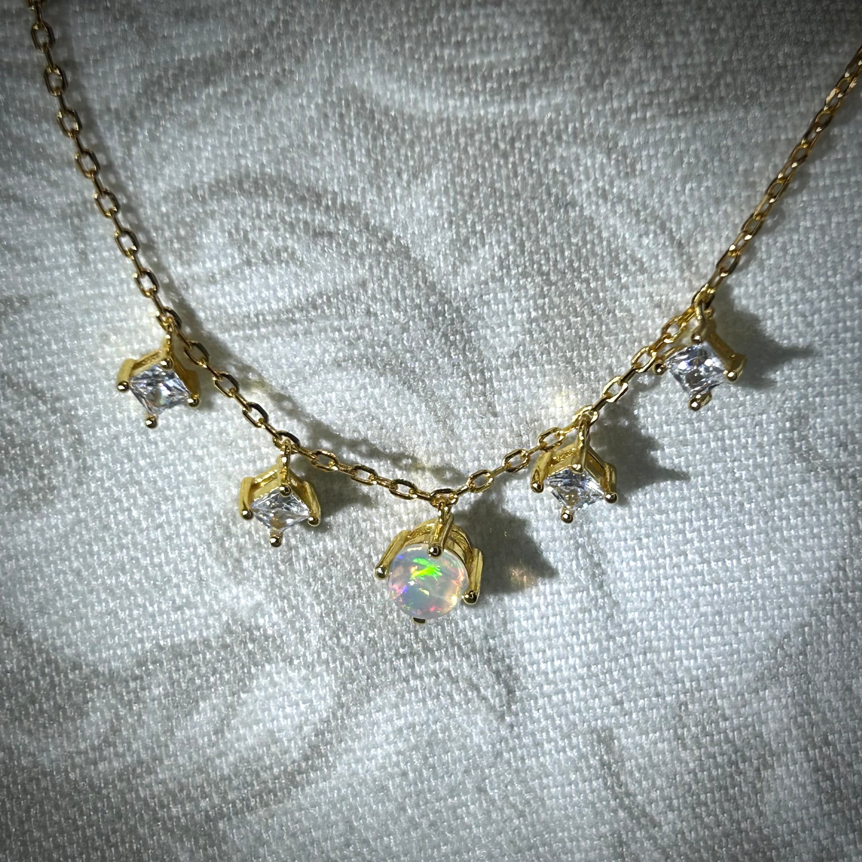 ラウンドのオパールを中心に左右にスクエアのジルコニアが2石ずつ、それぞれ等間隔に並んだデザインで可愛い印象のネックレスです。