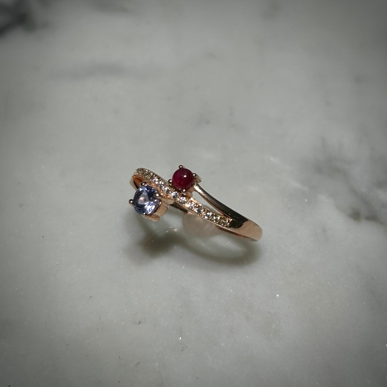 シルバー製ピンクゴールドカラー、ルビー&タンザナイトのツインリング。