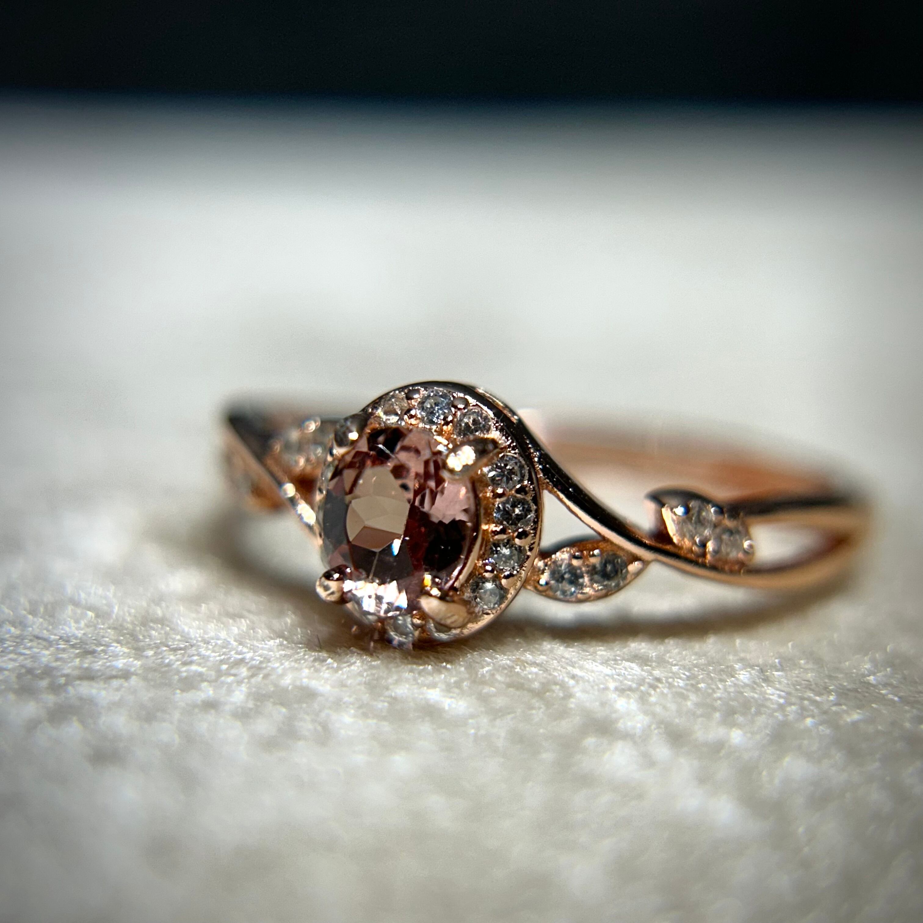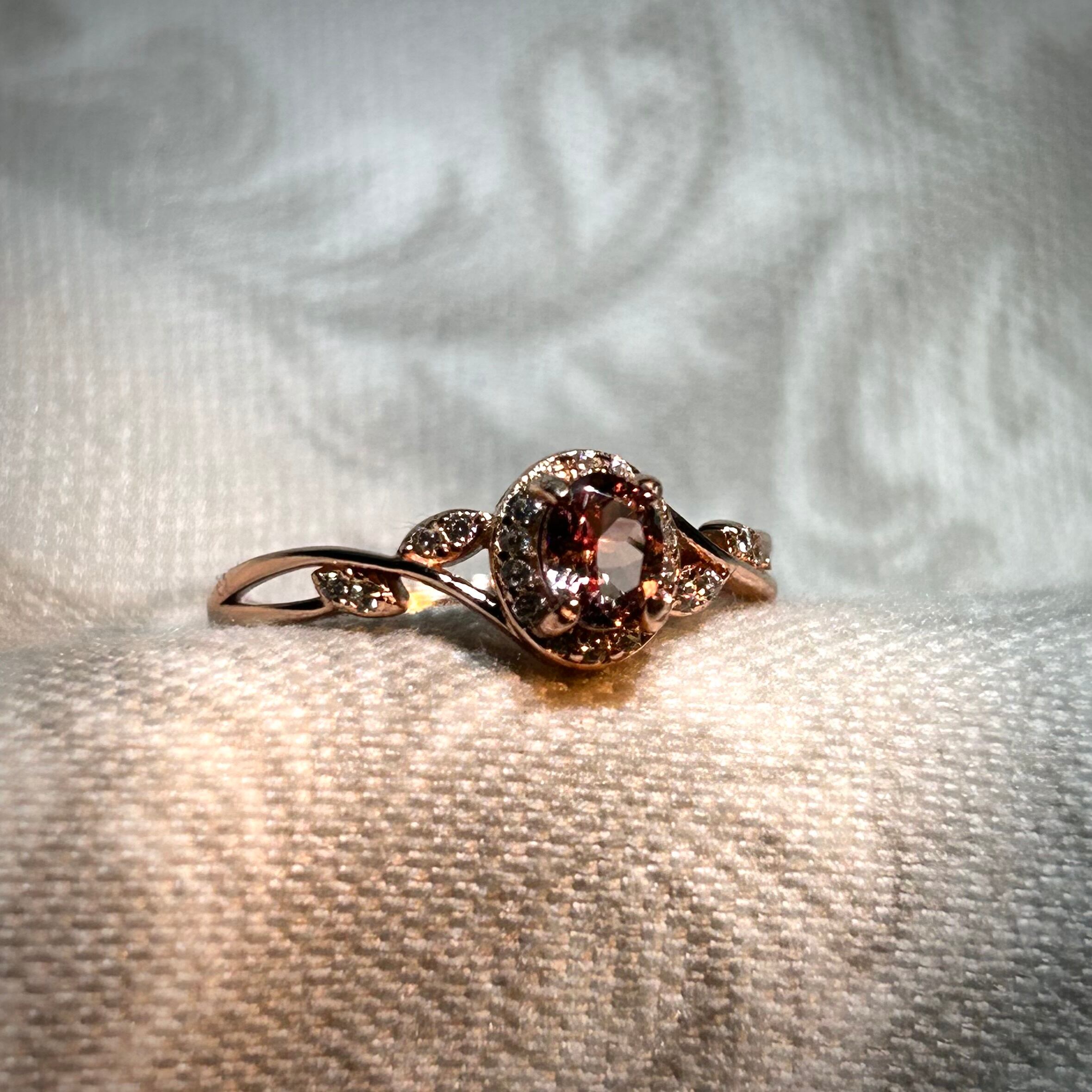 暖色系の光りを当てると、濃いピンクカラーへとカラーシフトする可愛いマラヤガーネットが、曲線と葉っぱのような脇石部分がナチュラル感のあるデザインのリング。