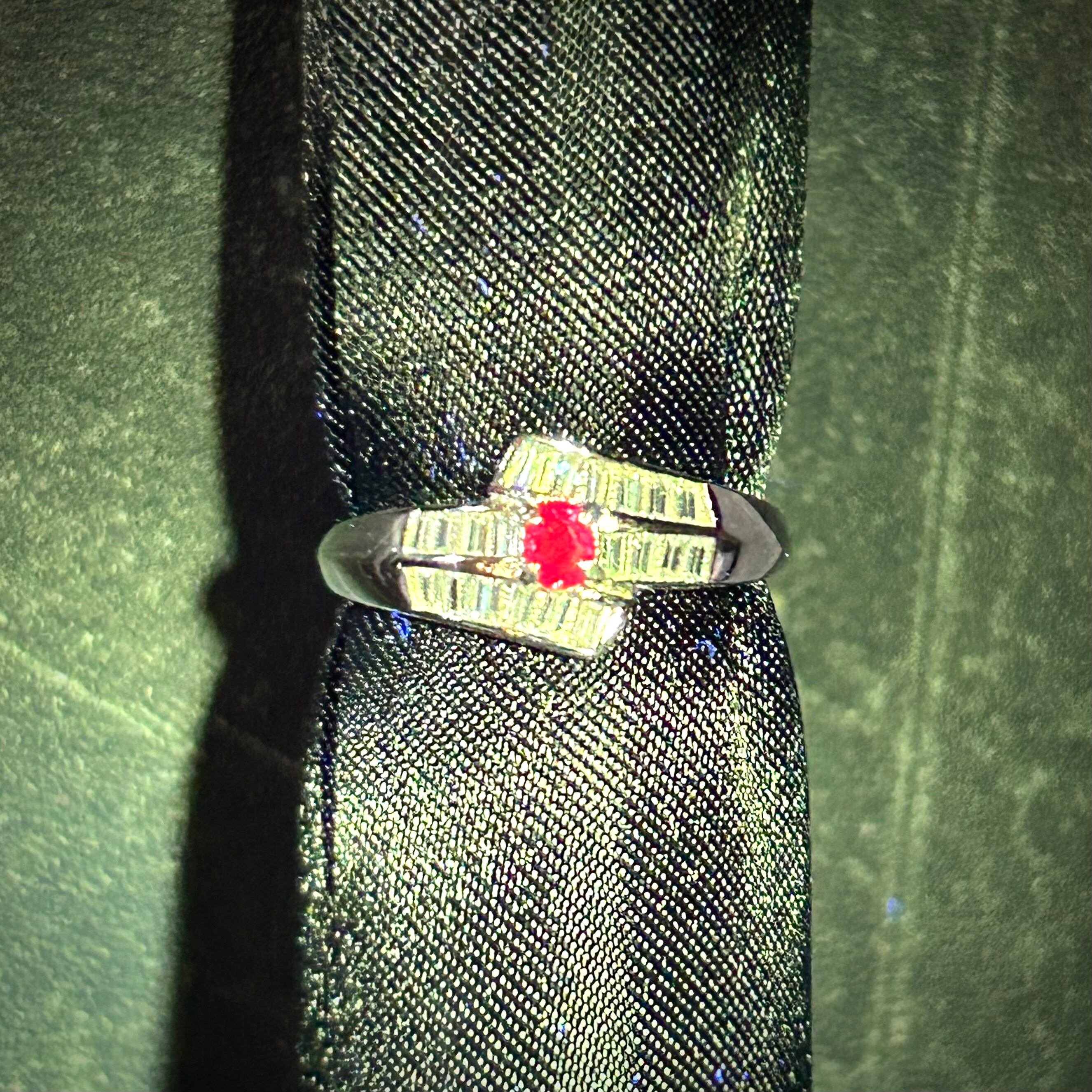 シルバー製、ルビーのバゲットリング。