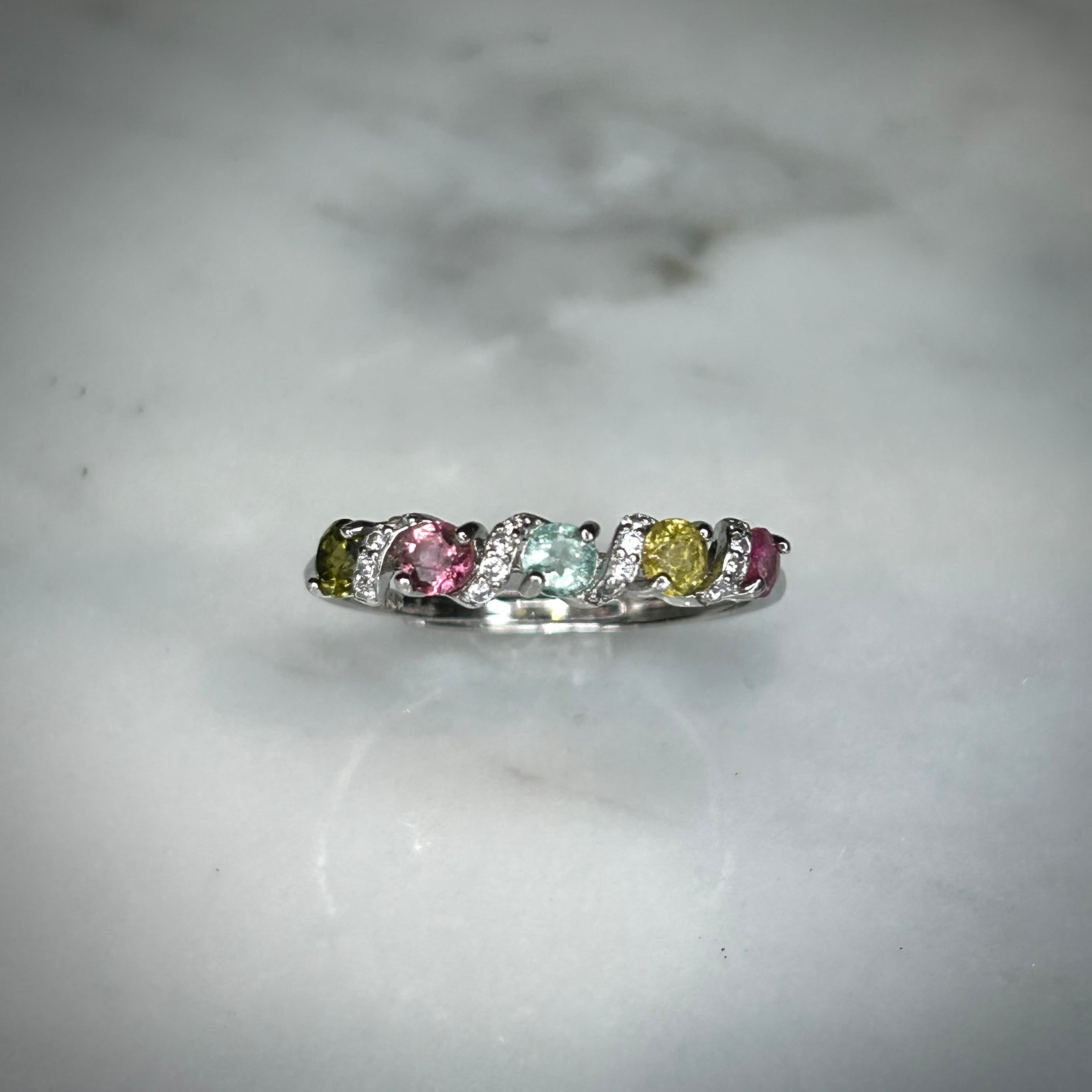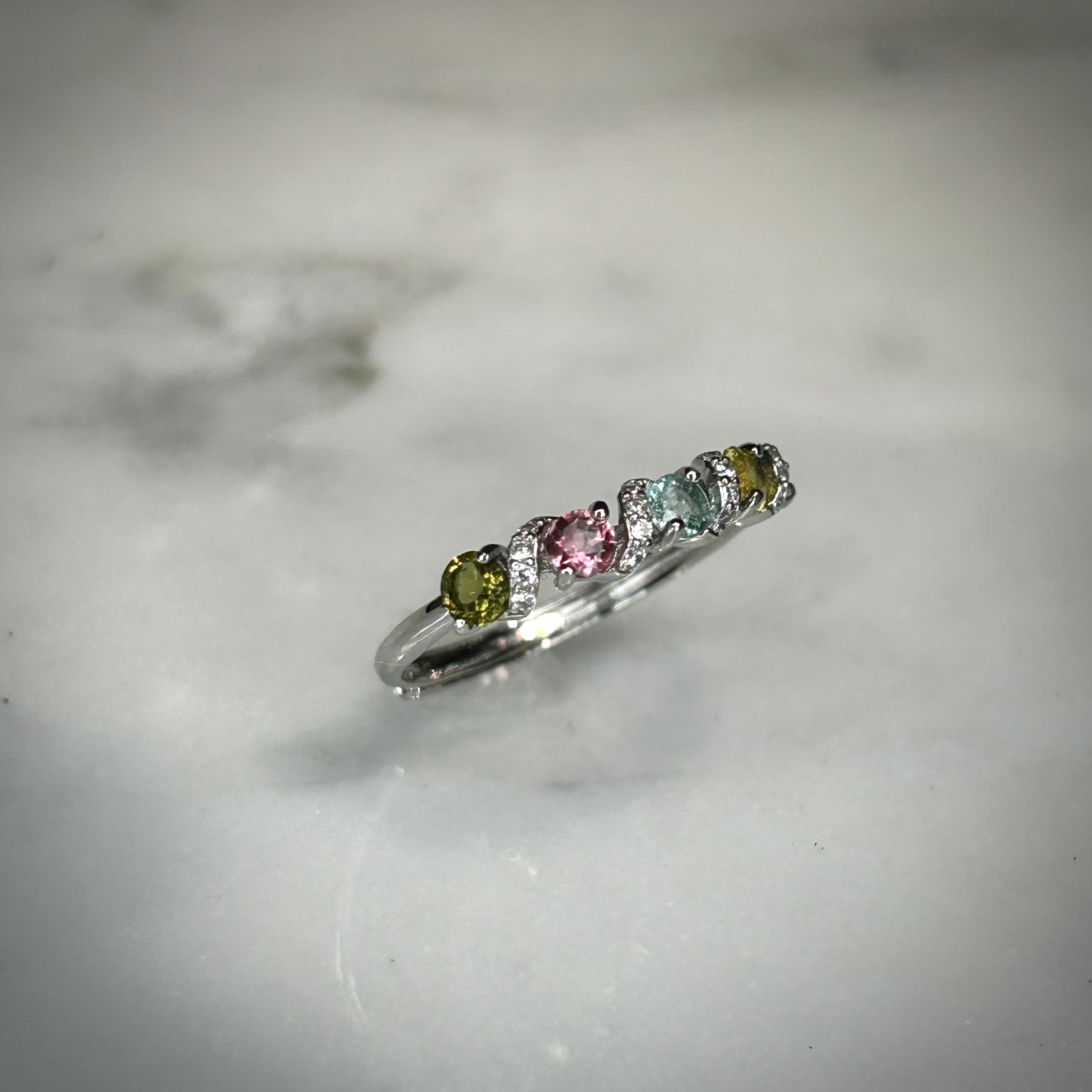 シルバー製、トルマリンの5石スパイラルリング。
