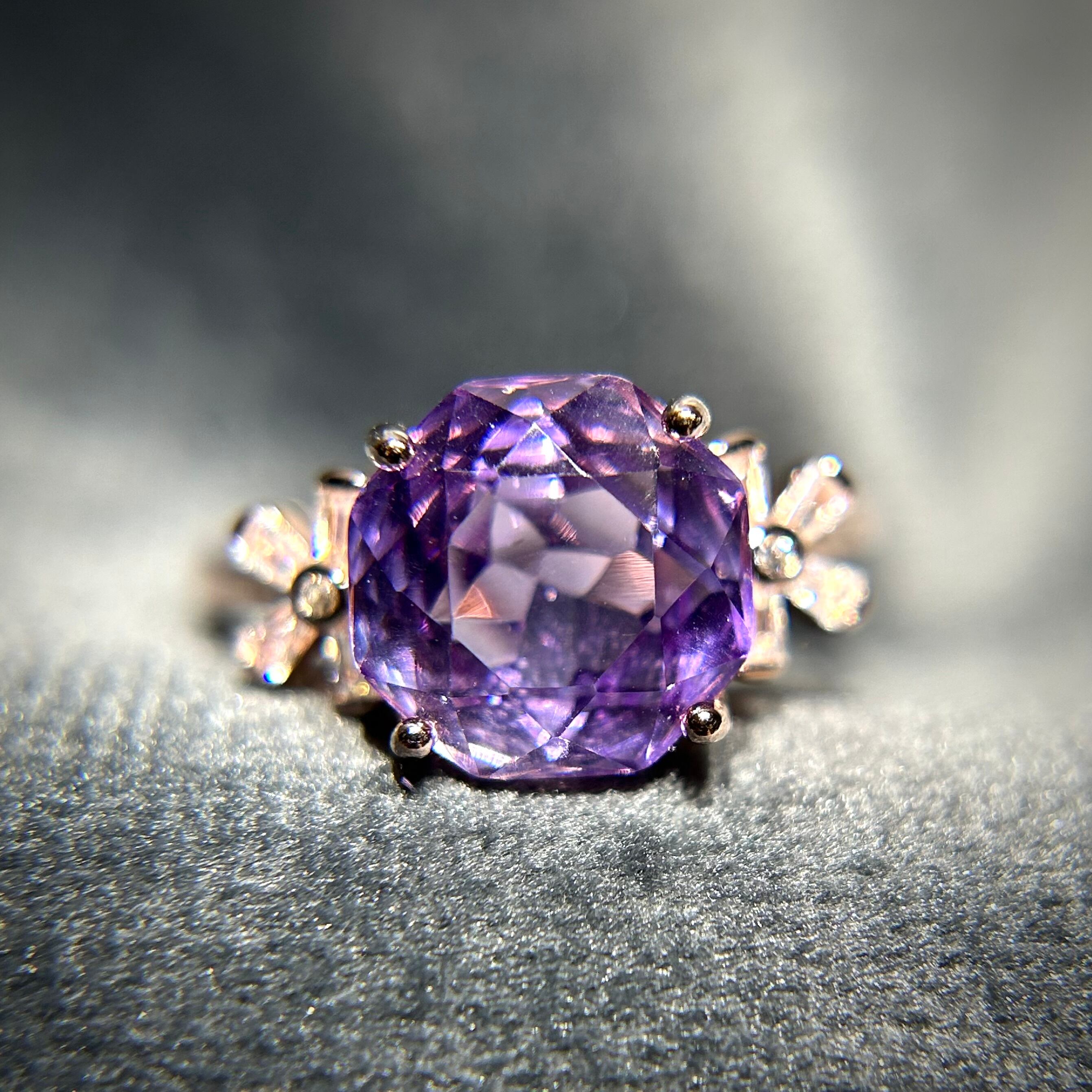 美しいパープルカラーが楽しめる、八角形のオクタゴンカットのアメシストを使用。