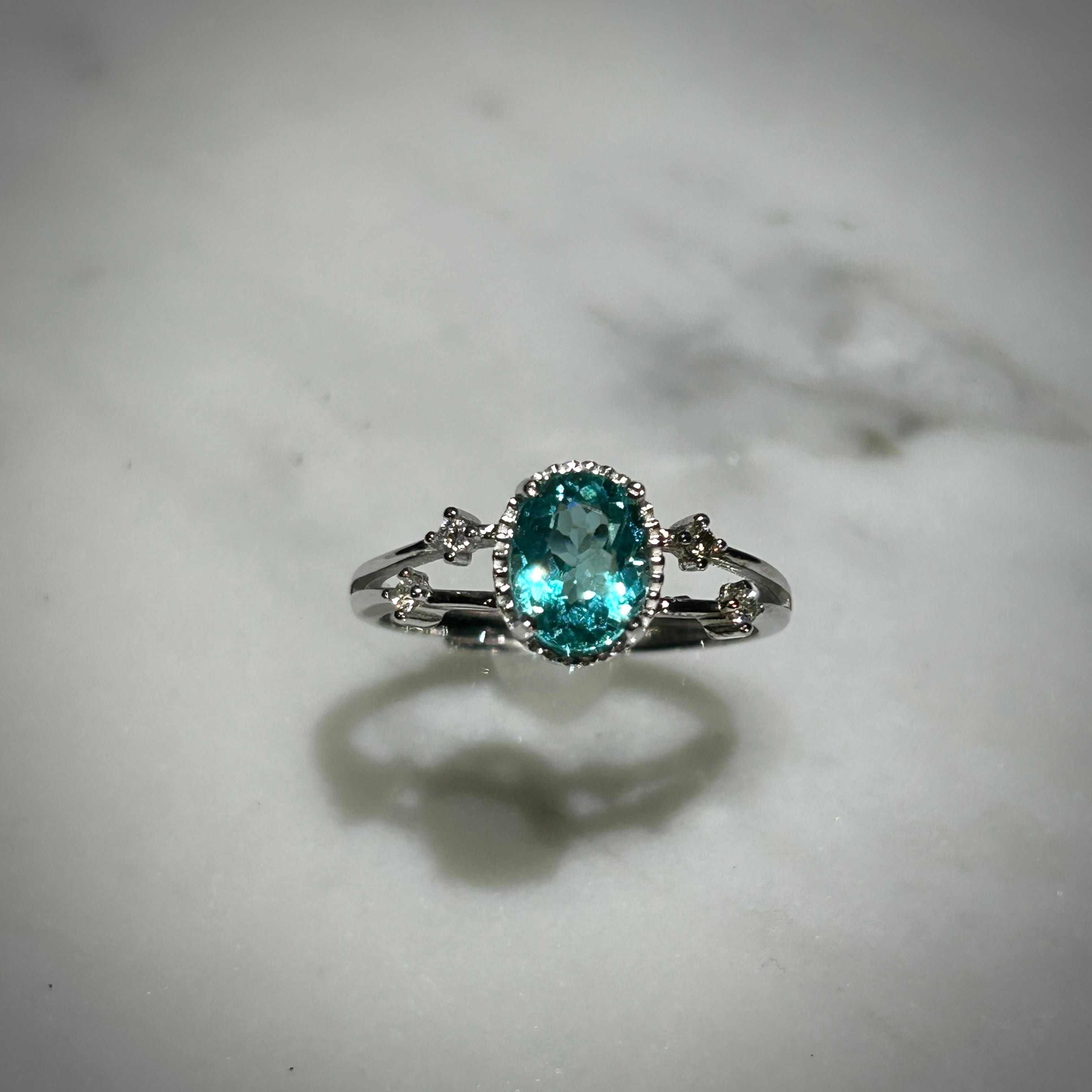 さりげなく両サイドに配置された脇石が派手過ぎず、アパタイトを引き立てるデザインのリングです。