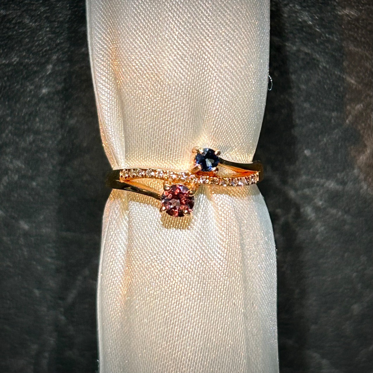 カラーチェンジガーネットの色変わりがはっきりと見られ、1つの石で2つの雰囲気を楽しめます。サファイアもブルーの煌めきが美しいです。