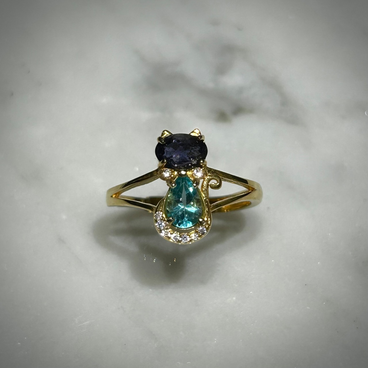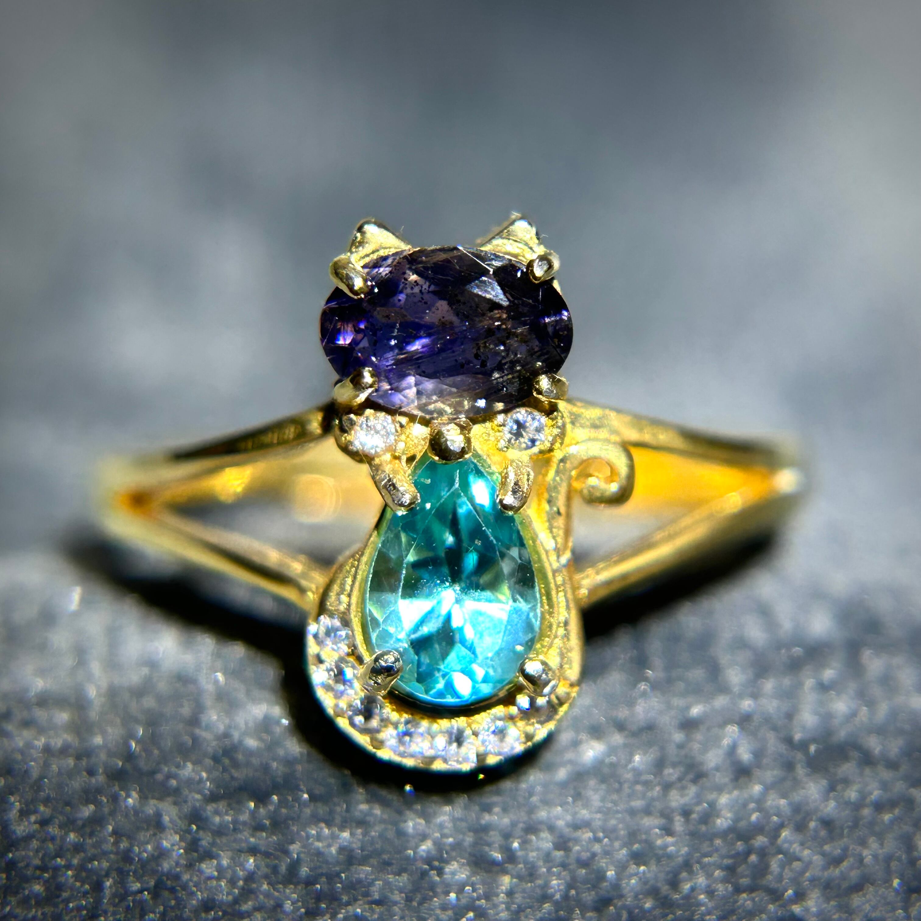 シルバー製ゴールドカラー、アイオライトサンストーン&アパタイトのお洒落ミニネコリング。