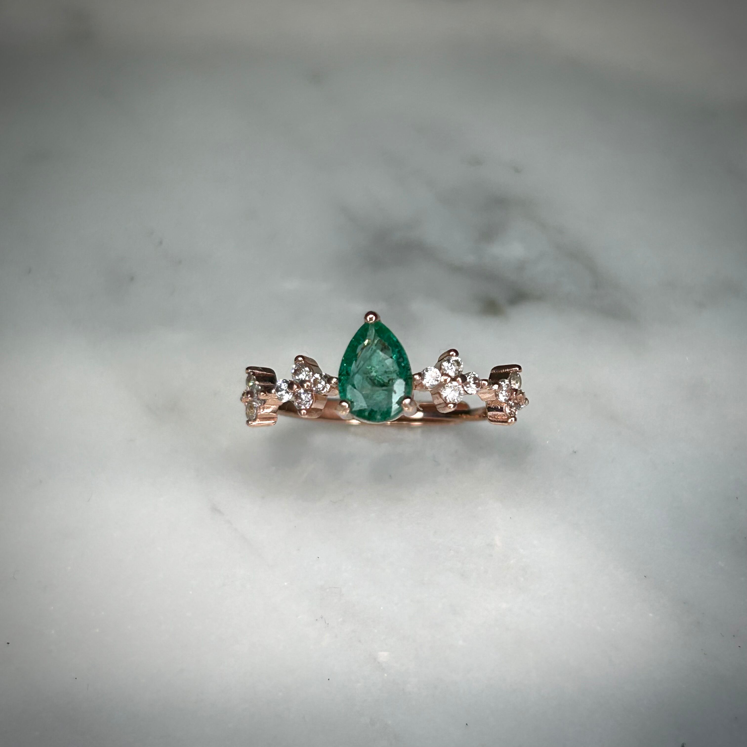 エメラルドの両隣りに花が連なり、冠の様でフェミニンな印象に。