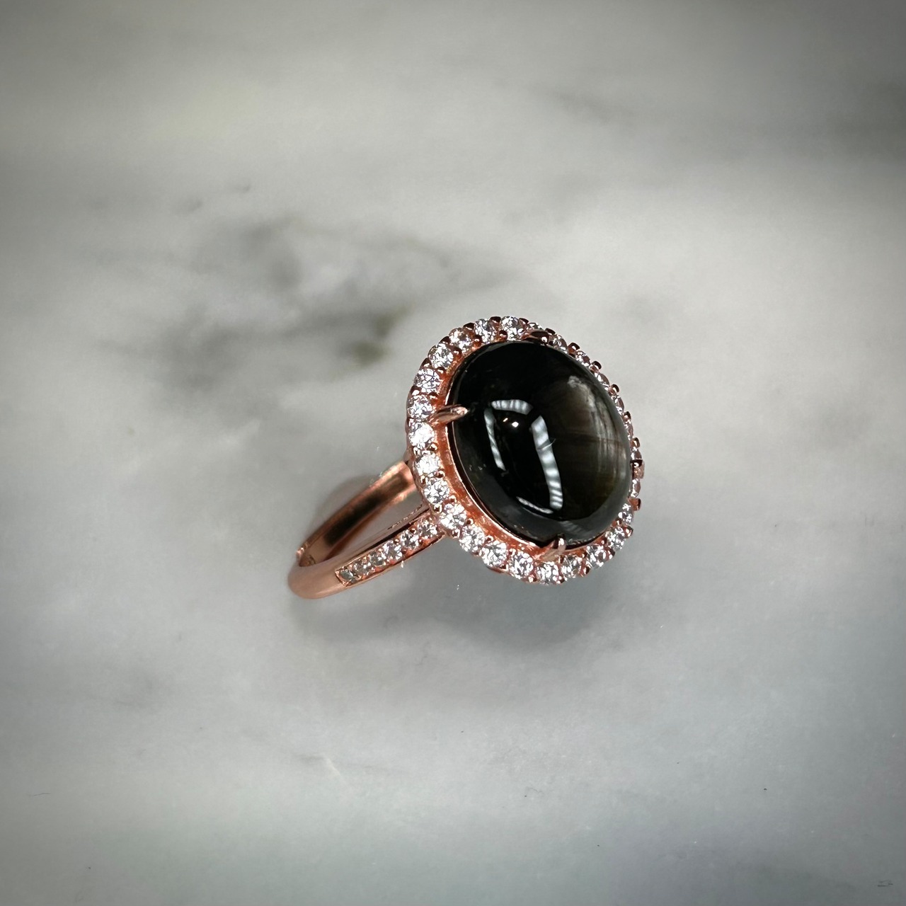 シルバー製ピンクゴールドカラー スターサファイアのオーバルデザインリング。