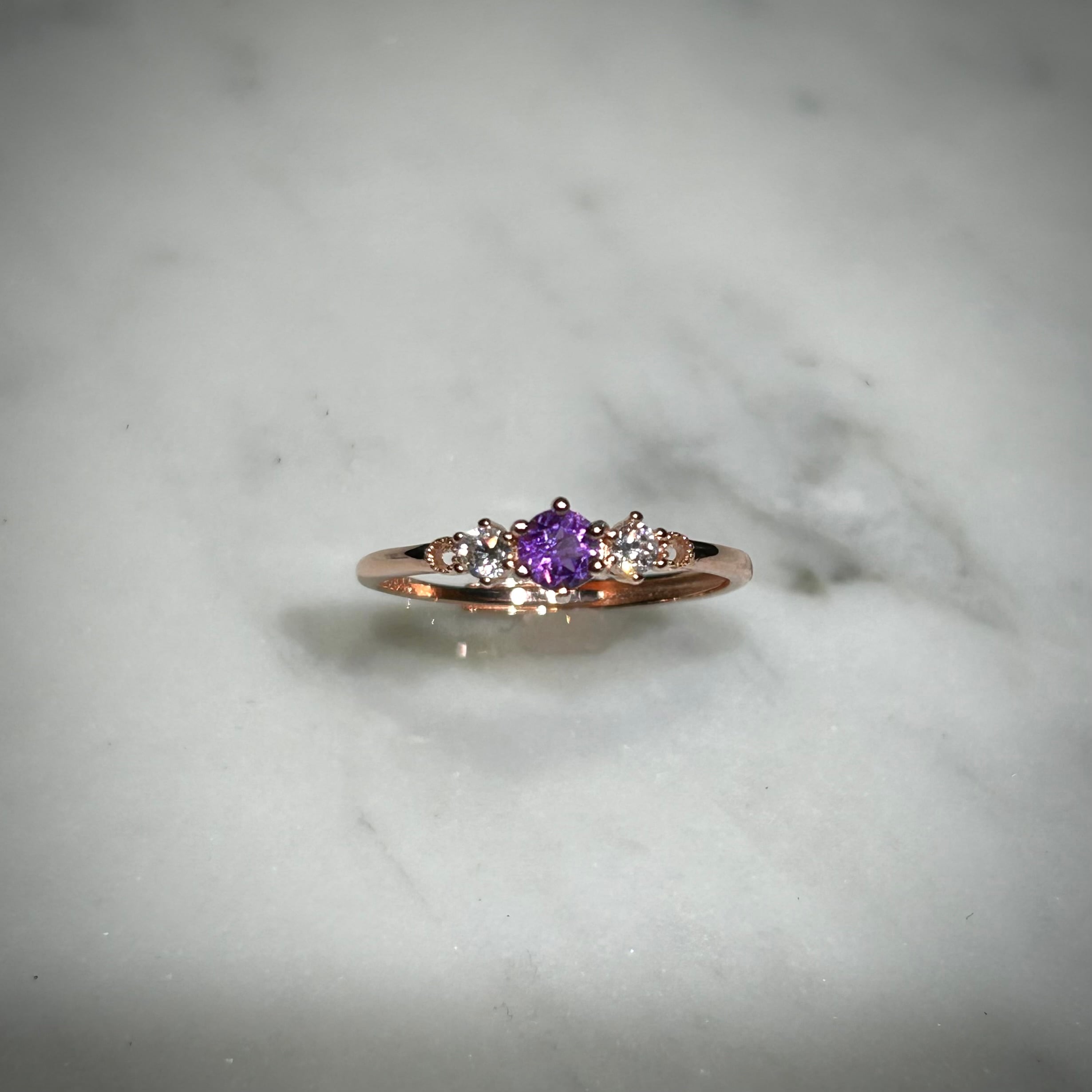 シルバー製ピンクゴールドカラー、アメシストのスリーストーンリング。