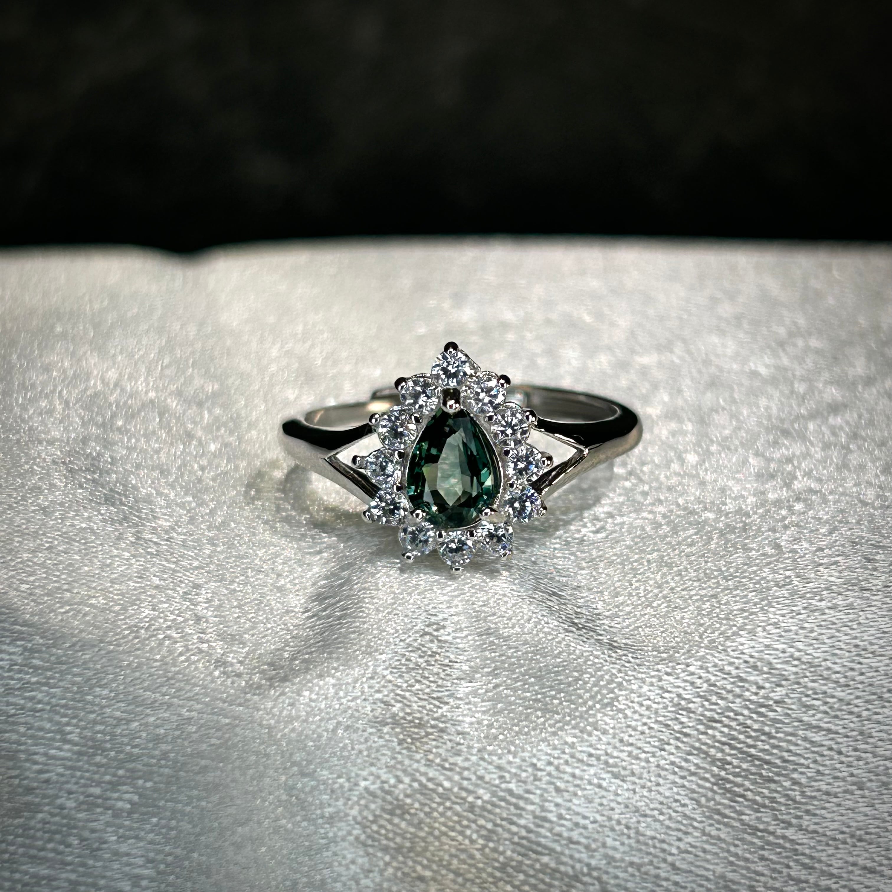 煌めく脇石に凛とした印象のグリーンカラーのサファイア。