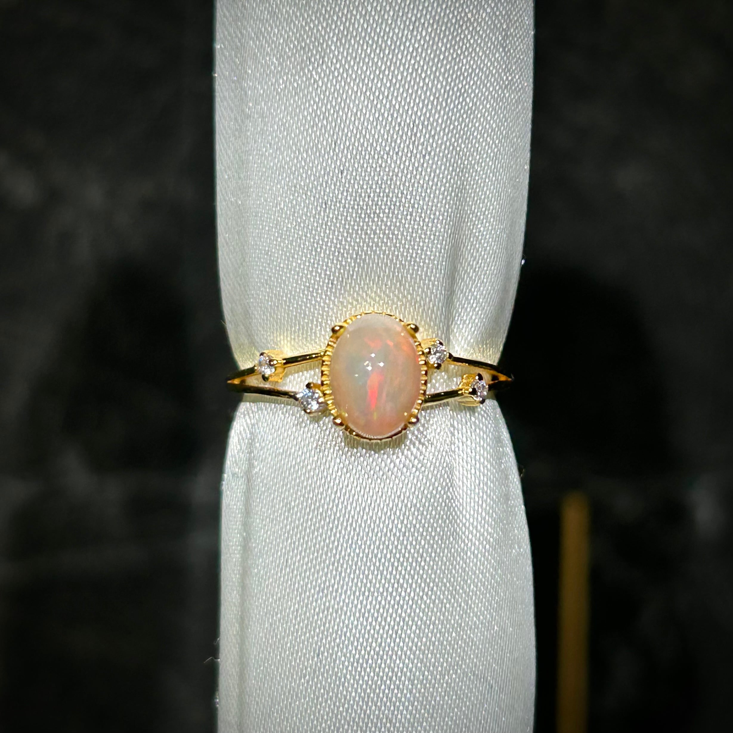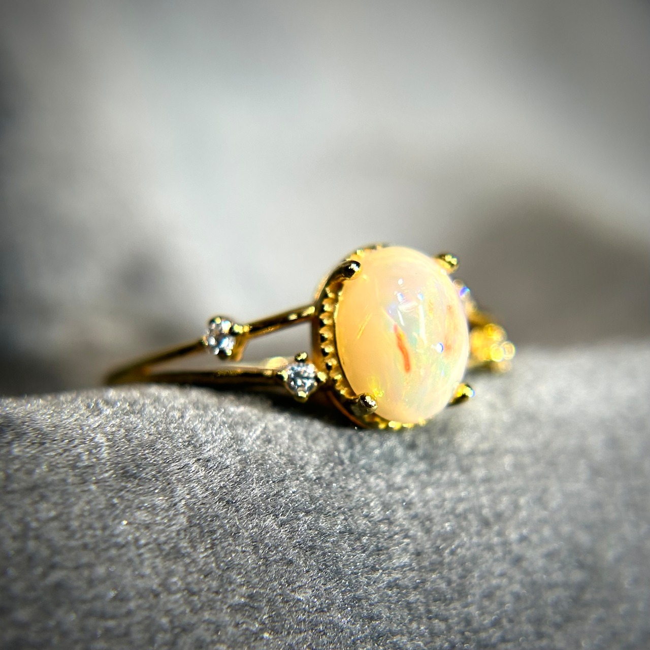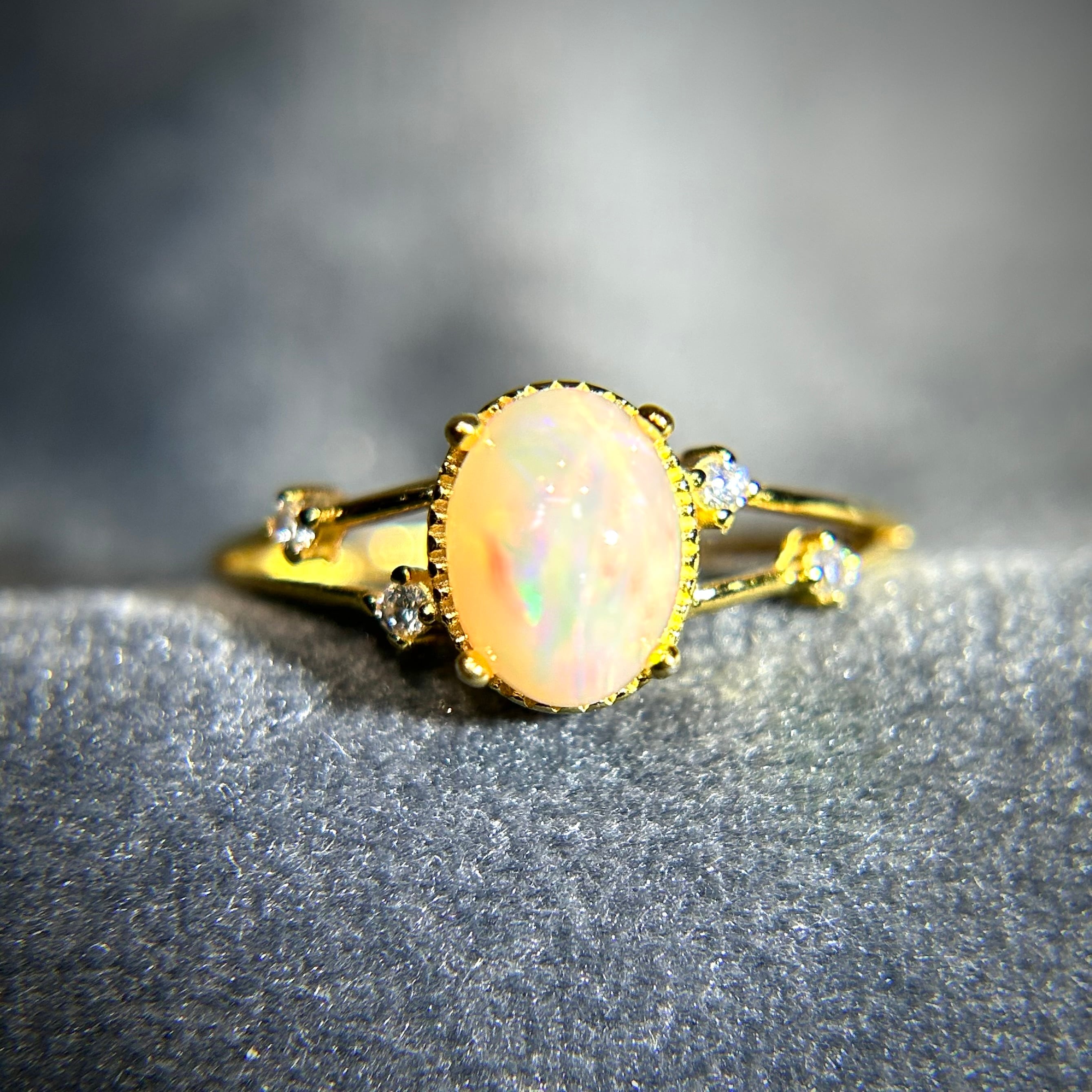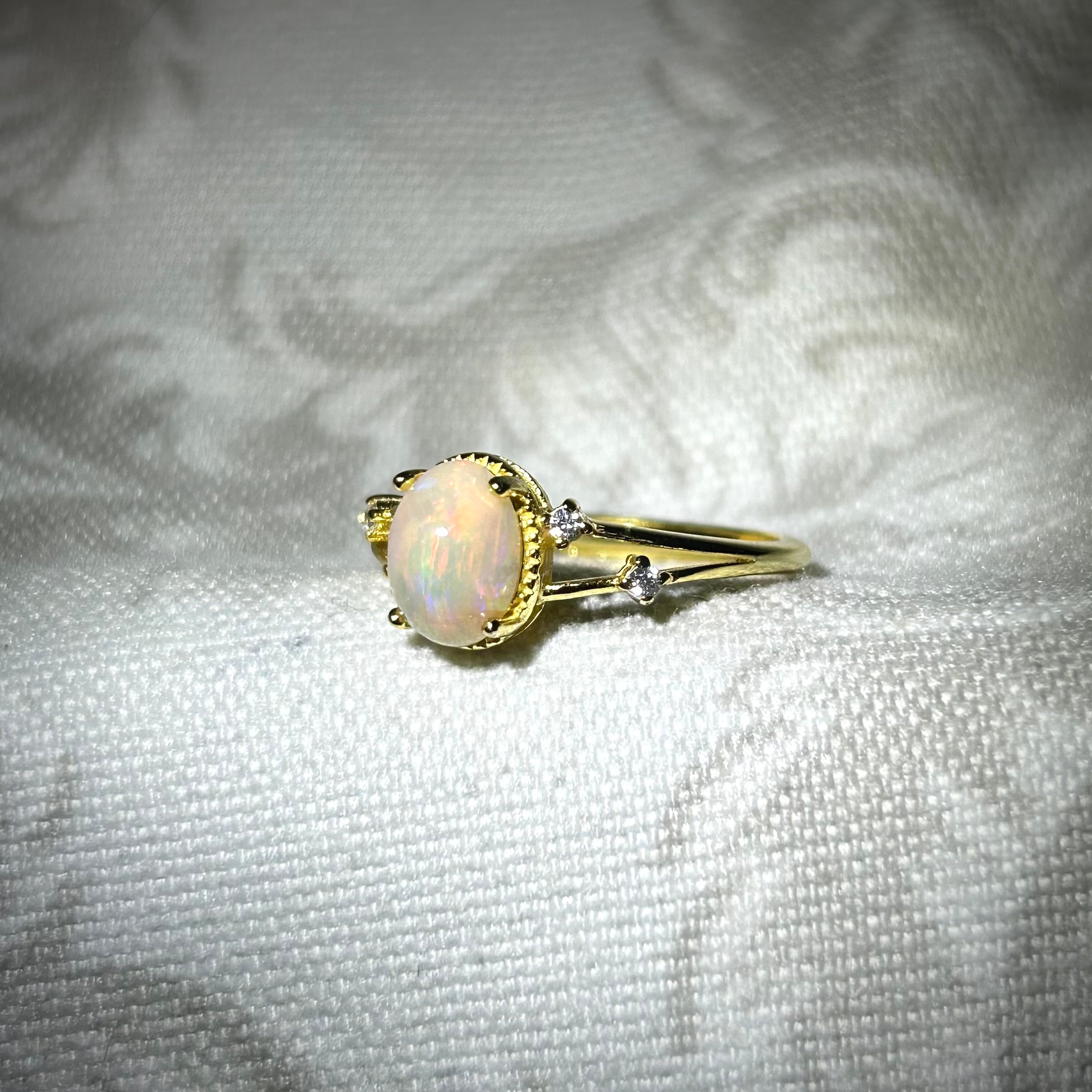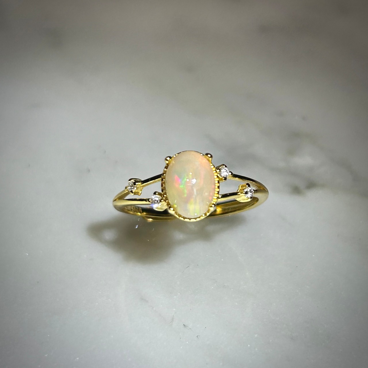 シルバー製ゴールドカラー、オパールのオーバルステーションリング。