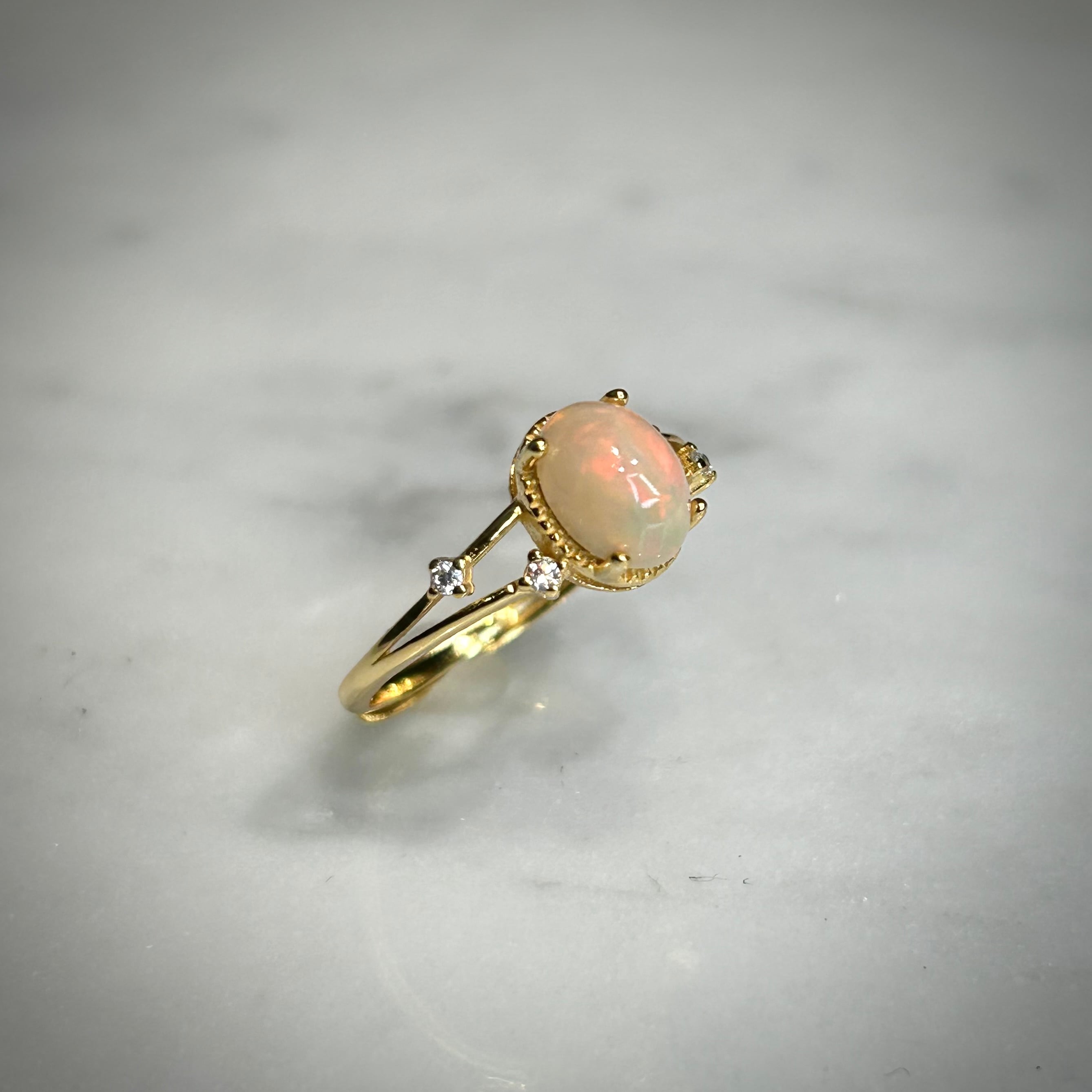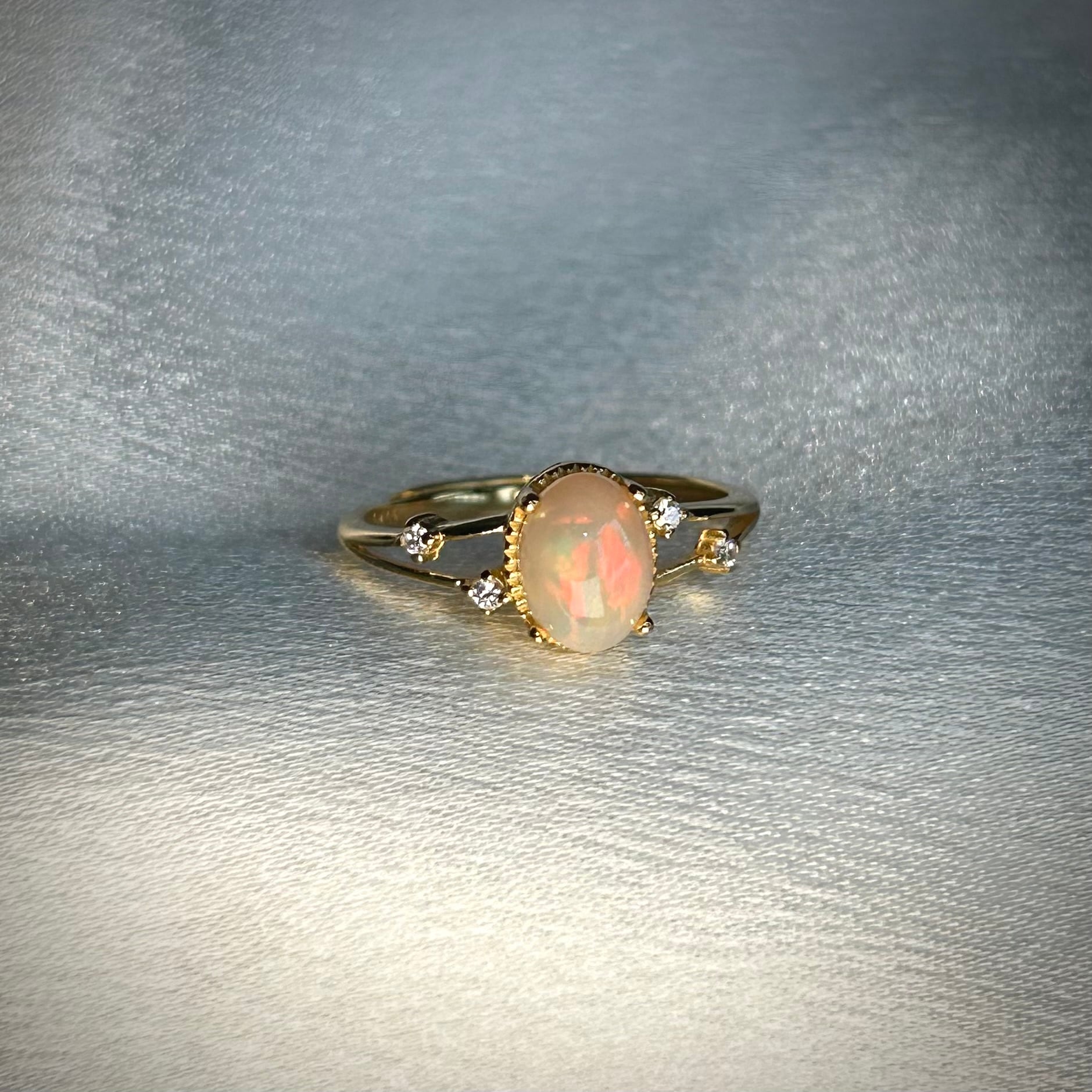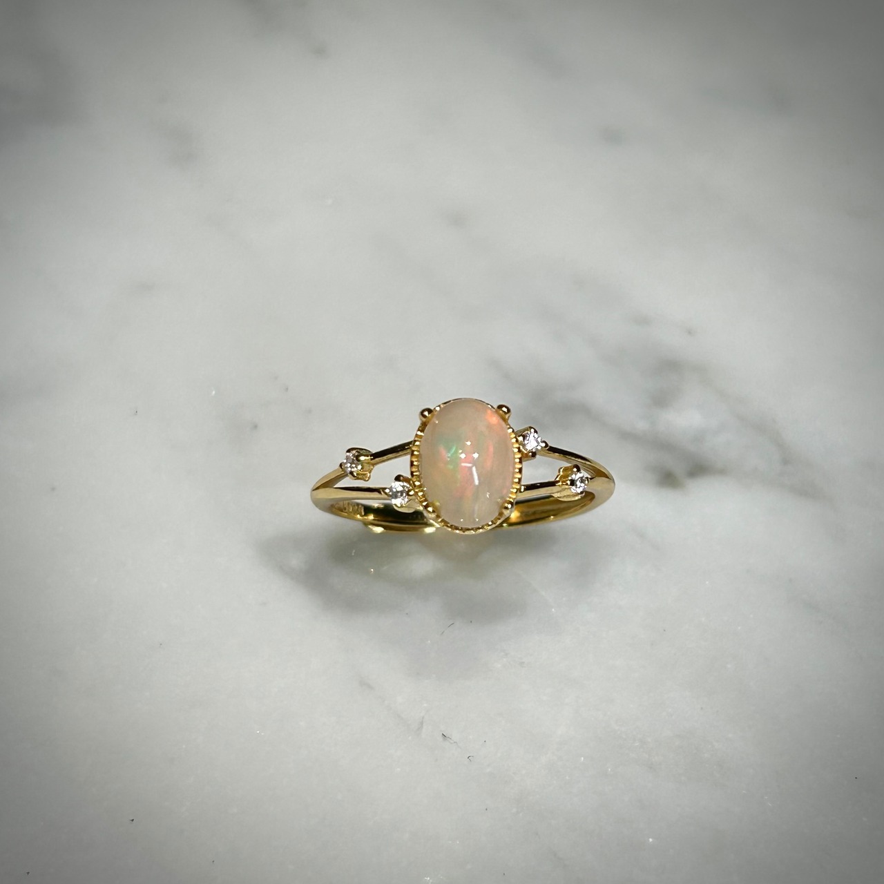 さりげなく両サイドに配置された脇石が派手過ぎず、オパールを美しく引き立てます。
