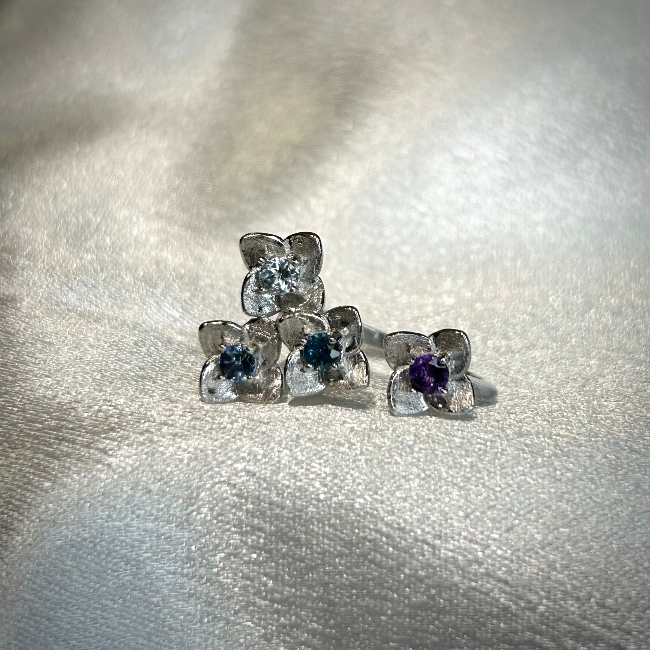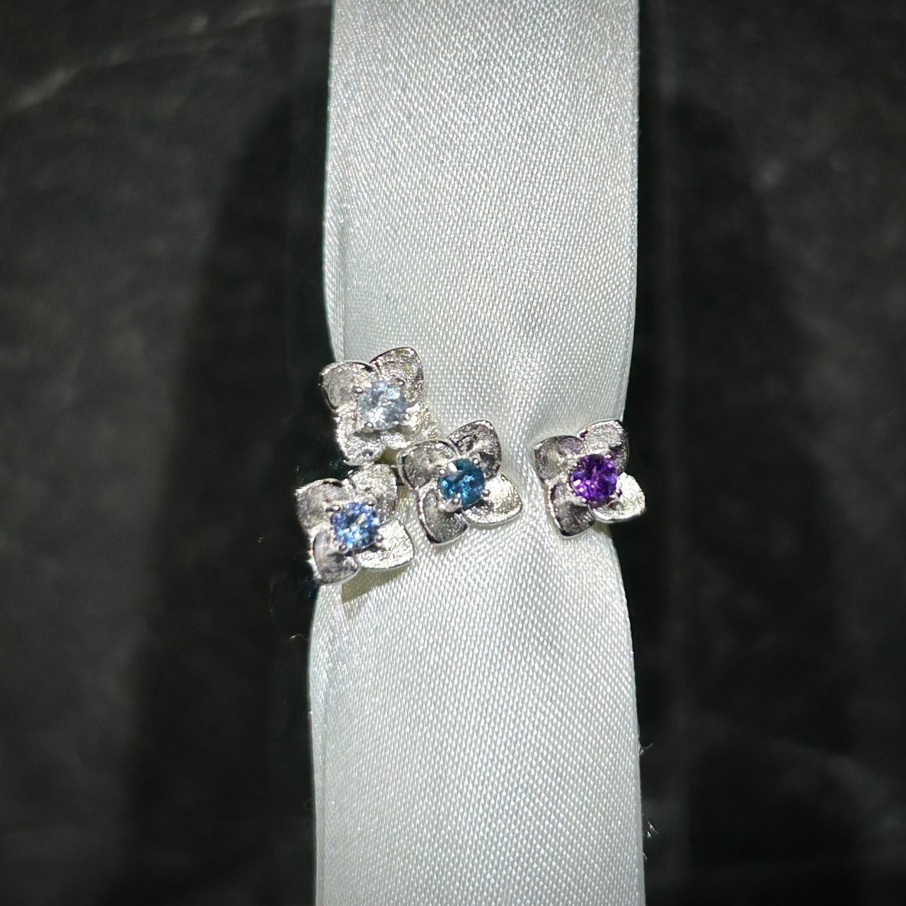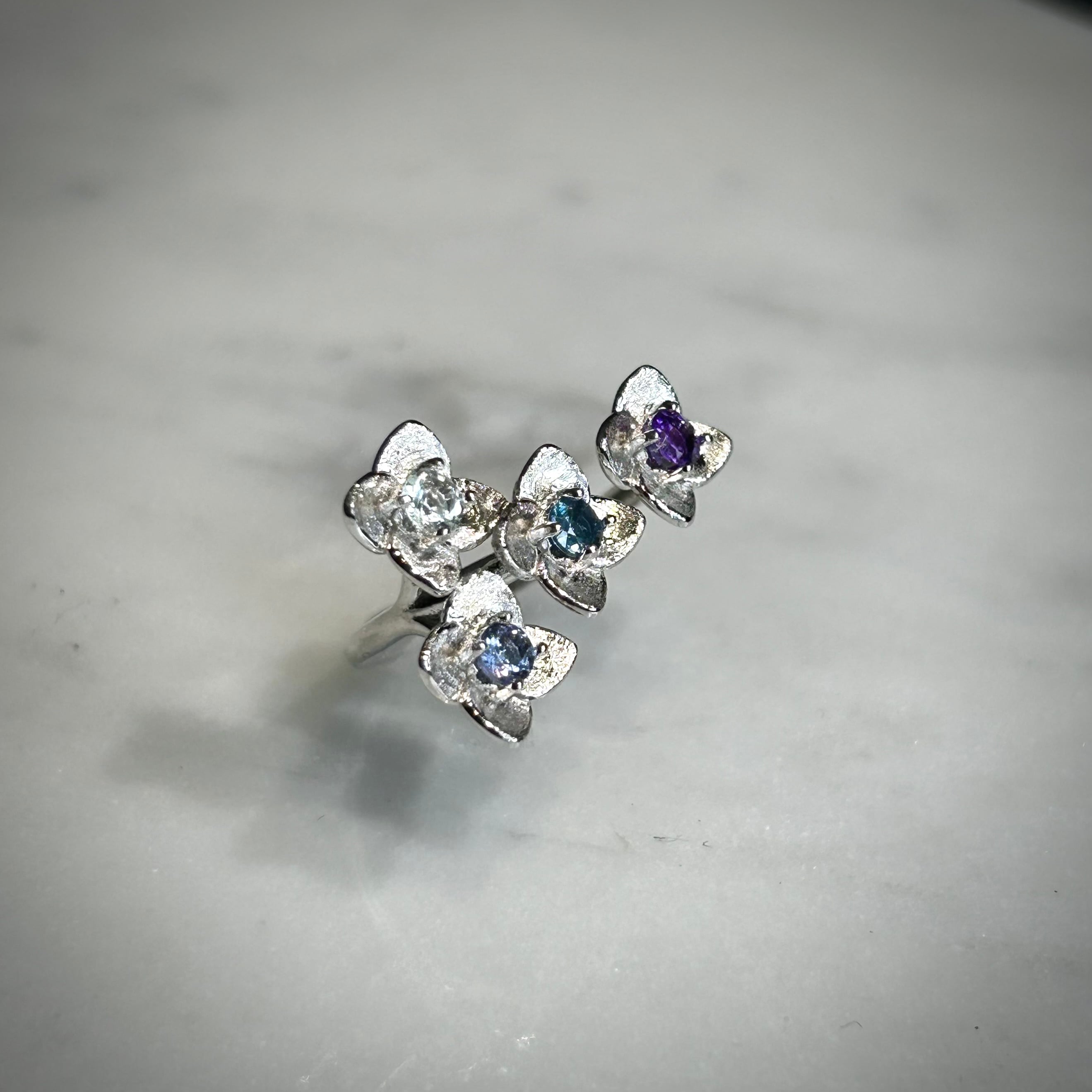 1つのリングで4種類の石が楽しめ,存在感のあるボリュームが良きなフラワーリング。