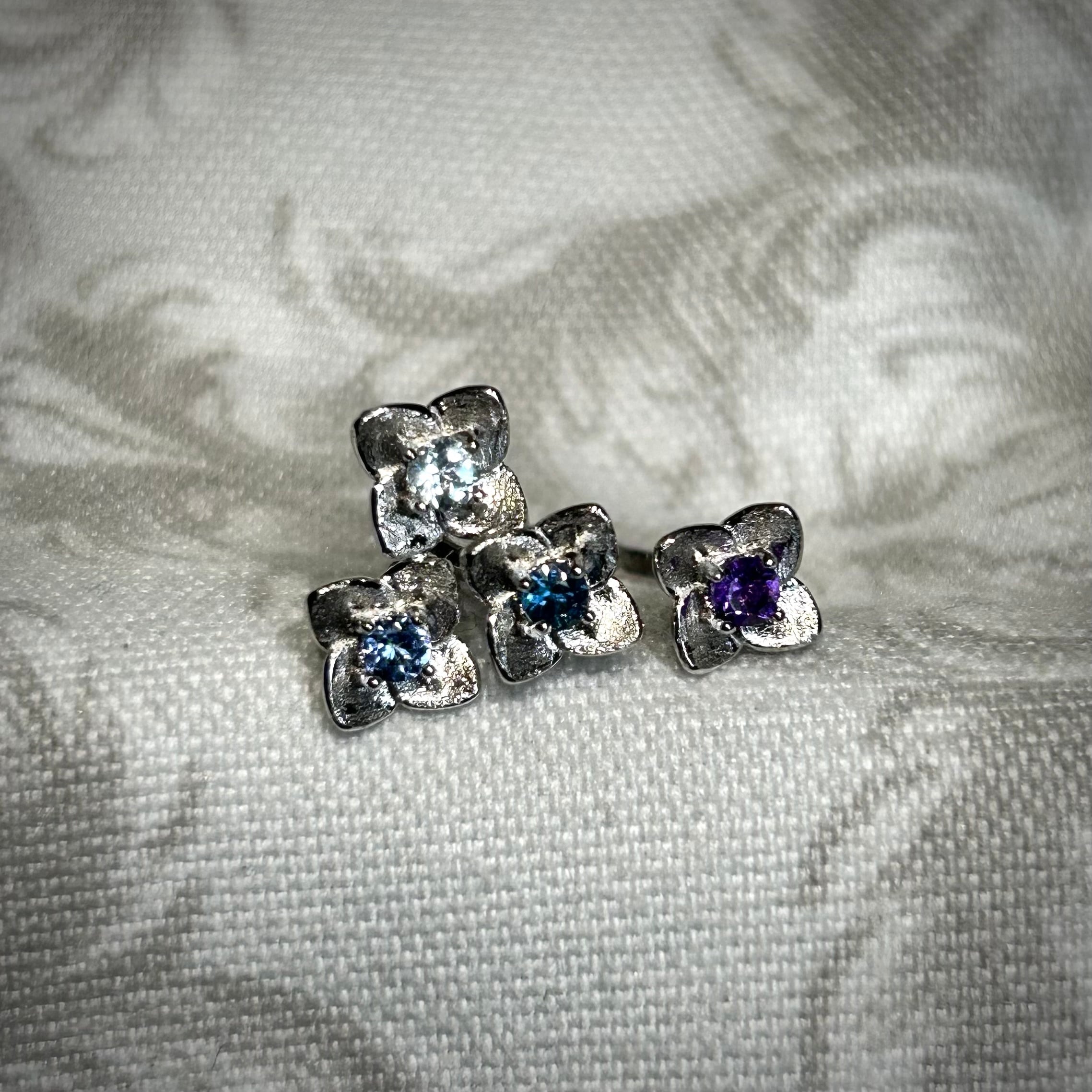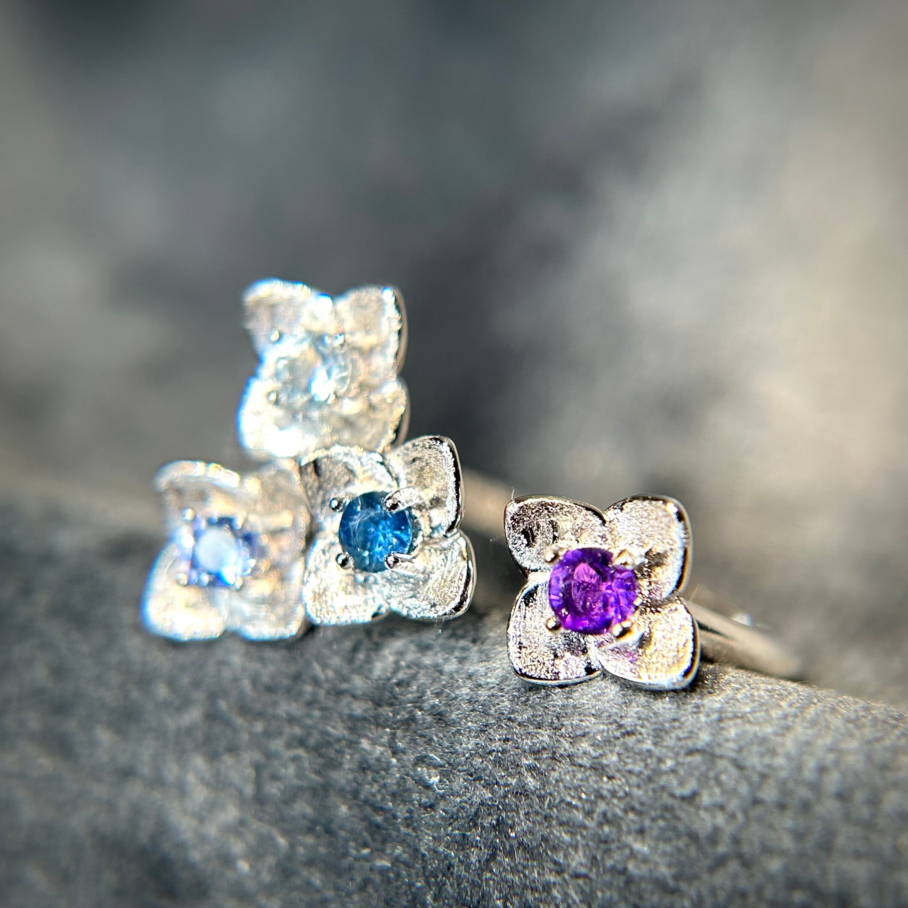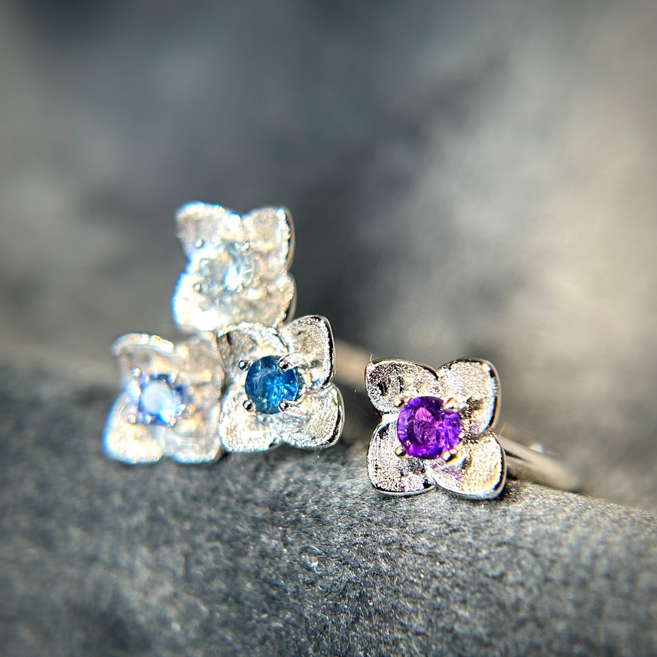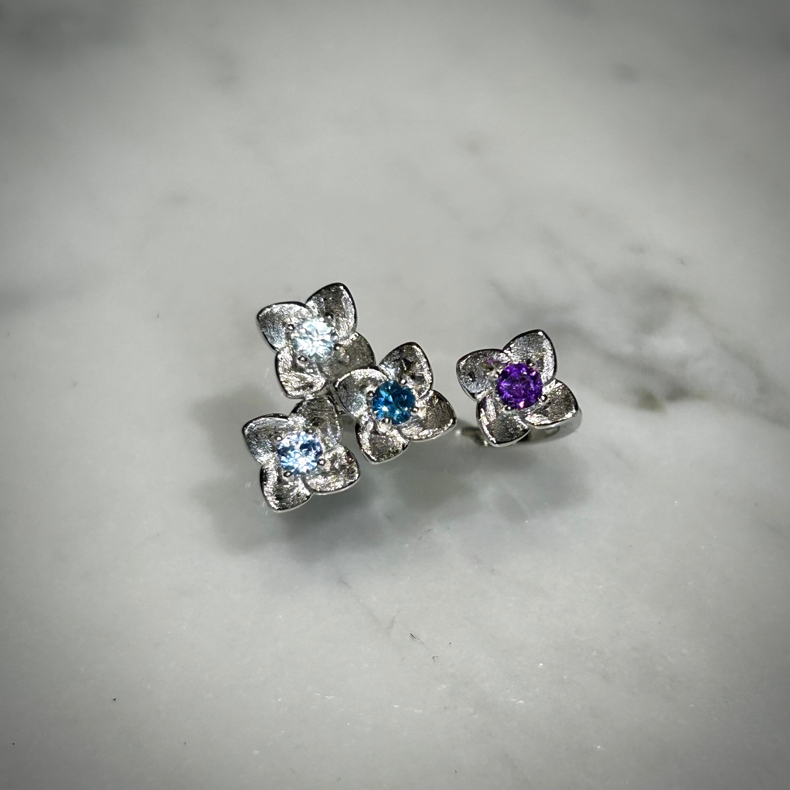 1つのリングで4種類の石が楽しめ,存在感のあるボリュームが良きなフラワーリング。