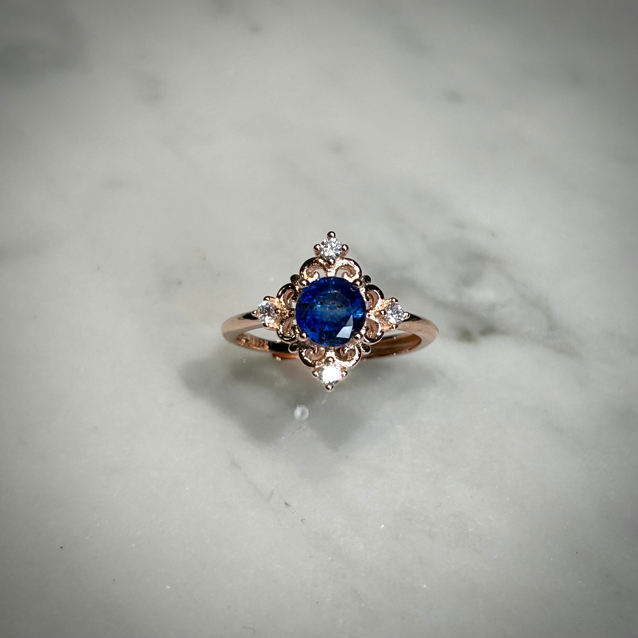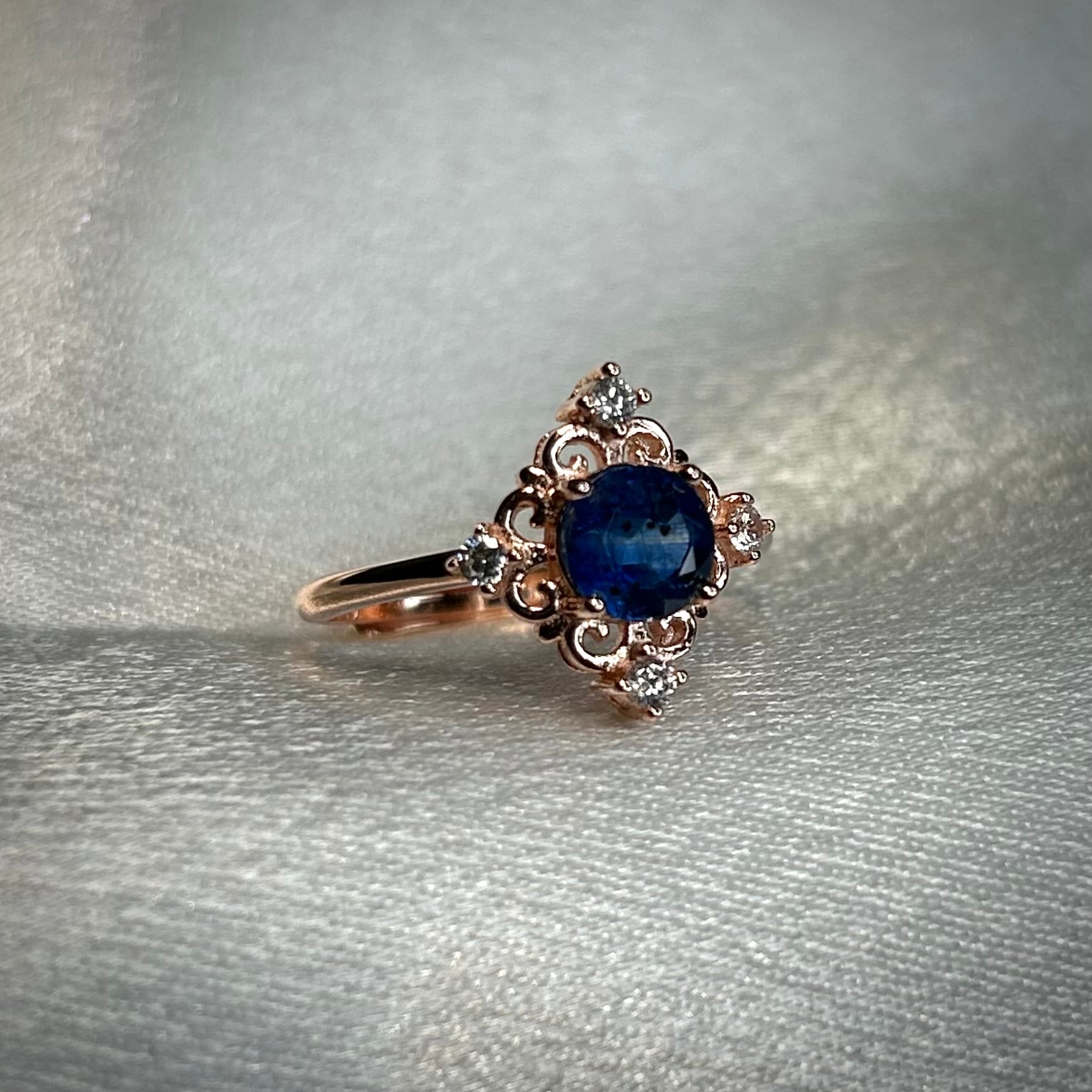 ブルーカラーの煌めきも楽しめ、アンティーク感のあるデザインとの組み合わせが上品な印象のリングとなりました。