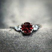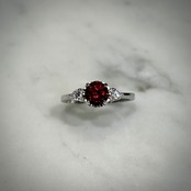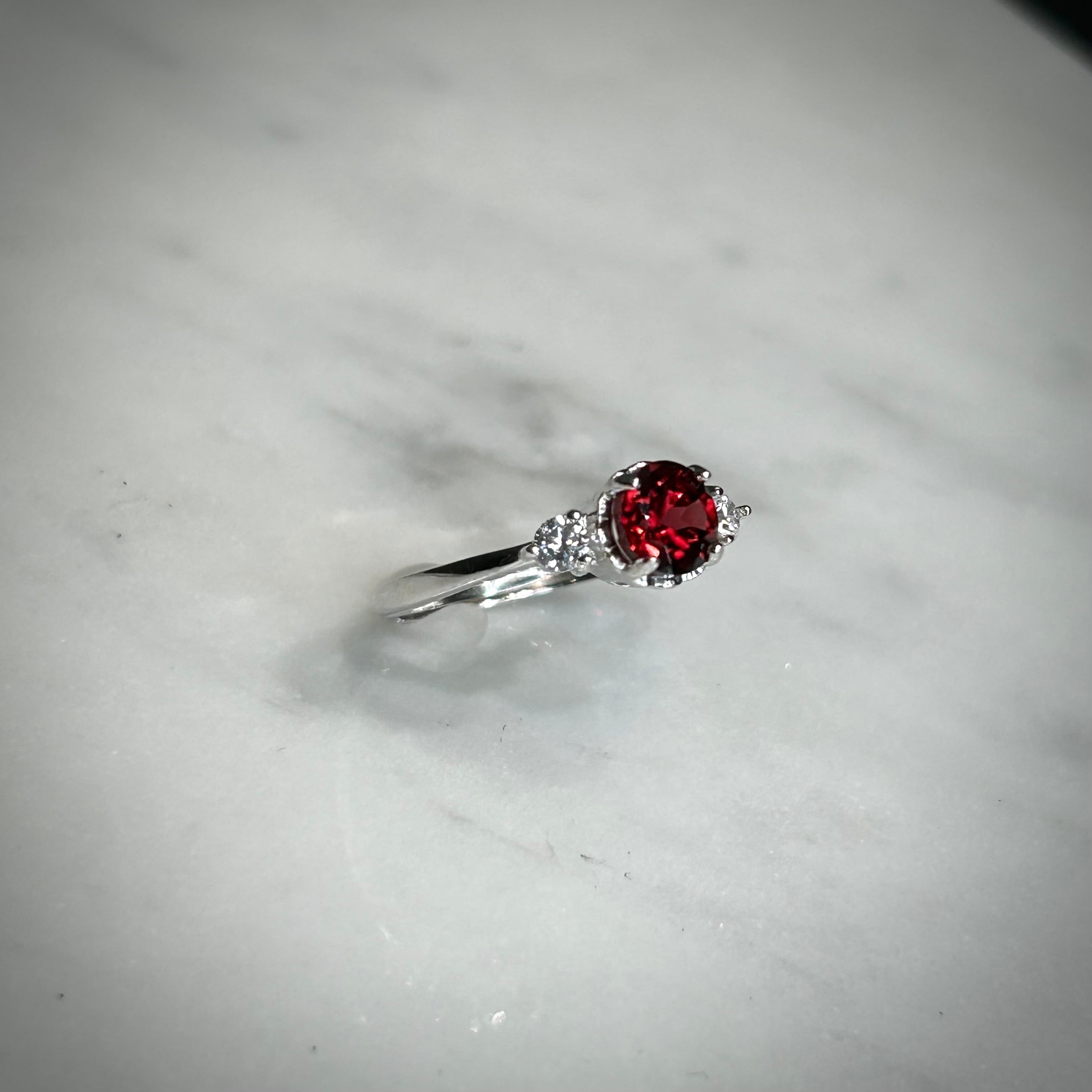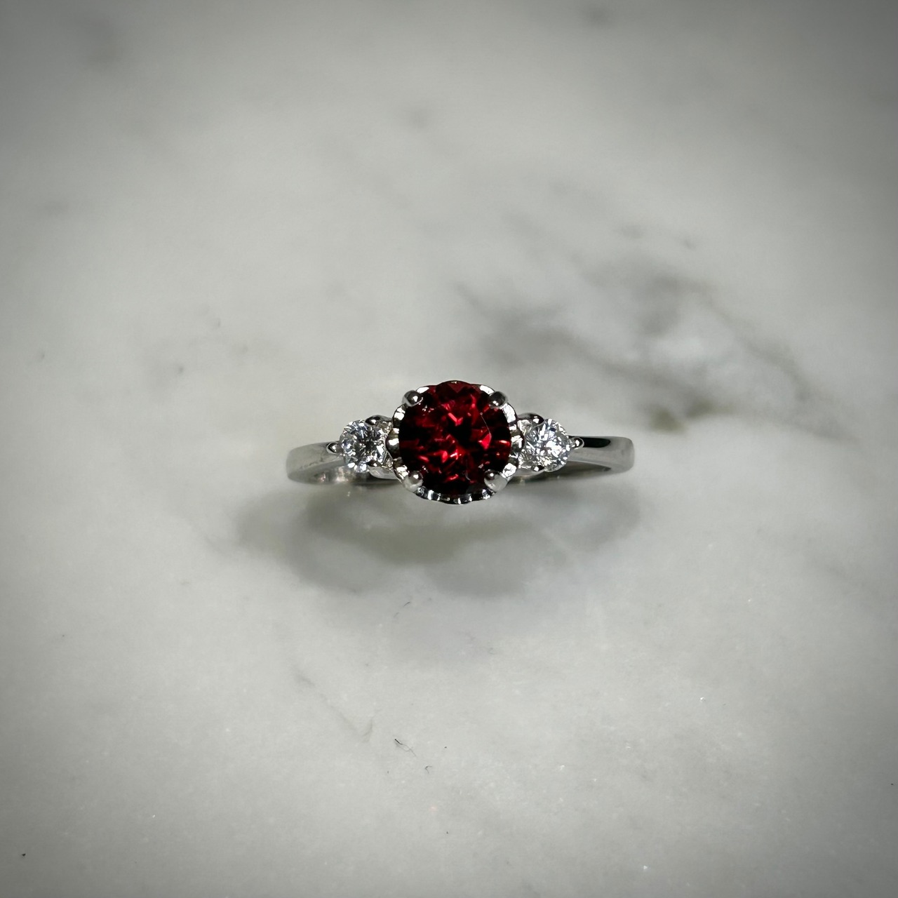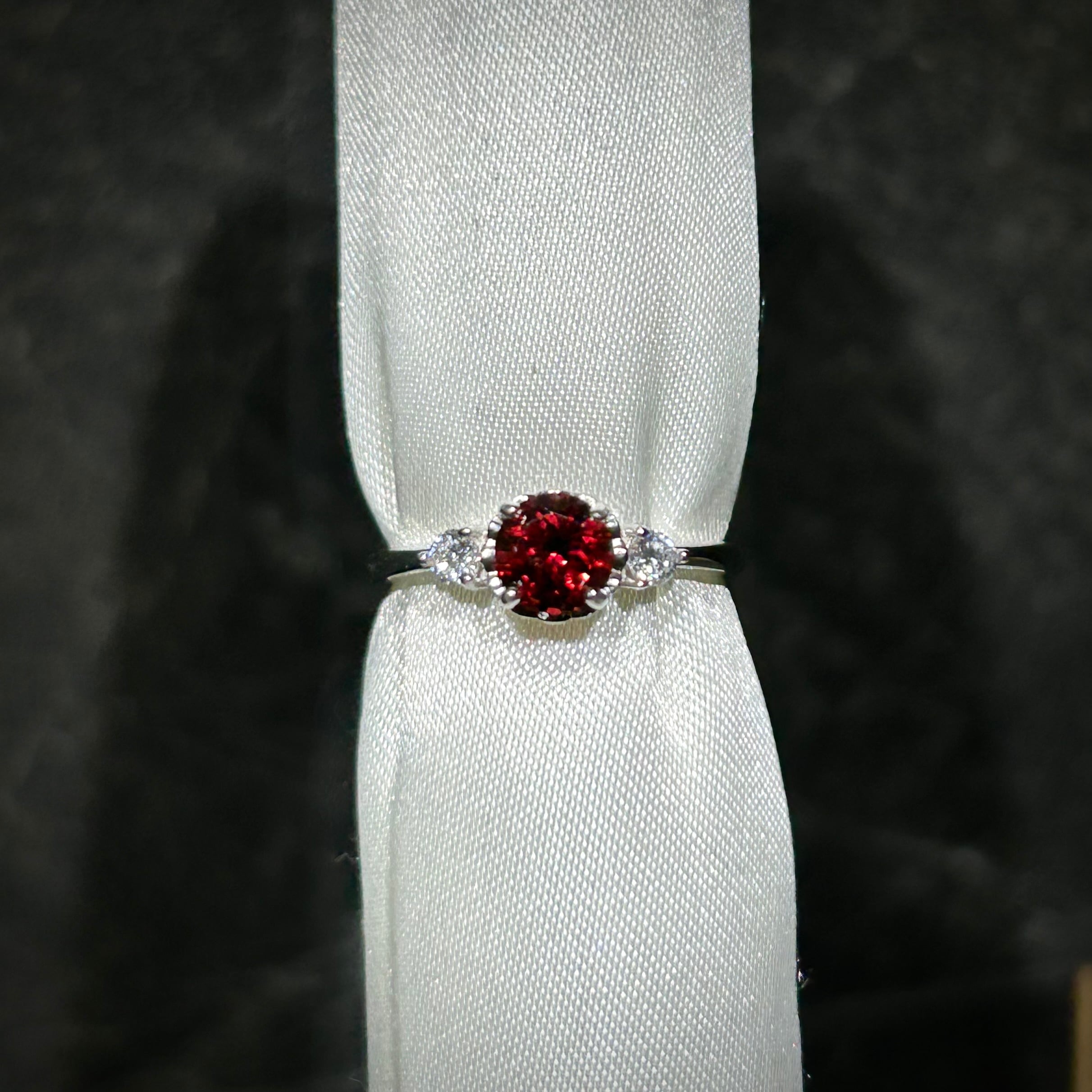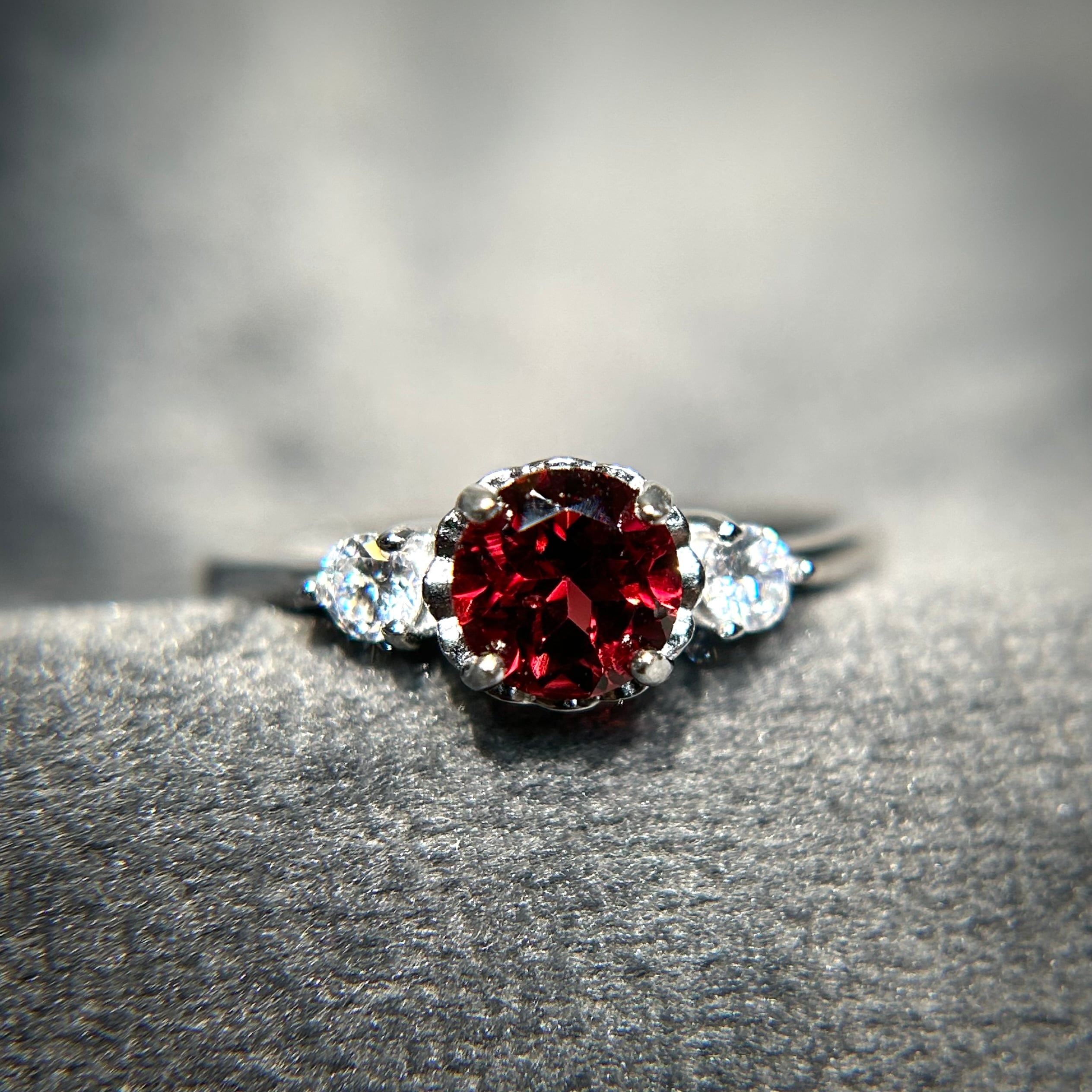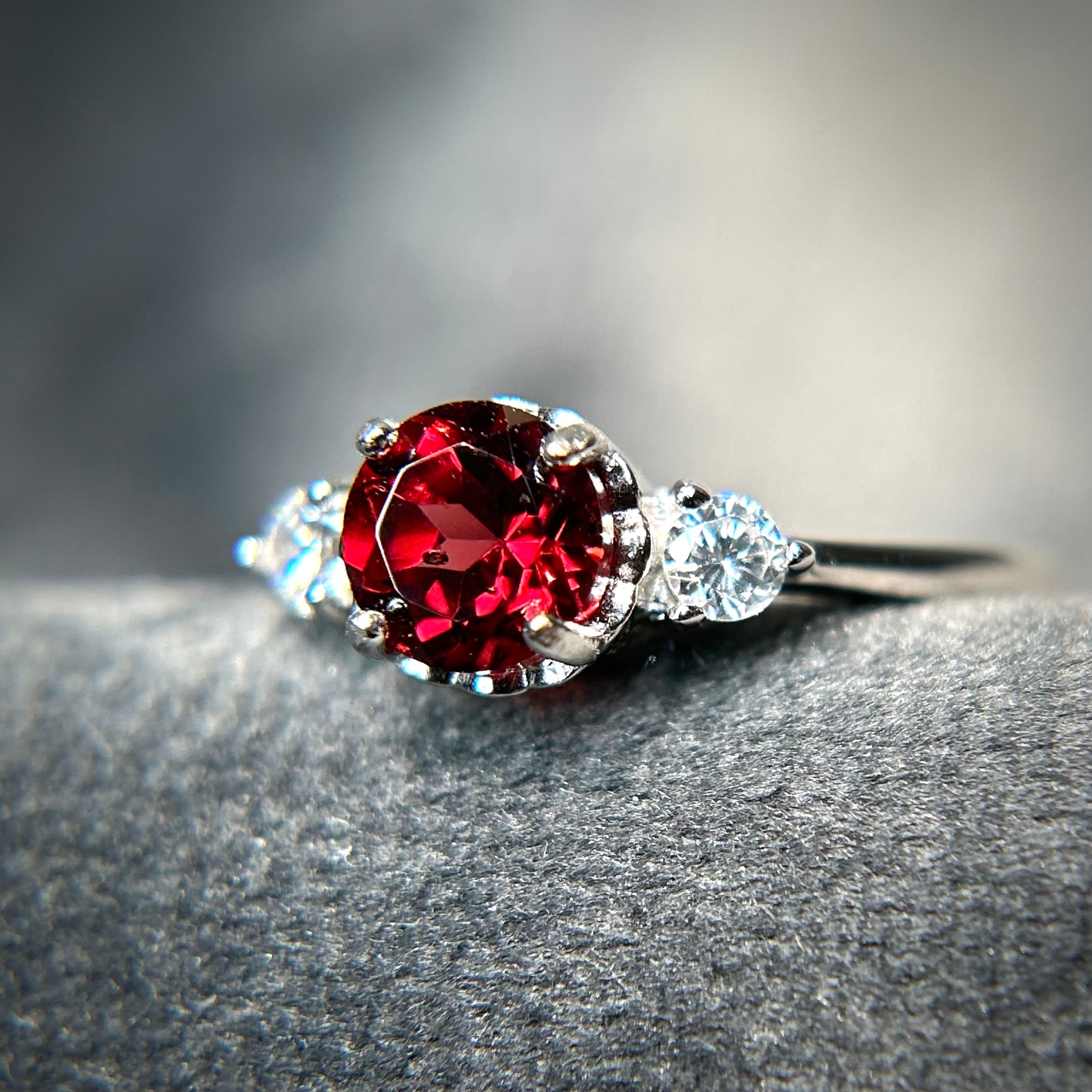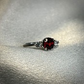 脇石2石のシンプルで使い勝手の良いデザインで、ガーネットの魅力が楽しめるリング。