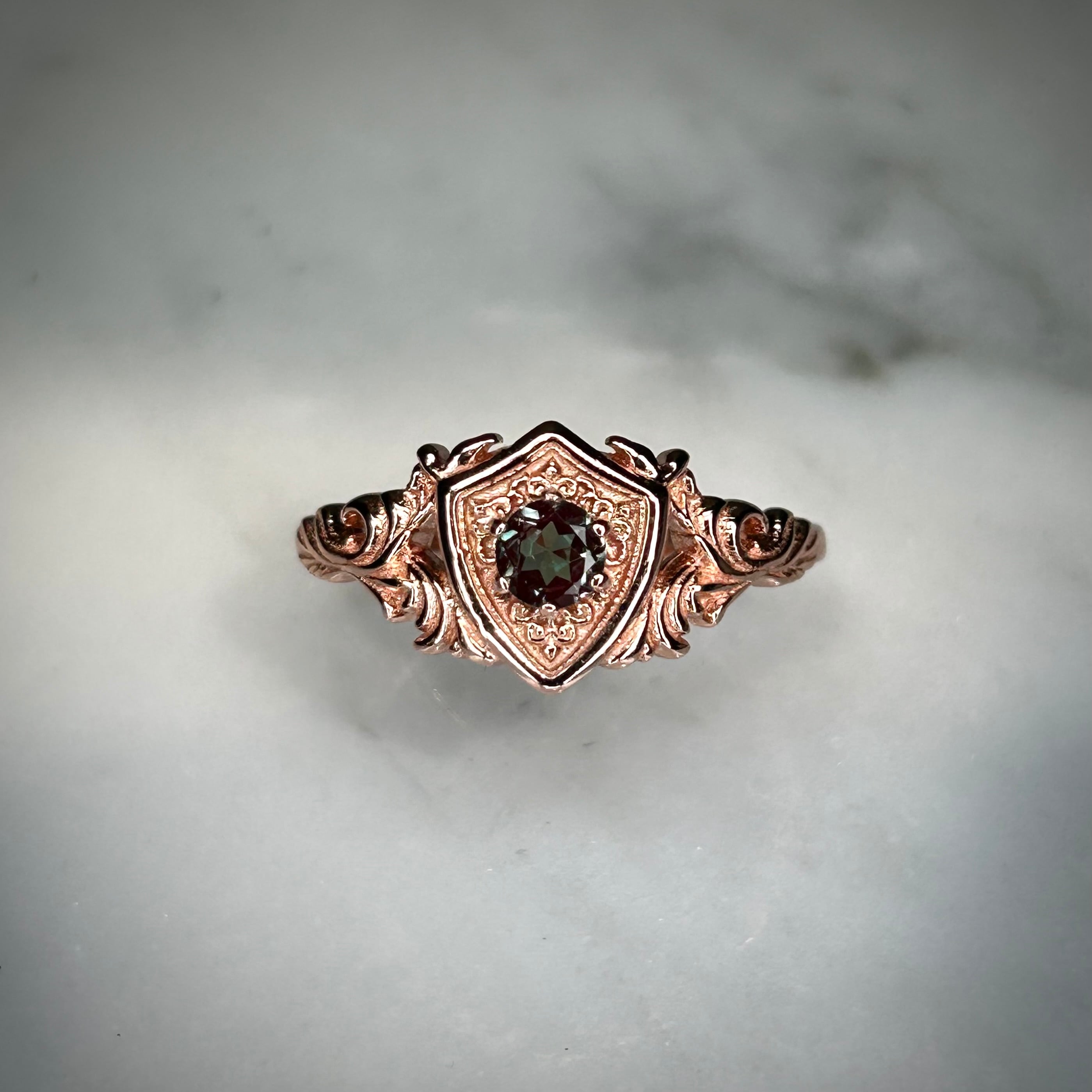 ピンクゴールドカラーに合成アレキサンドライトを合わせました。