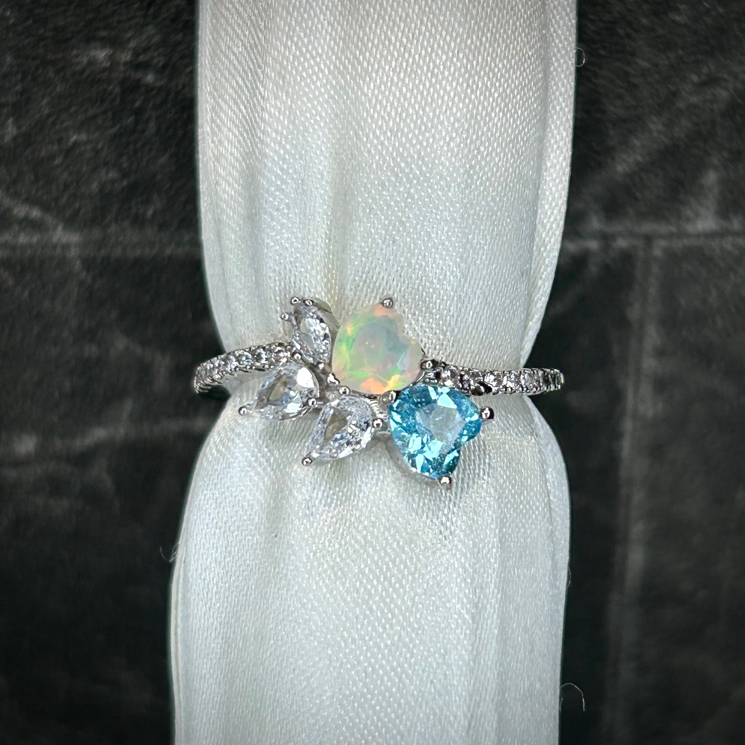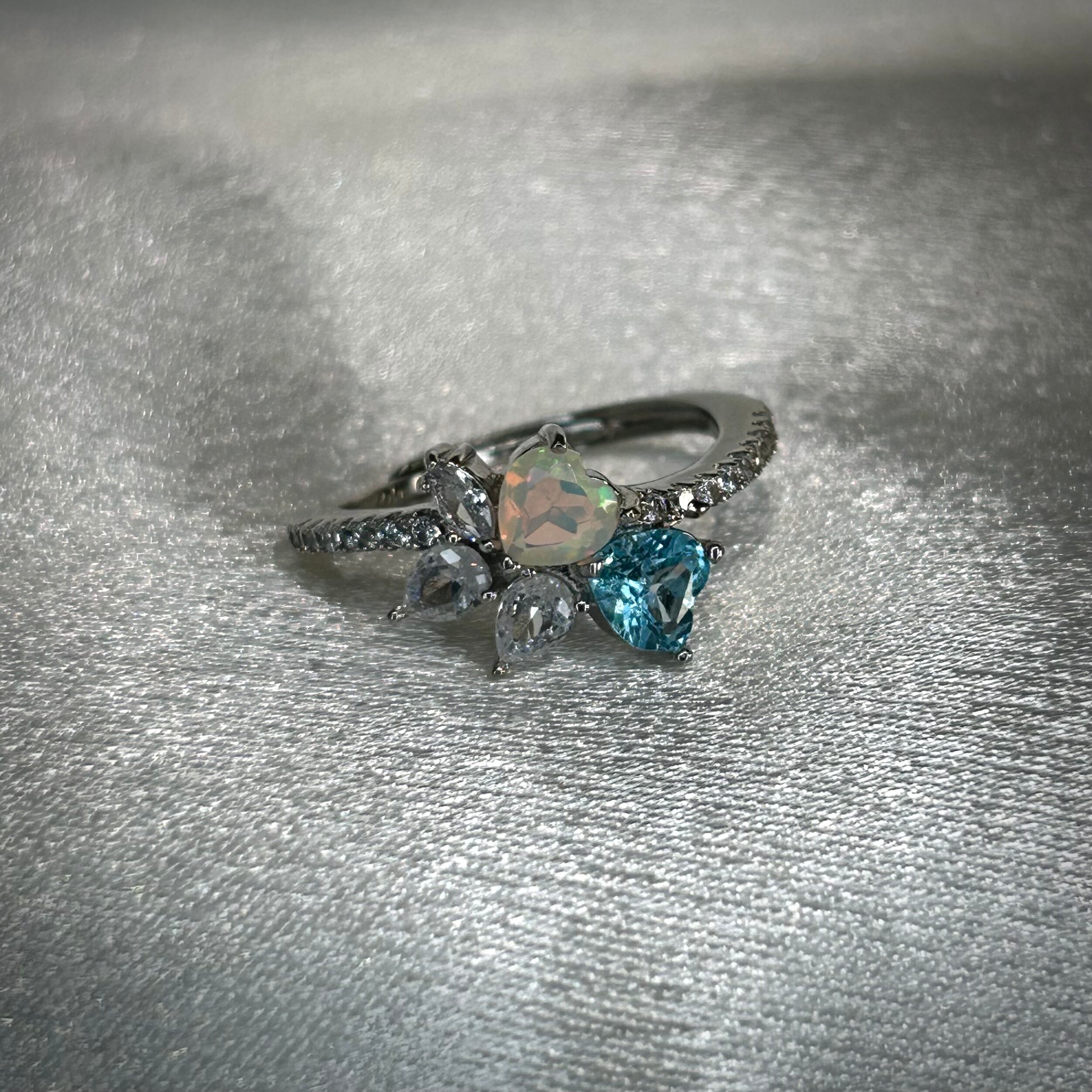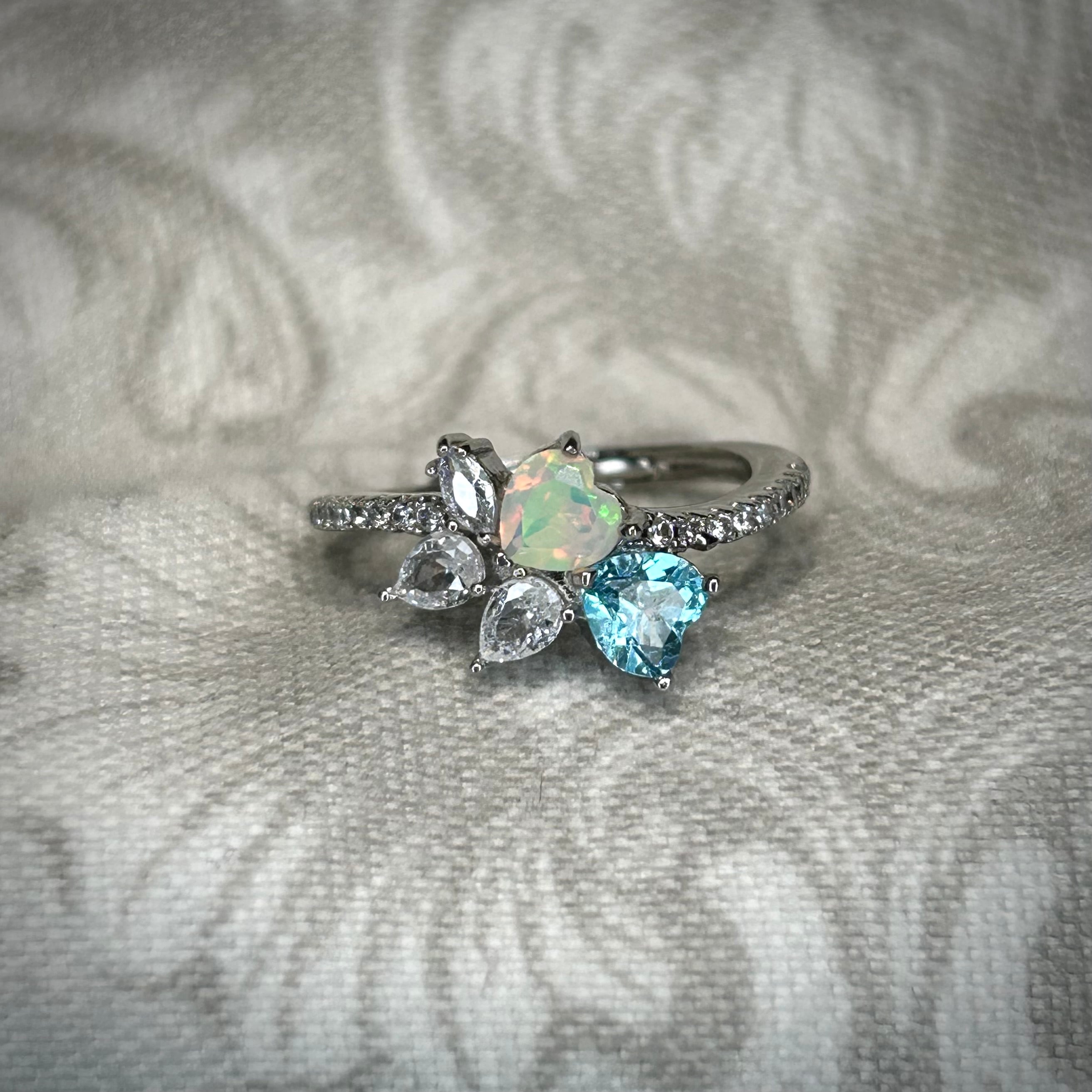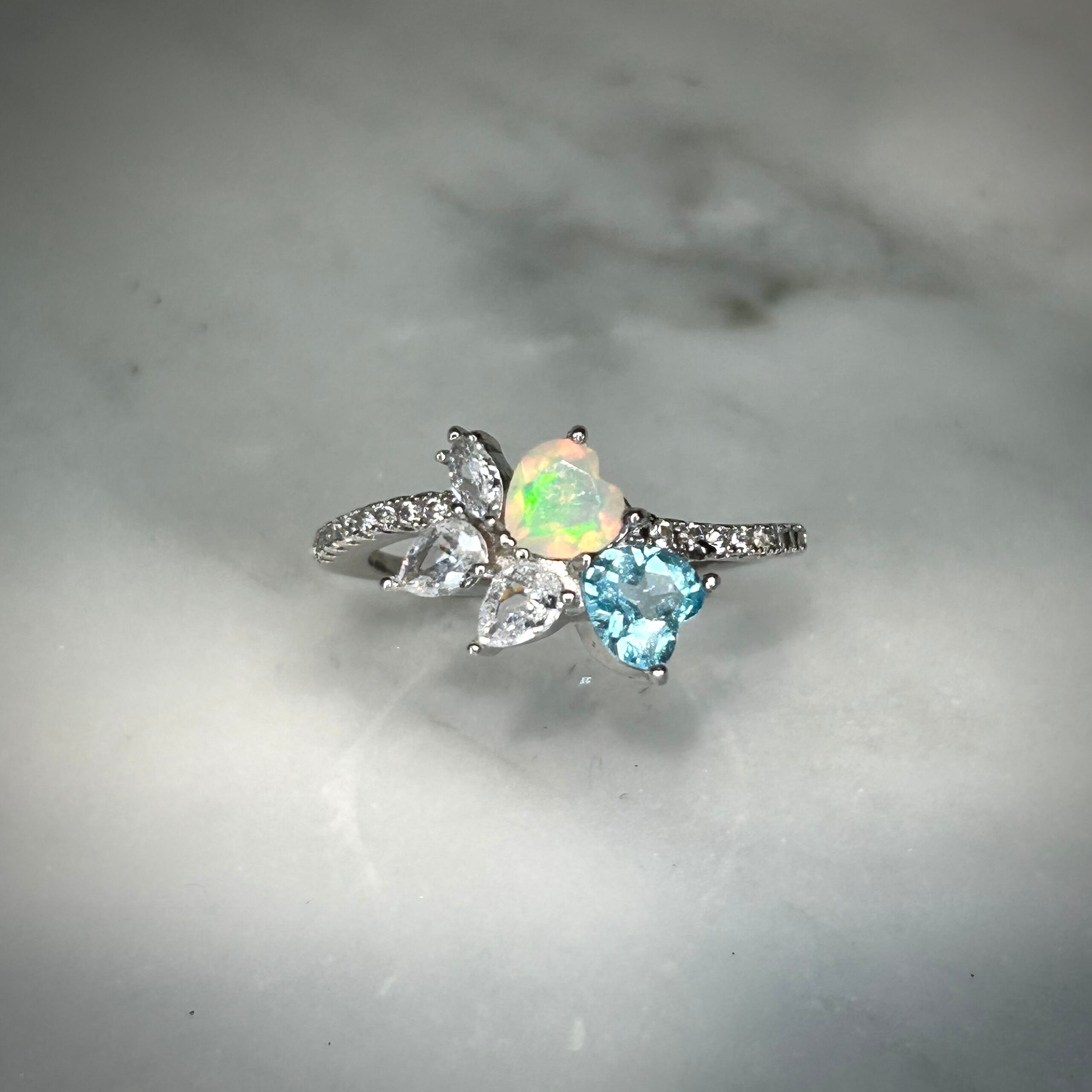 シルバー製 、オパール&トパーズのダブルハートリング。
