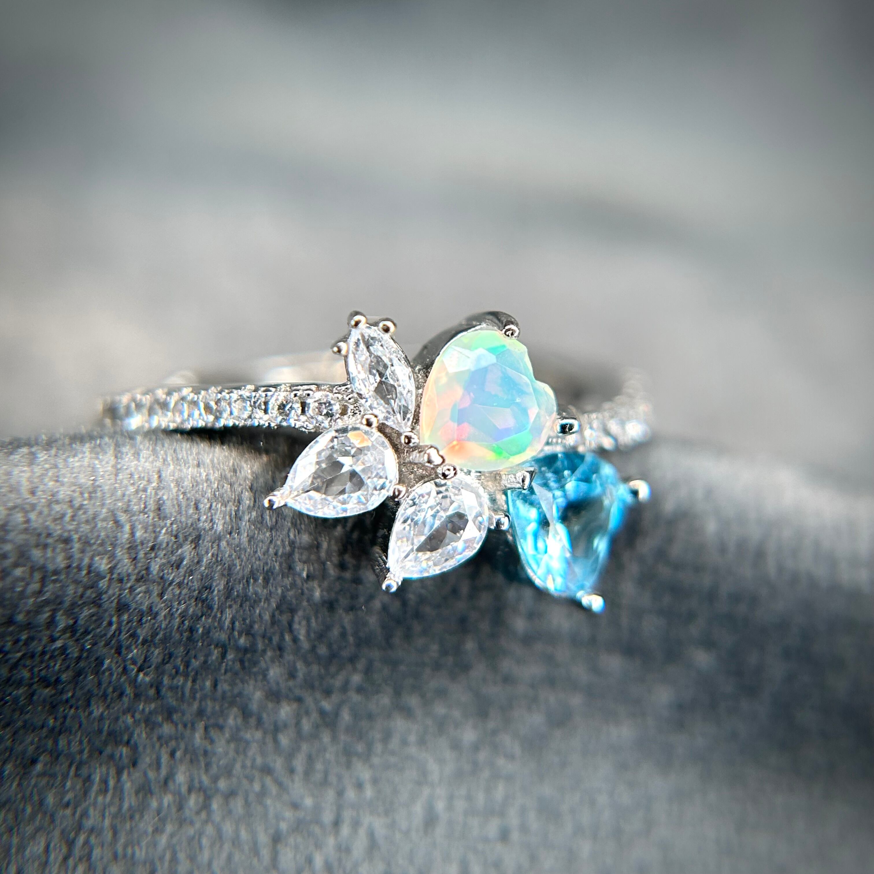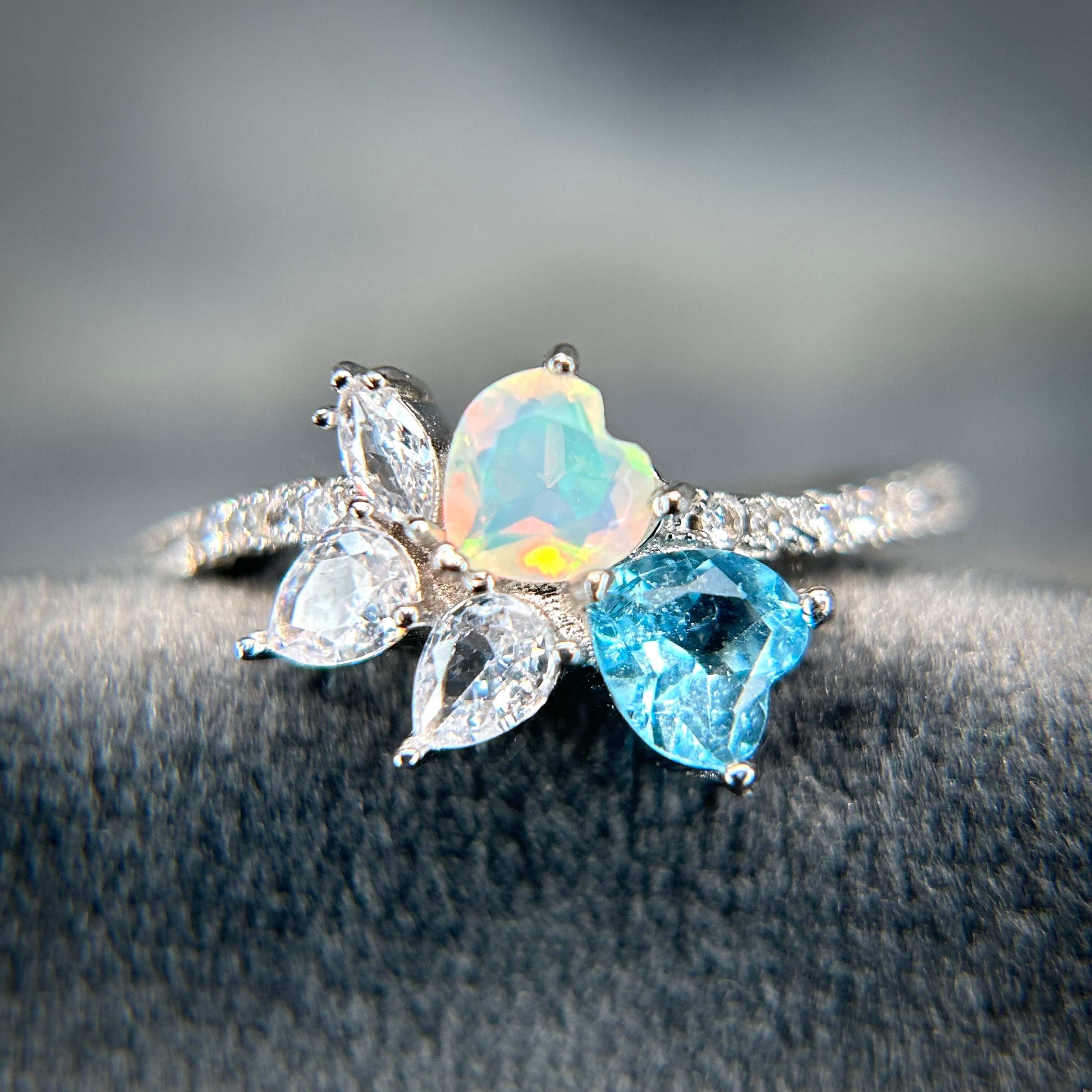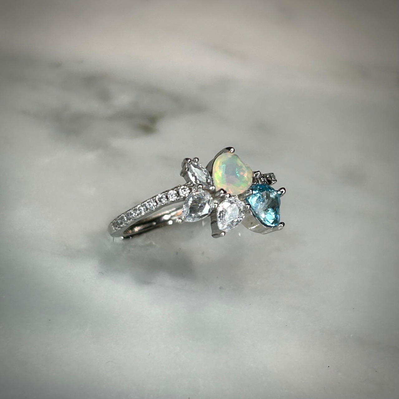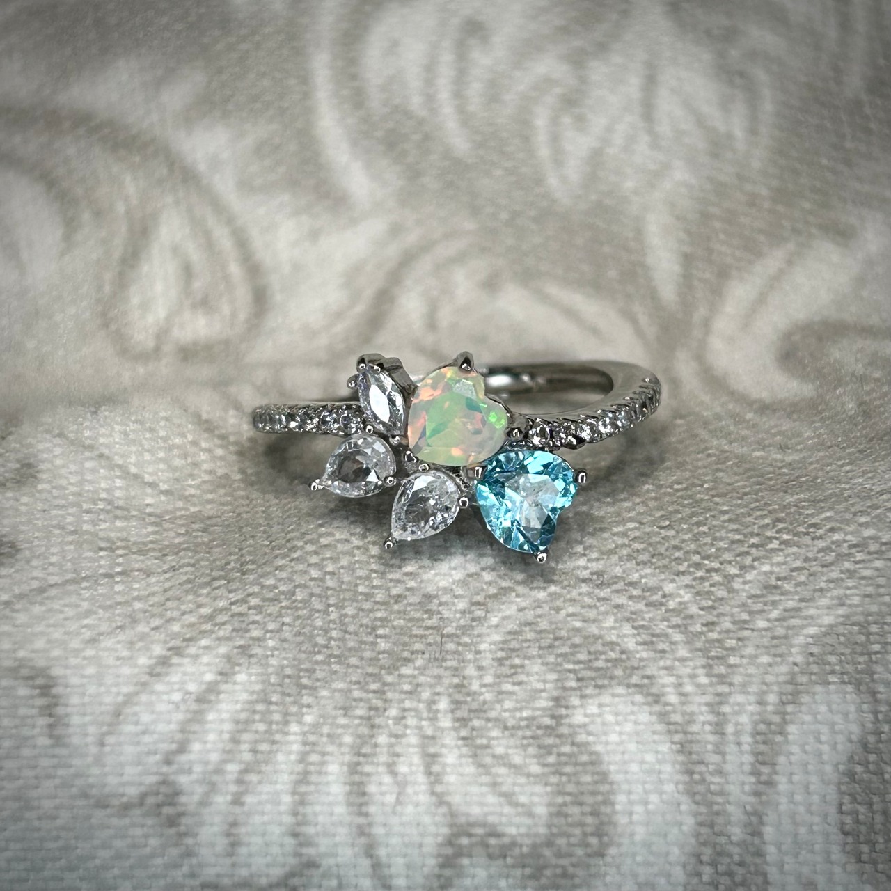 シルバー製 、オパール&トパーズのダブルハートリング。