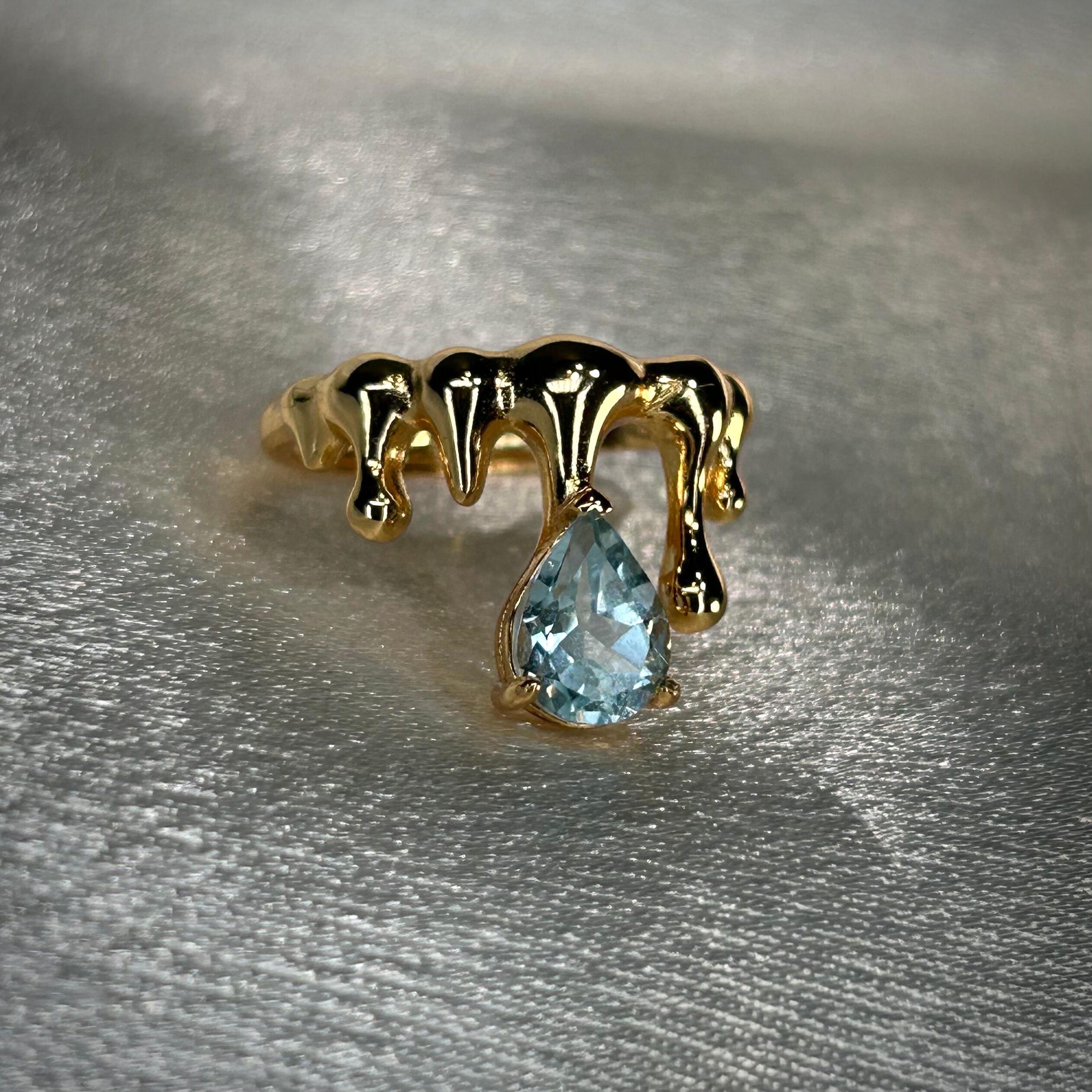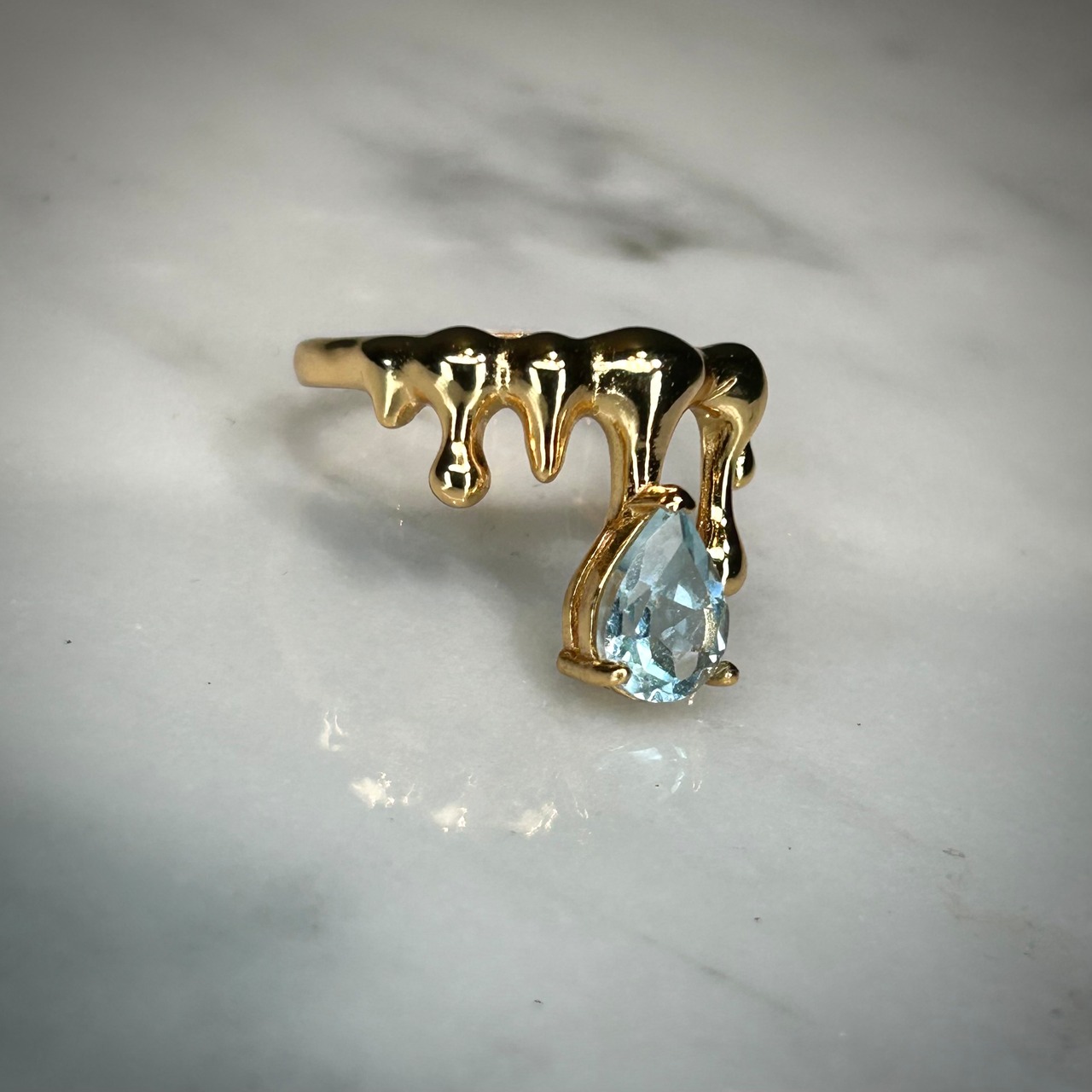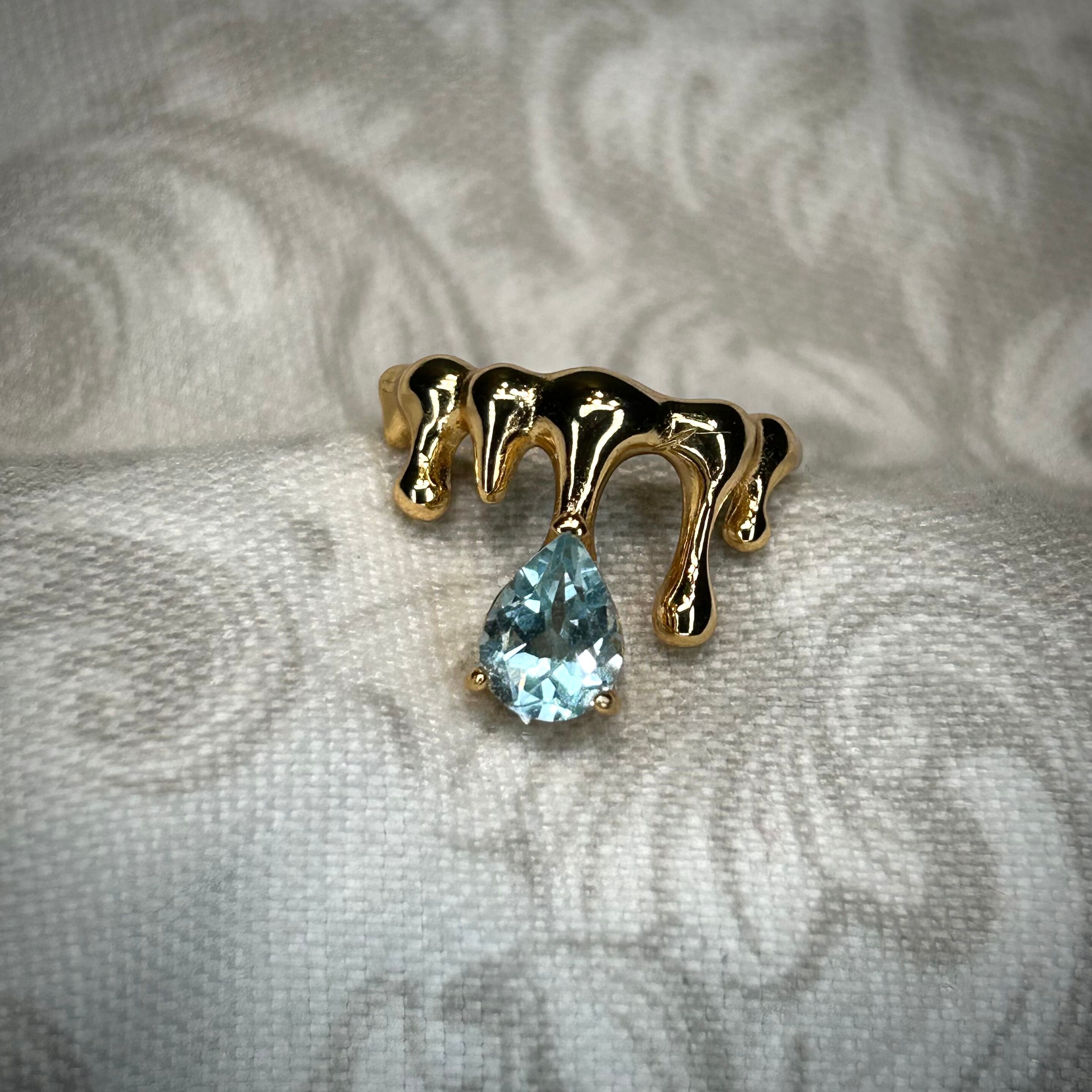 液体が滴るようなクールなデザインに、ゴールドカラーに美しく煌めくトパーズを合わせることで、存在感のある個性的なリングとなりました。