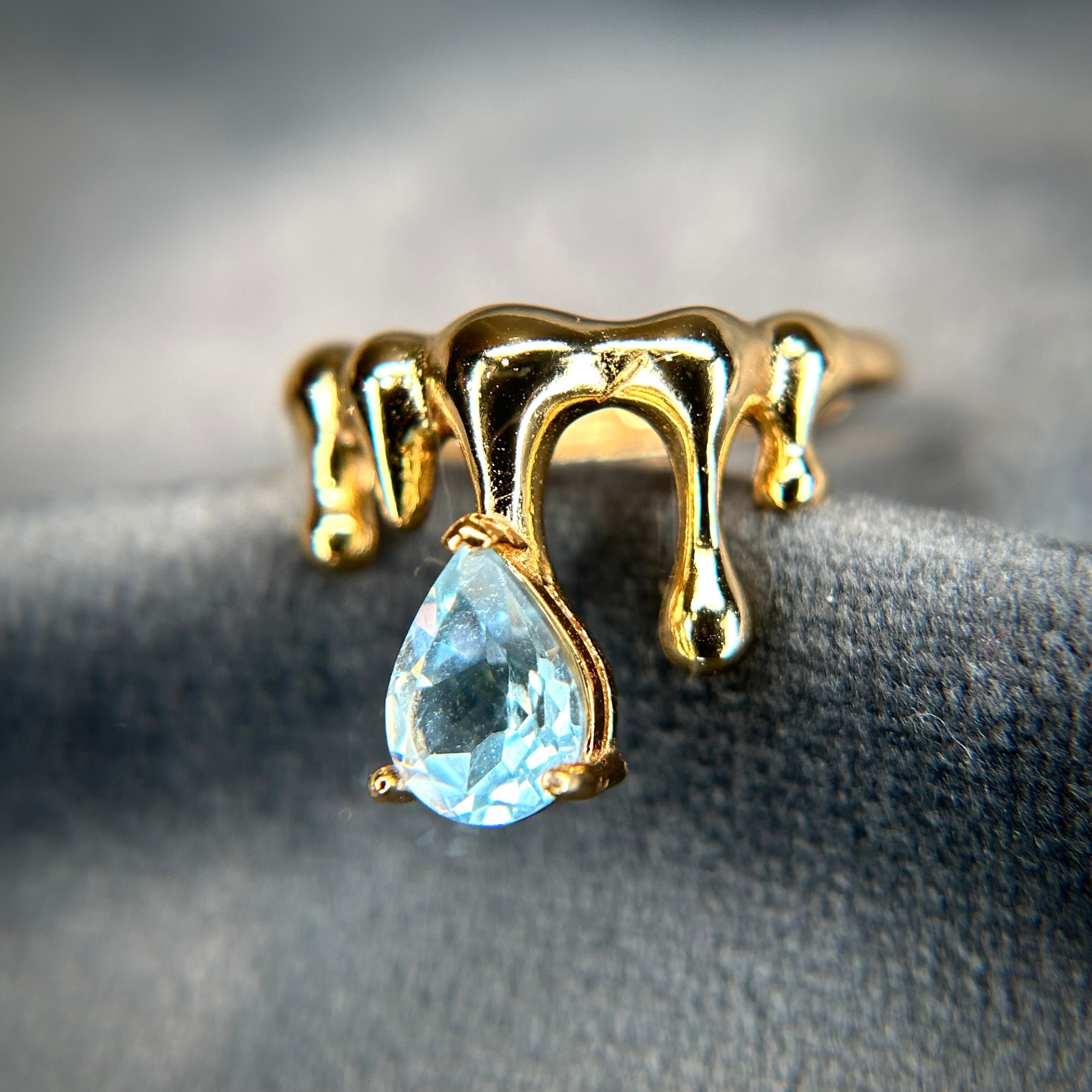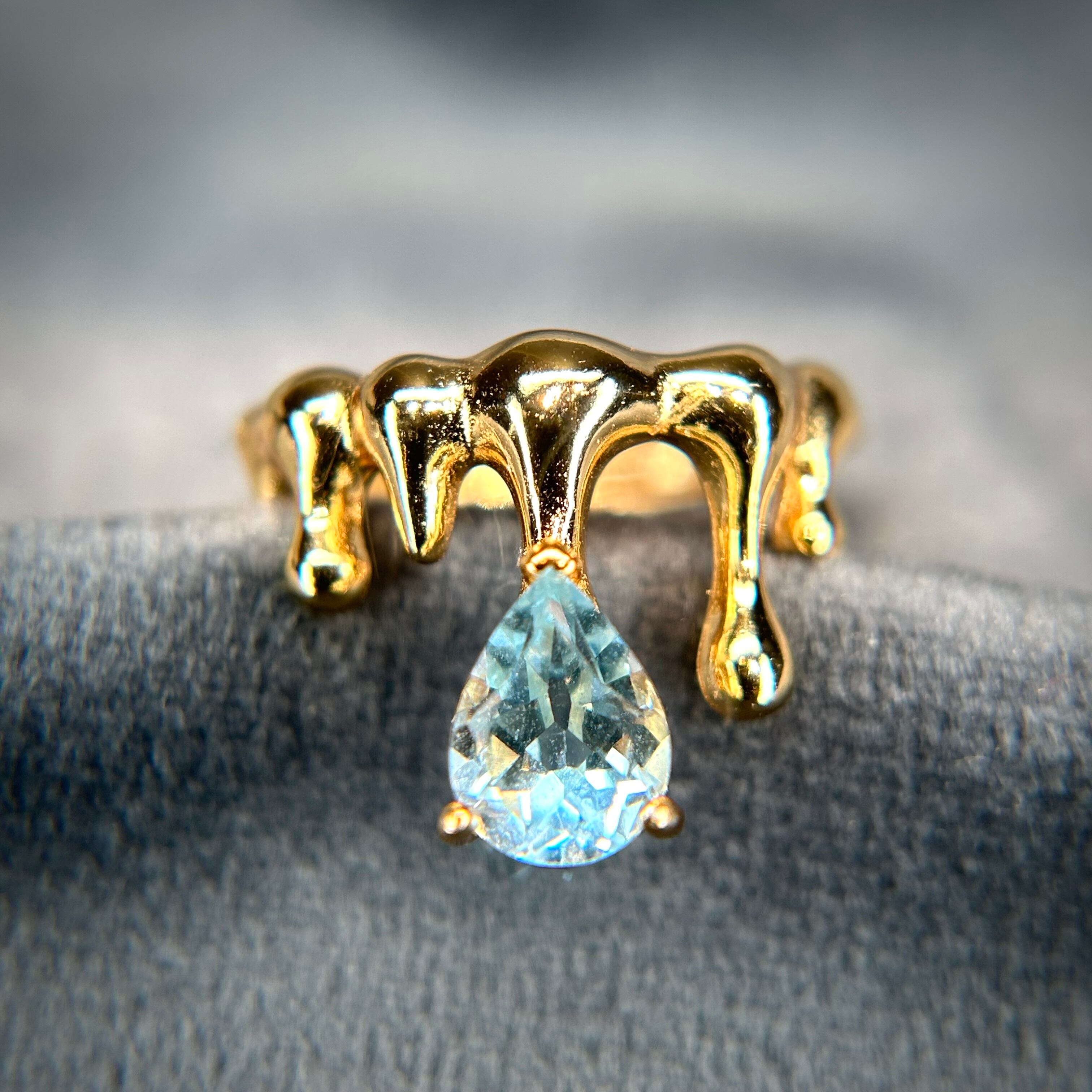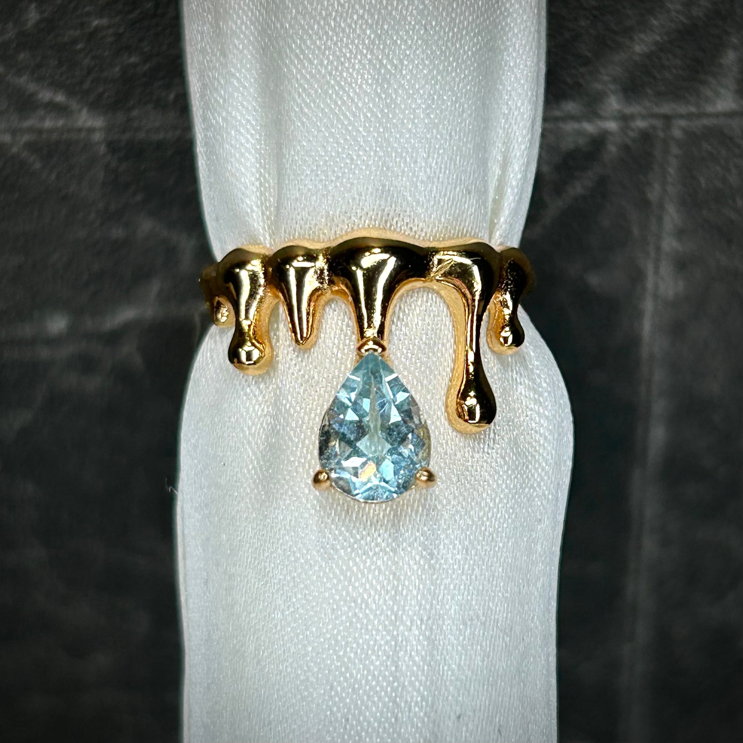 液体が滴るようなクールなデザインに、ゴールドカラーに美しく煌めくトパーズを合わせることで、存在感のある個性的なリングとなりました。