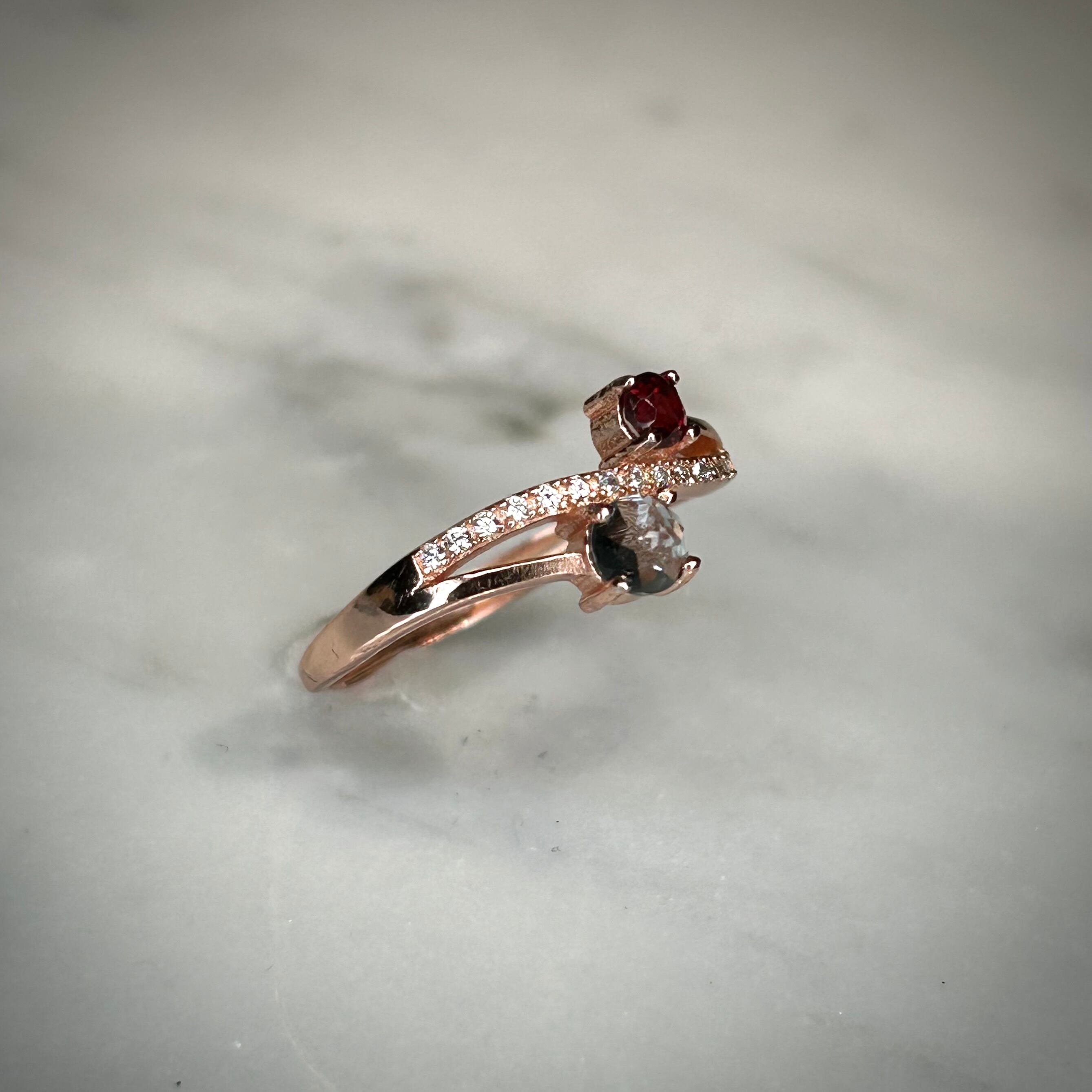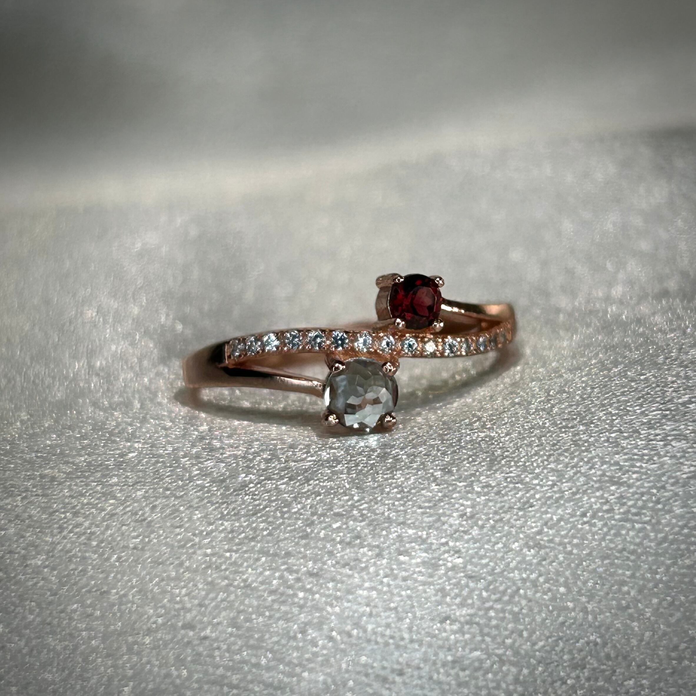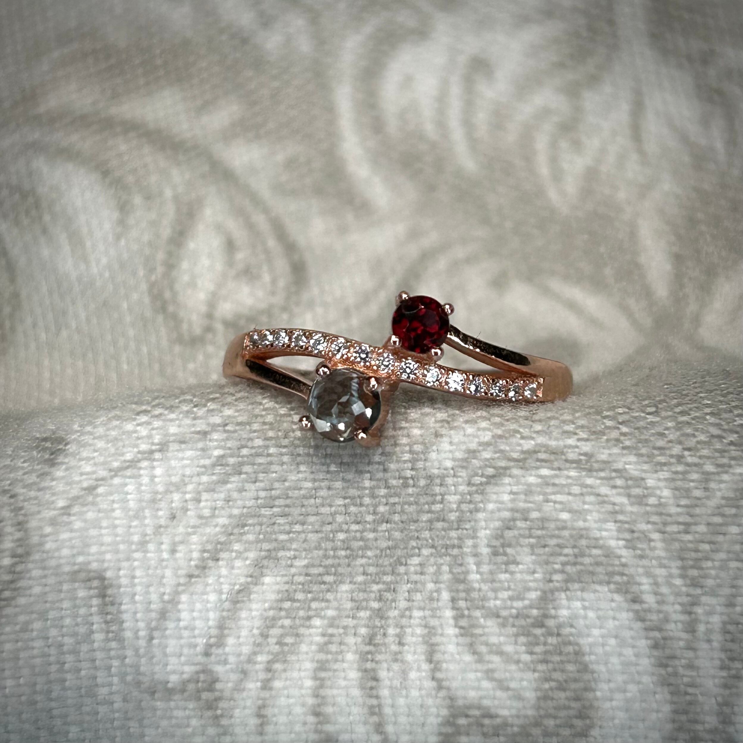シルバー製ピンクゴールドカラー 、ガーネット&トパーズのツインリング。