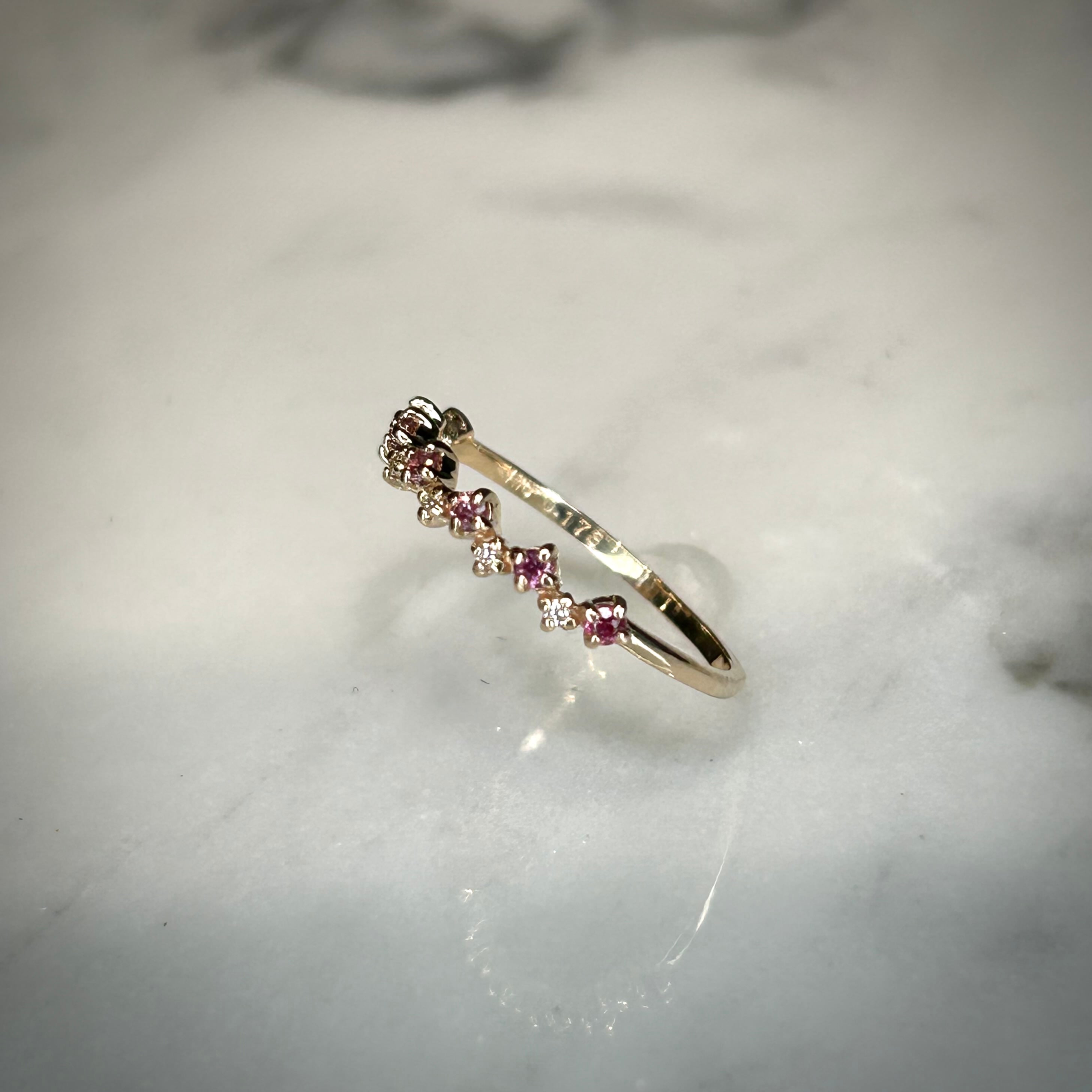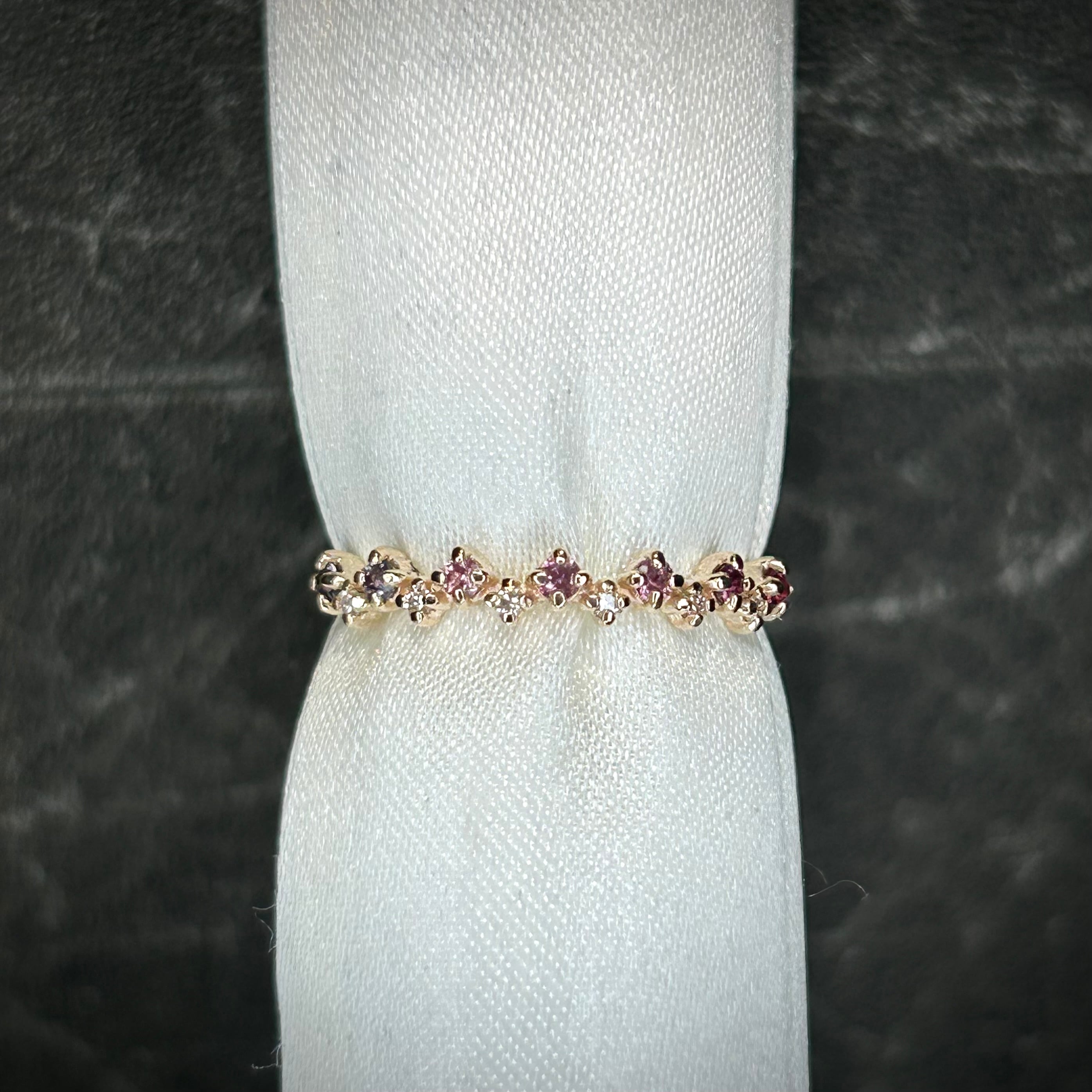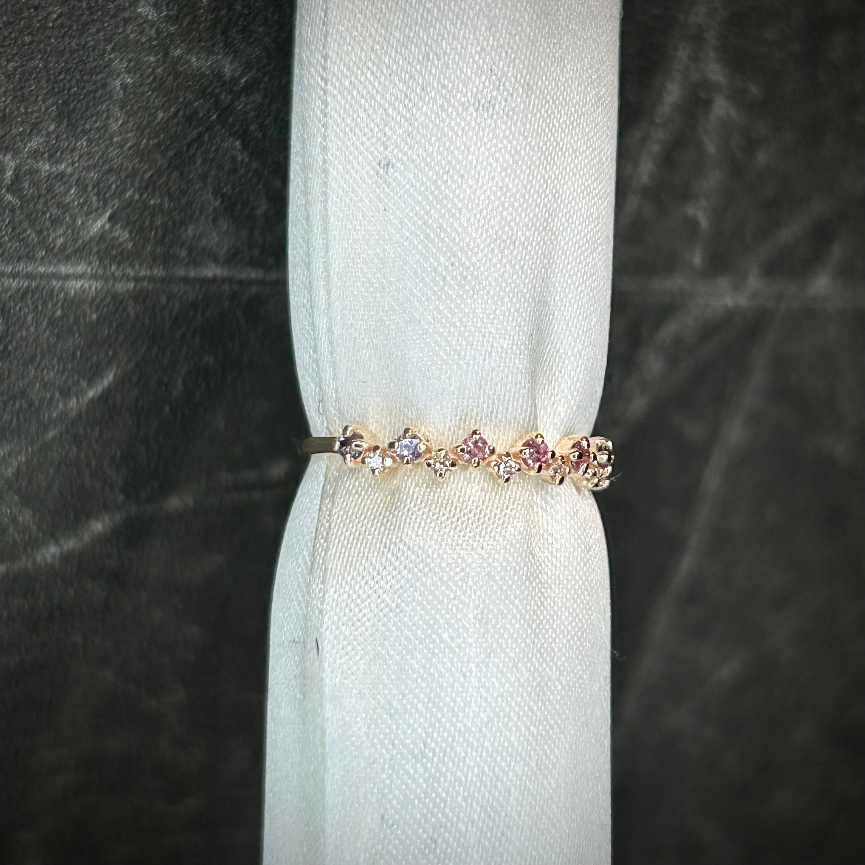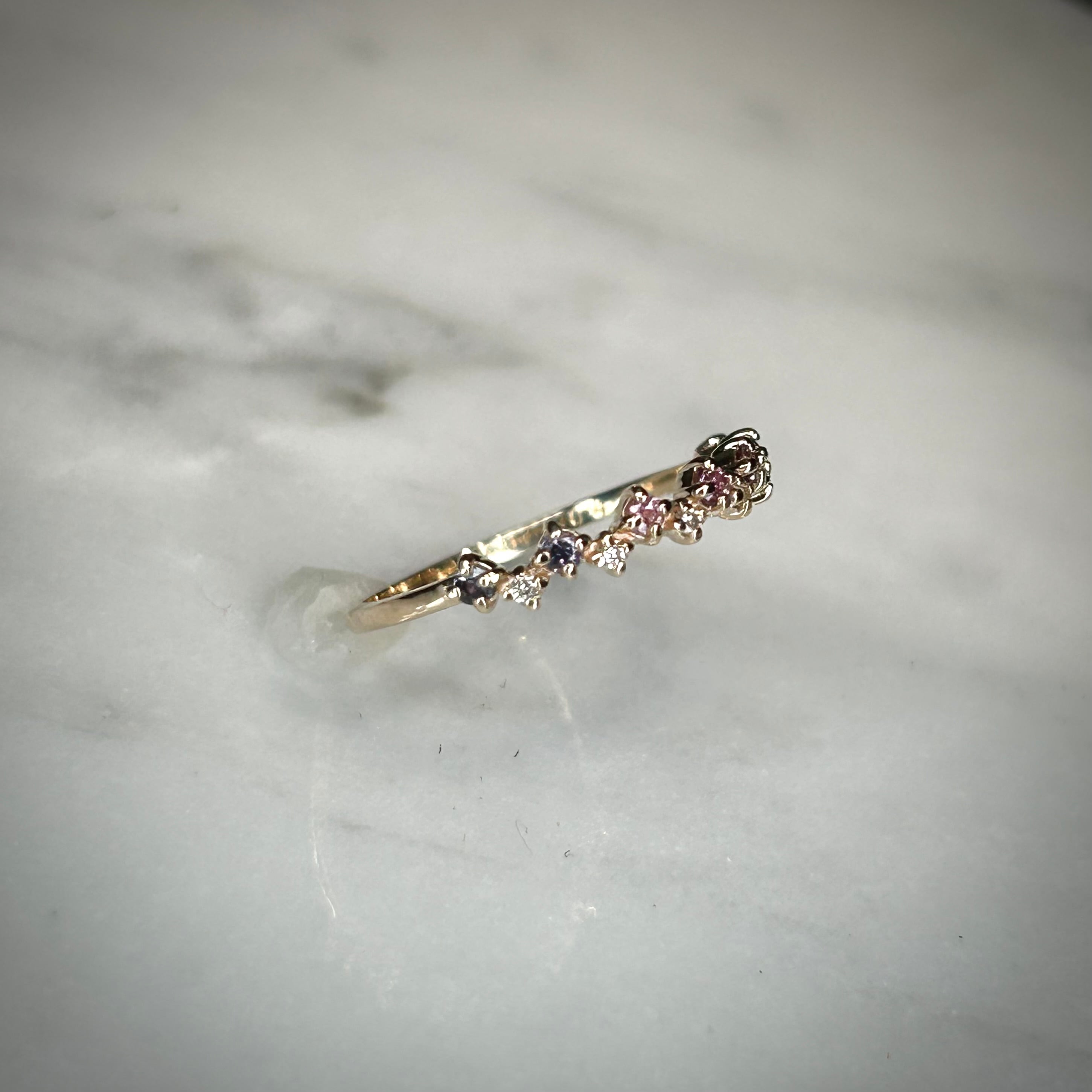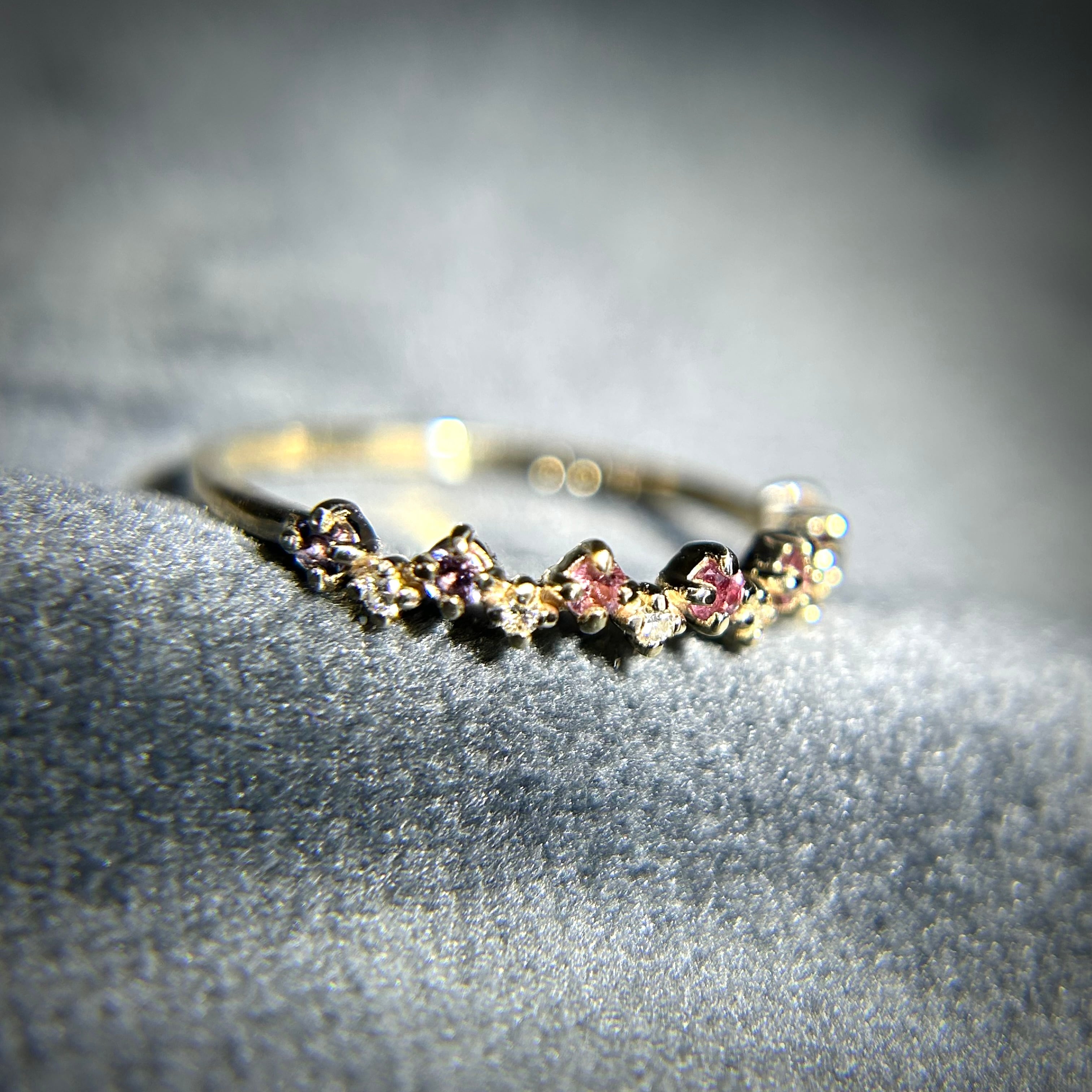 パープル~ピンクカラーのサファイアを使用し、色とりどりのサファイアが可愛い花の様で花灯(はなあかり)のように感じられます。