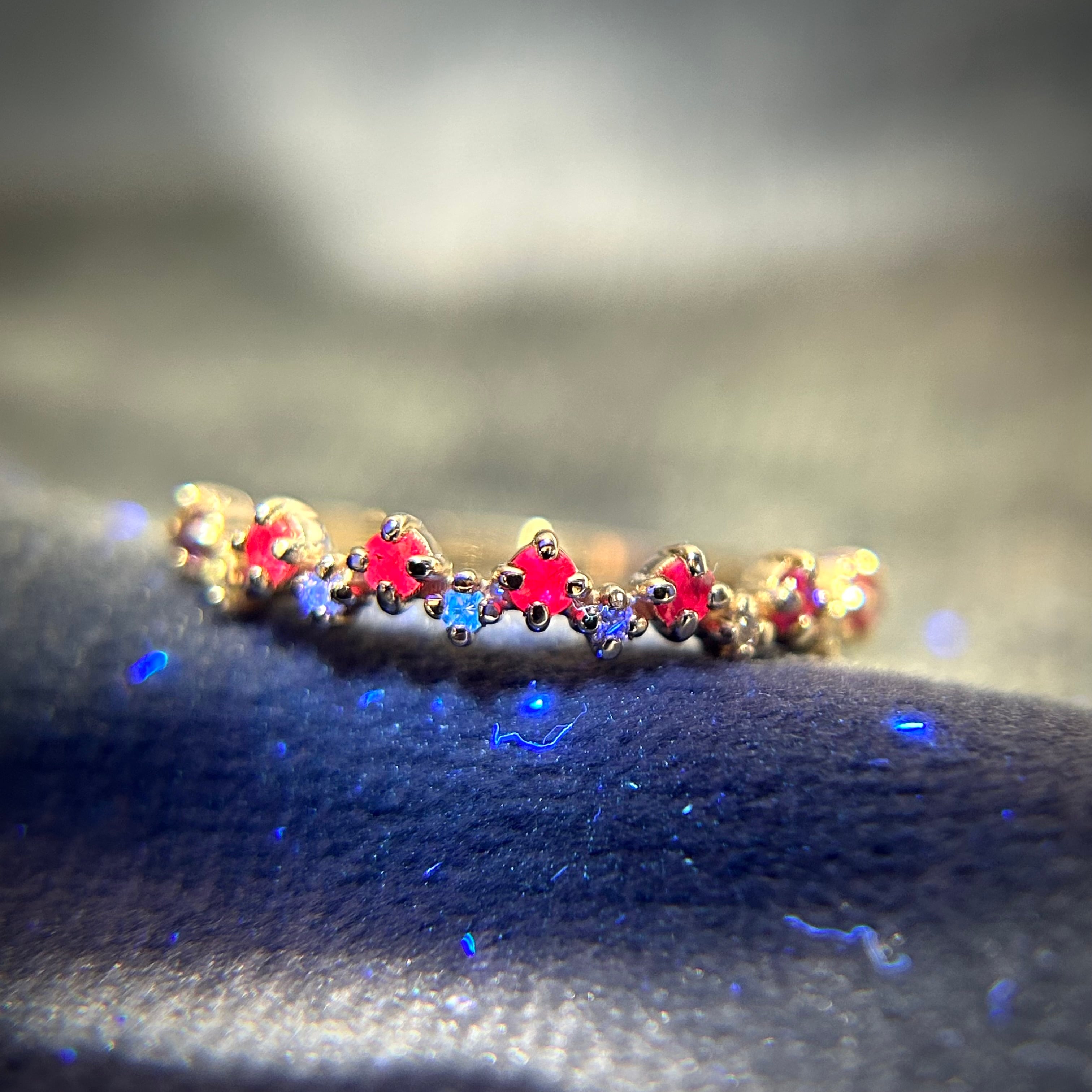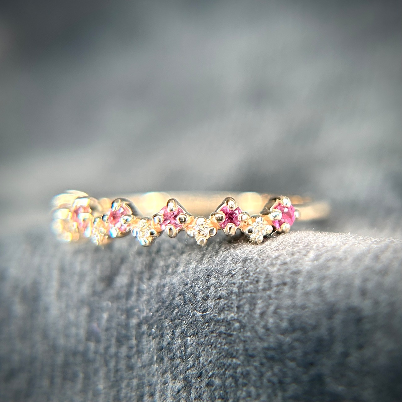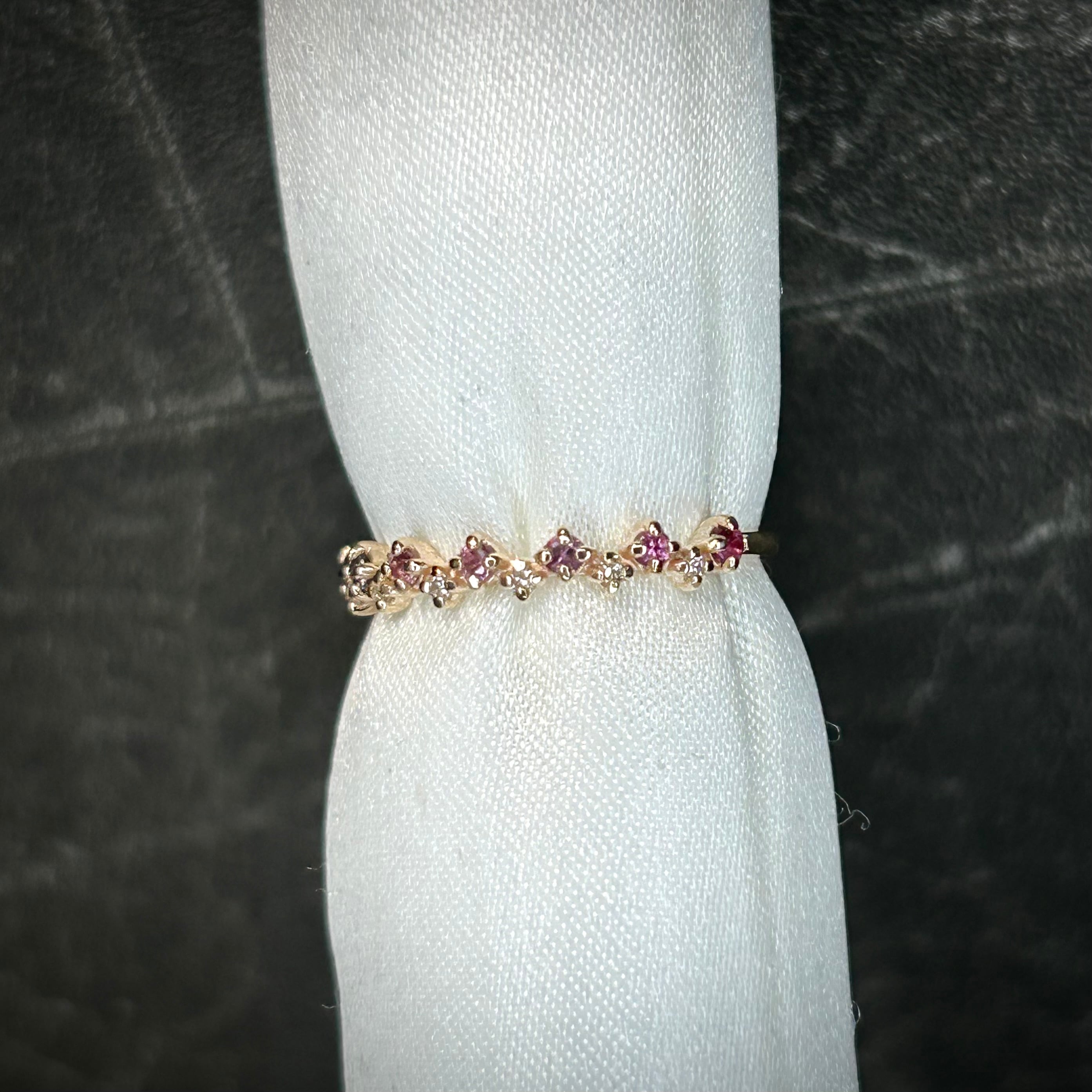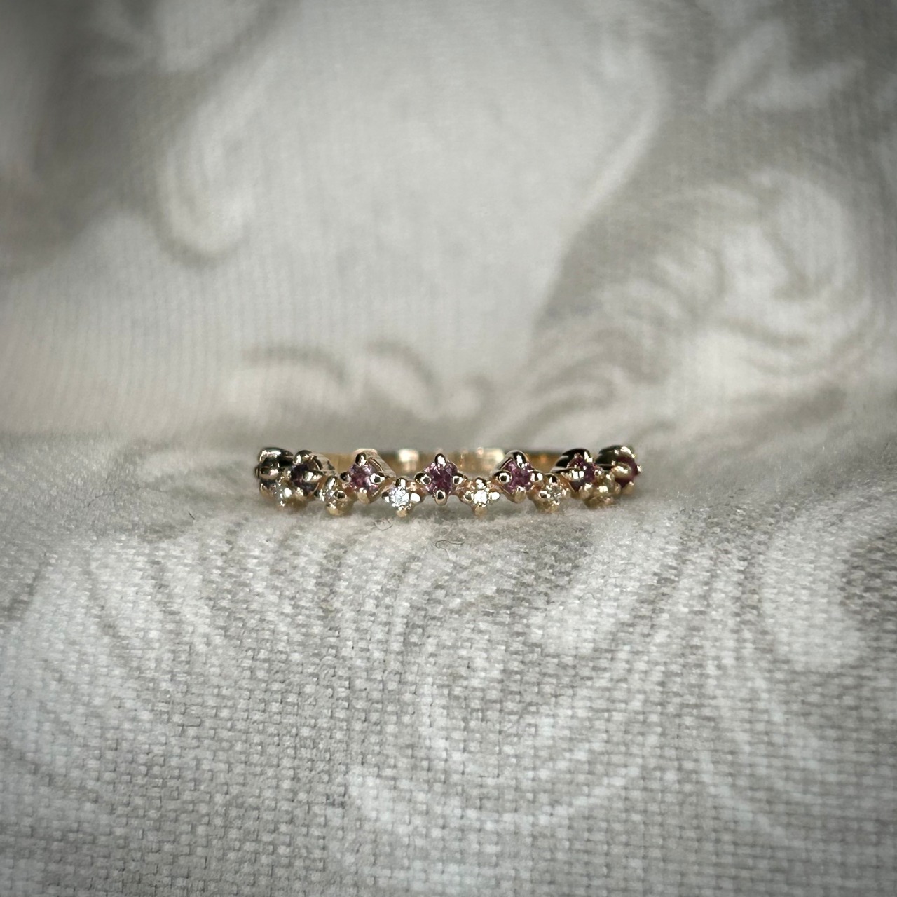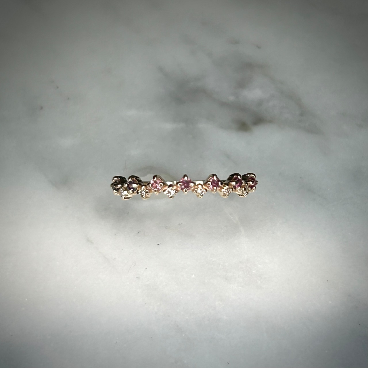 パープル~ピンクカラーのサファイアを使用し、色とりどりのサファイアが可愛い花の様で花灯(はなあかり)のように感じられます。