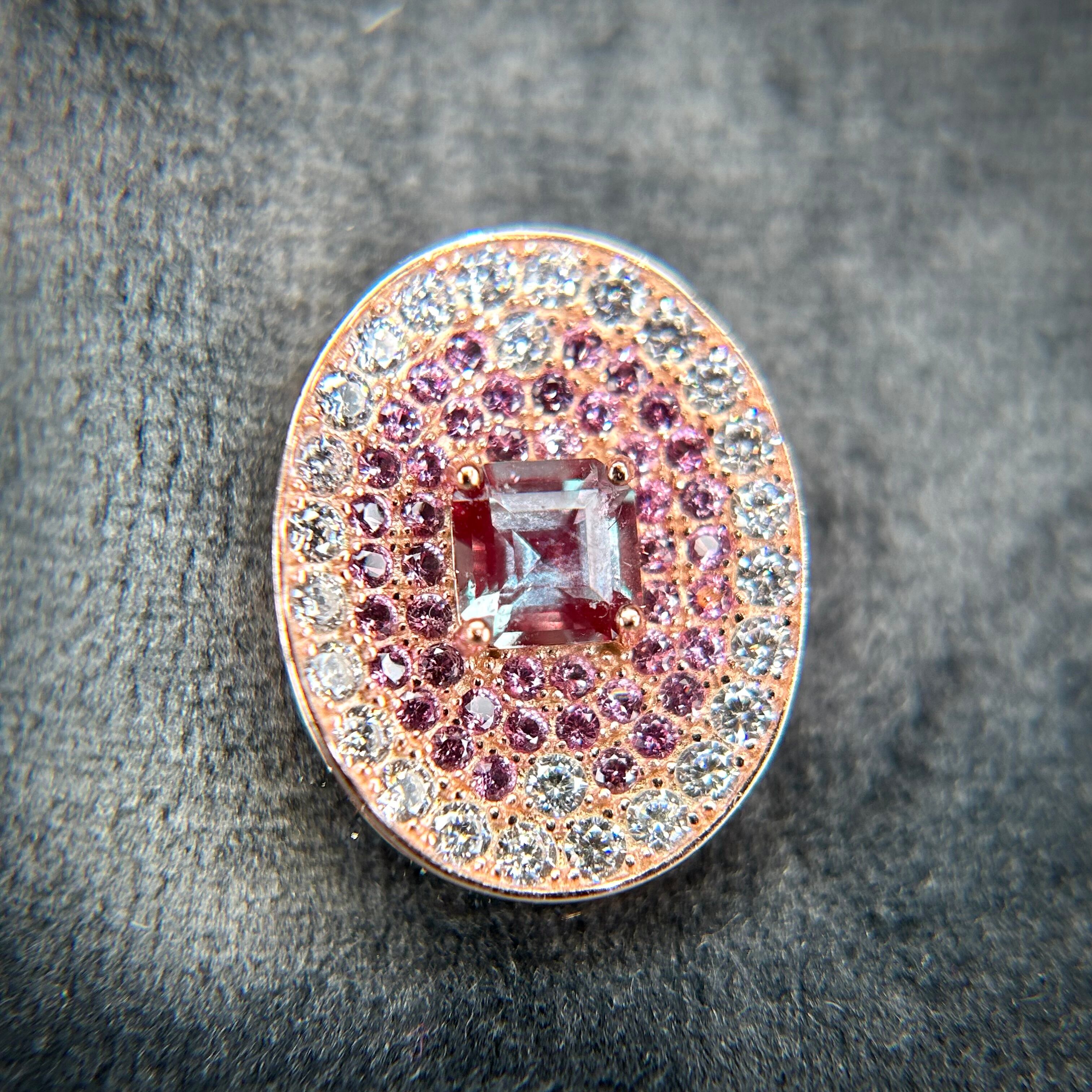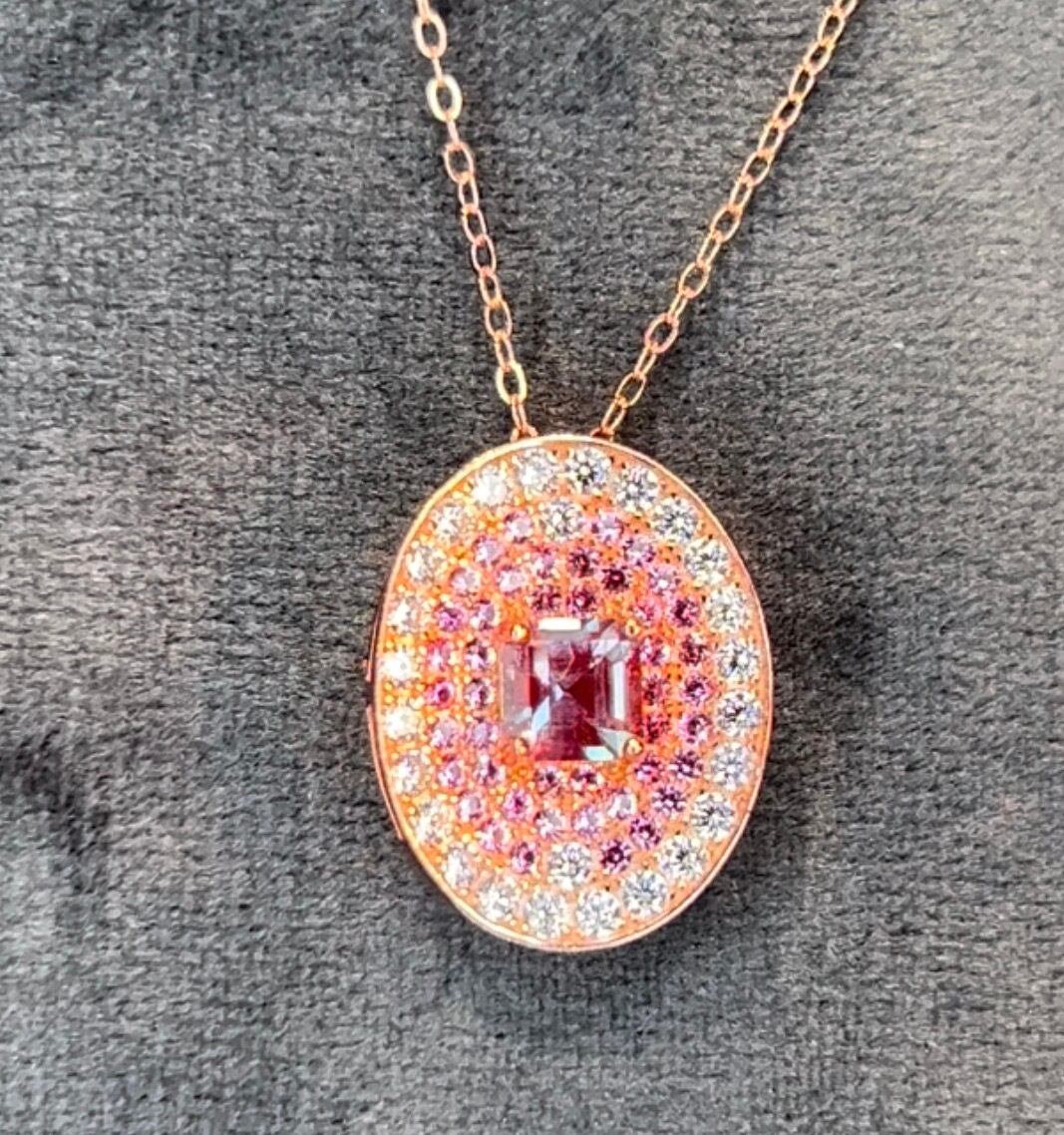 クリアとピンクの脇石に囲まれた合成アレキサンドライトが美しく、当たる光りでカラーチェンジが楽しめ、UVライトでは蛍光もする素敵なネックレスです。