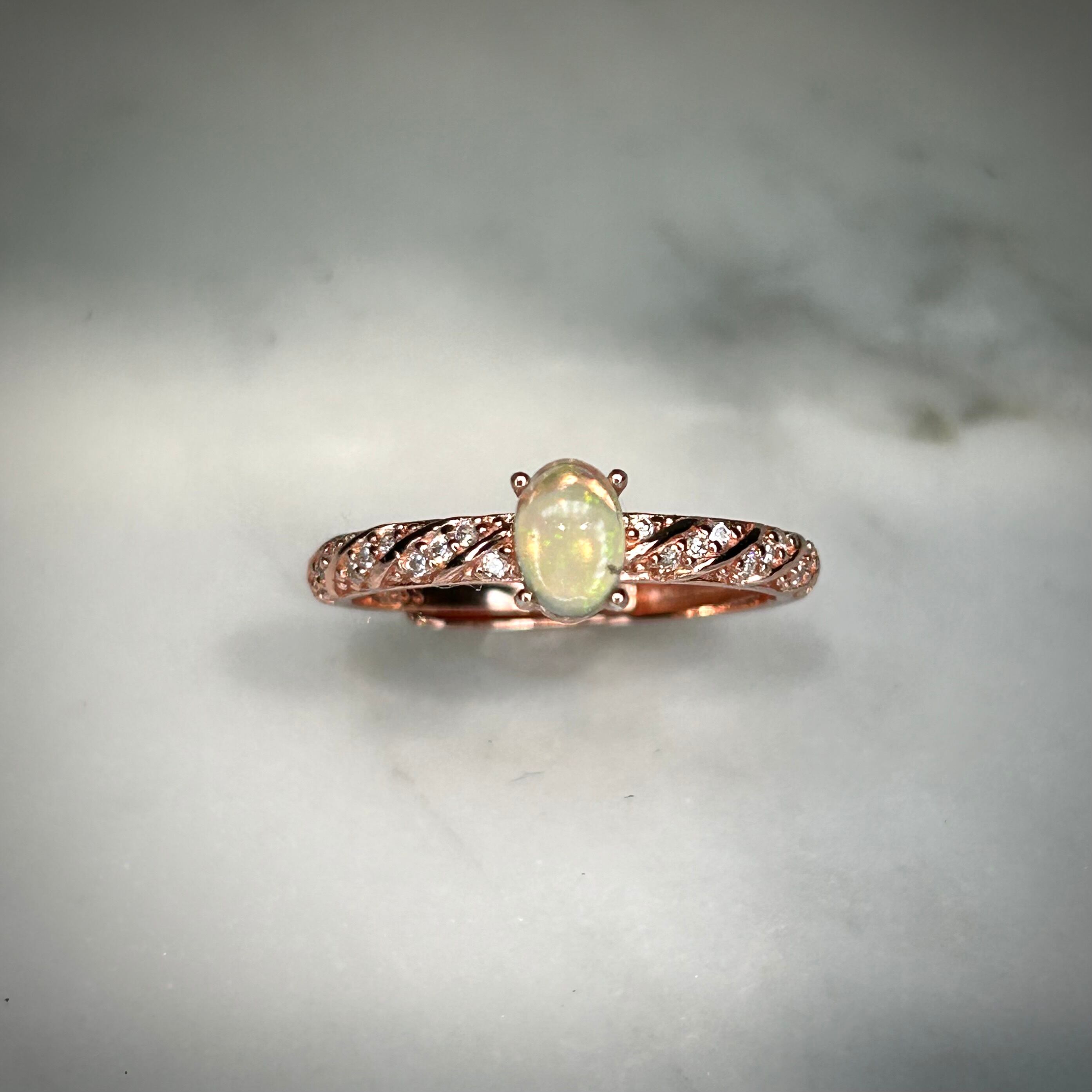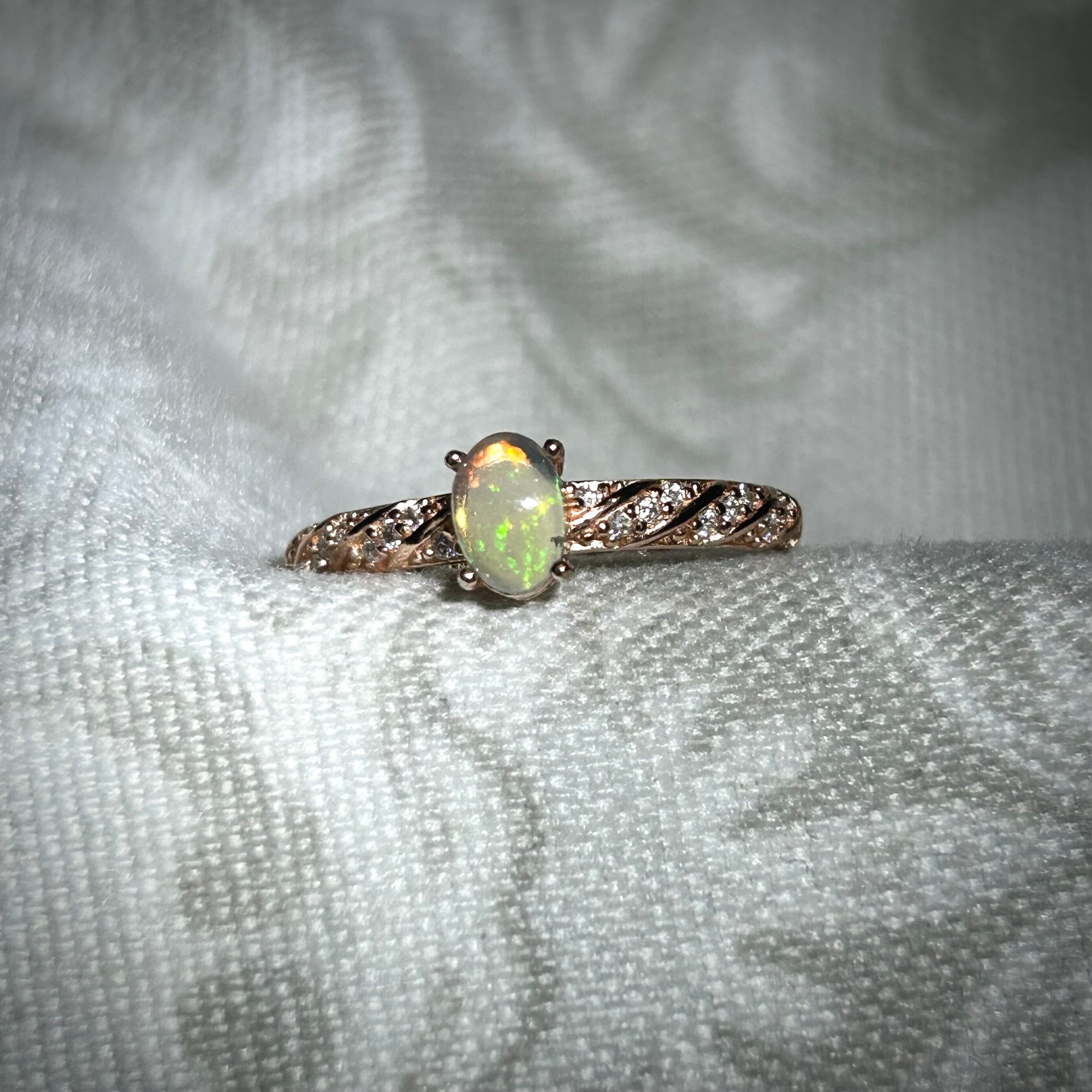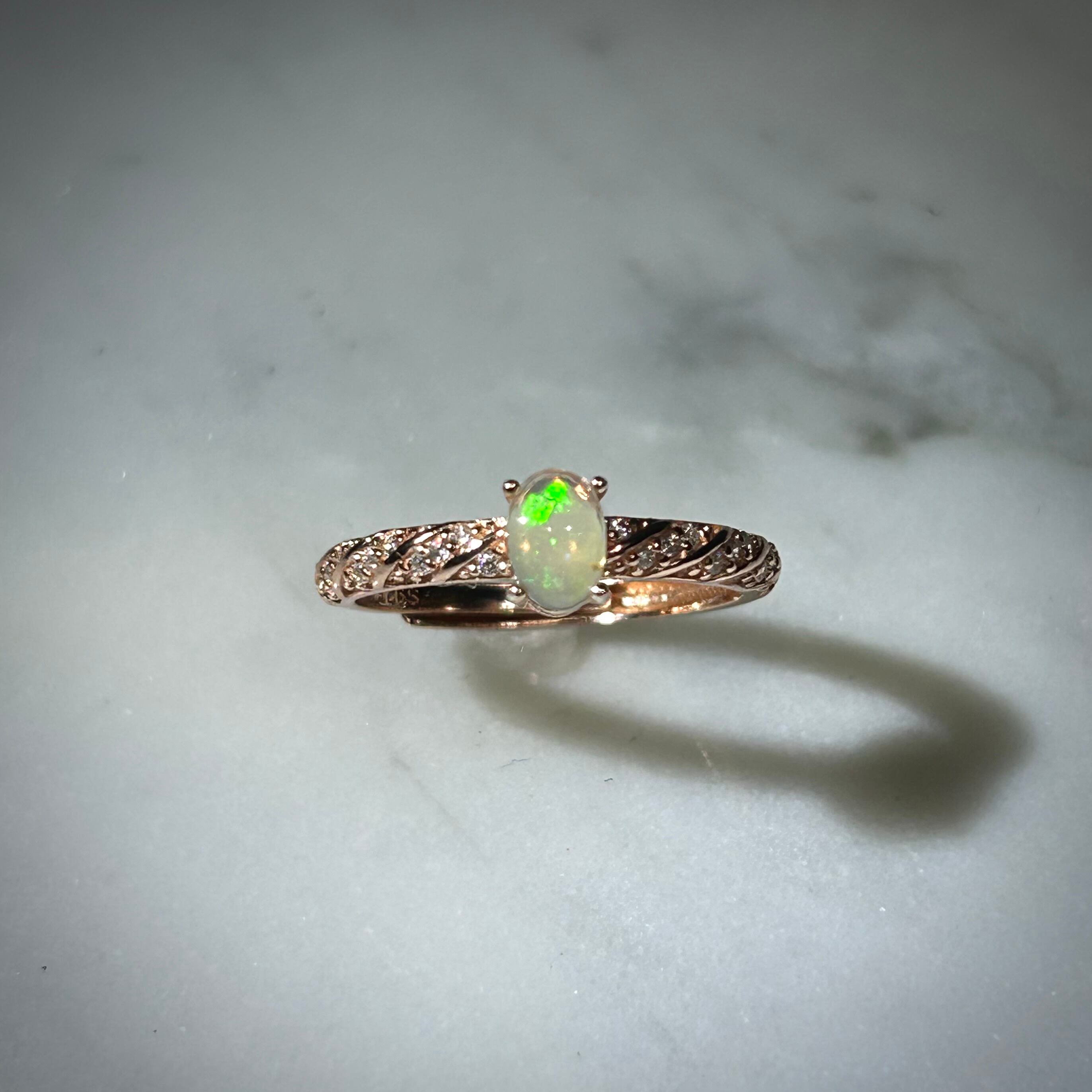 シルバー製ピンクゴールドカラー、オパールのスパイラルデザインリング。